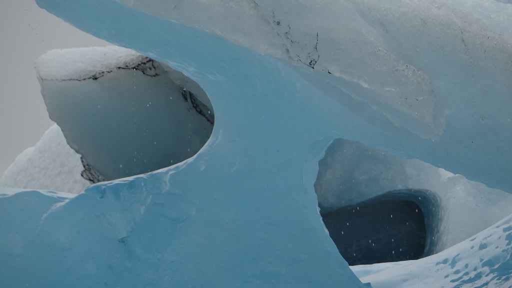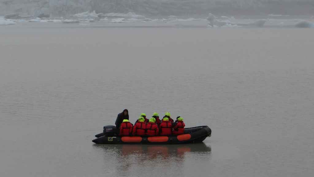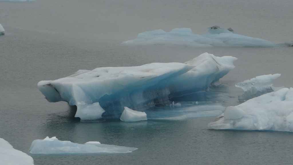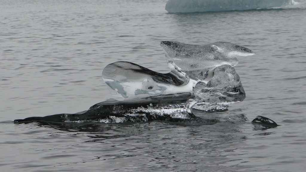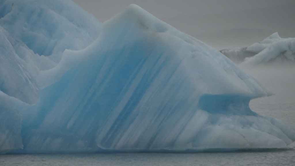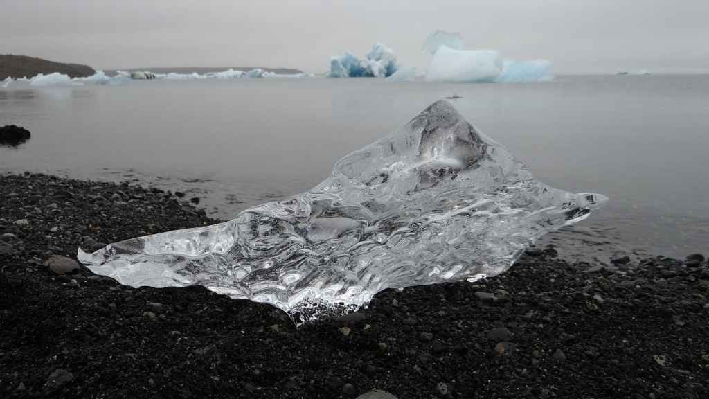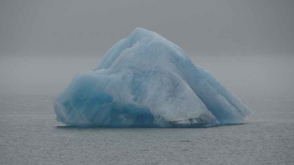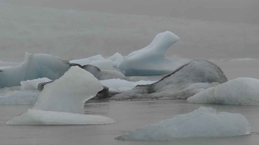 Contrairement au premier lac où nous apercevons la base du glacier, le second et le plus réputé, le Jokulsarlon est entouré de brume et de brouillard et donne une ambiance surréaliste au paysage… D’autant plus que quelques bateaux de touristes sillonnent et zig-zaguent autour des icebergs d’un bleu extraordinairement beau : on pourrait croire à une expédition Cousteau ! D’autres icebergs ressemblent à des morceaux de glace Vienetta, et d’autres encore sont d’une transparence cristalline. Nous restons longtemps, sous la bruine, à admirer ces sculptures somptueuses que nous offre la nature.