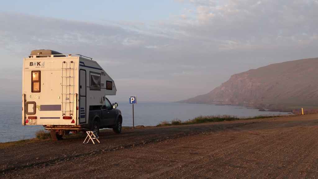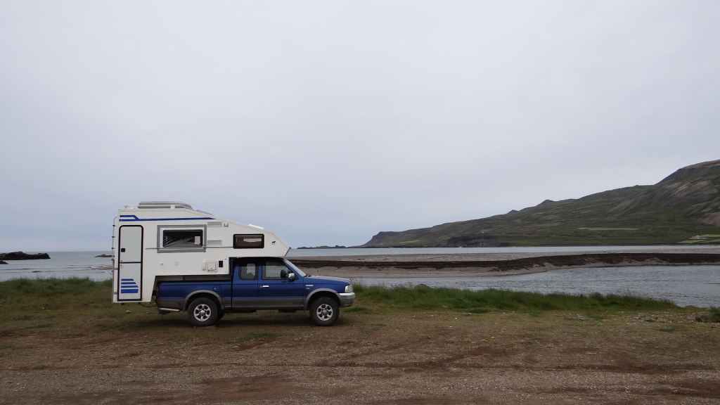 Nos amis partants vers l’est et nous vers l’ouest, on se sépare vers 9h00. Mais maintenant place aux réparations, en profitant du temps sec. On trouve un magasin de bricolage (Biko) où l’on trouve tout ce qu’il me faut pour refaire les fixations de la cellule (des 2 côtés) et boucher la fenêtre. Mr Leroy-Merlin n’a qu’a bien se tenir !!! Je commence mes travaux de perçage et de vissage vers 10h pour terminer vers 13h. Pour la fenêtre, on a trouvé de la nappe plastique transparente bien costaude. On la fixera le soir venu avec le gros scotch. Après le repas, nous repartons en direction de la péninsule de Vatneses où plusieurs colonies de phoques élisent domicile en été, mais leur observation sera pour demain.