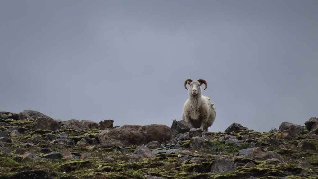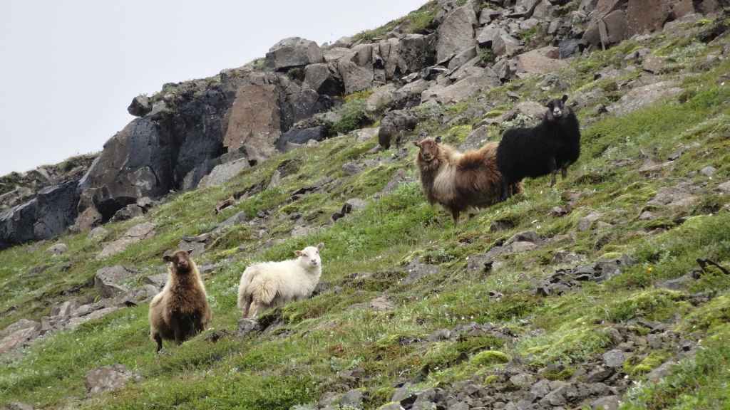 5h30 : nous sommes réveillés en sursaut avec, nous pensons, quelqu’un qui tape et qui secoue notre tortue !!! ce n’est finalement qu’une brebis qui se gratte le dos sur le bas de la cellule… Ouf ! 2ème réveil : bruine… seulement ! Nous repartons sur la N1 en direction du village de Djupivogur. Le Lonely Planet en fait quelques éloges mais bon, rien d’exceptionnel : 2 vieilles maisons, un petit port, une collection de gros œufs en pierres pour chaque type d’oiseau de la région, et un collectionneur d’objets divers récupérés sur les plages : original et sympathique !