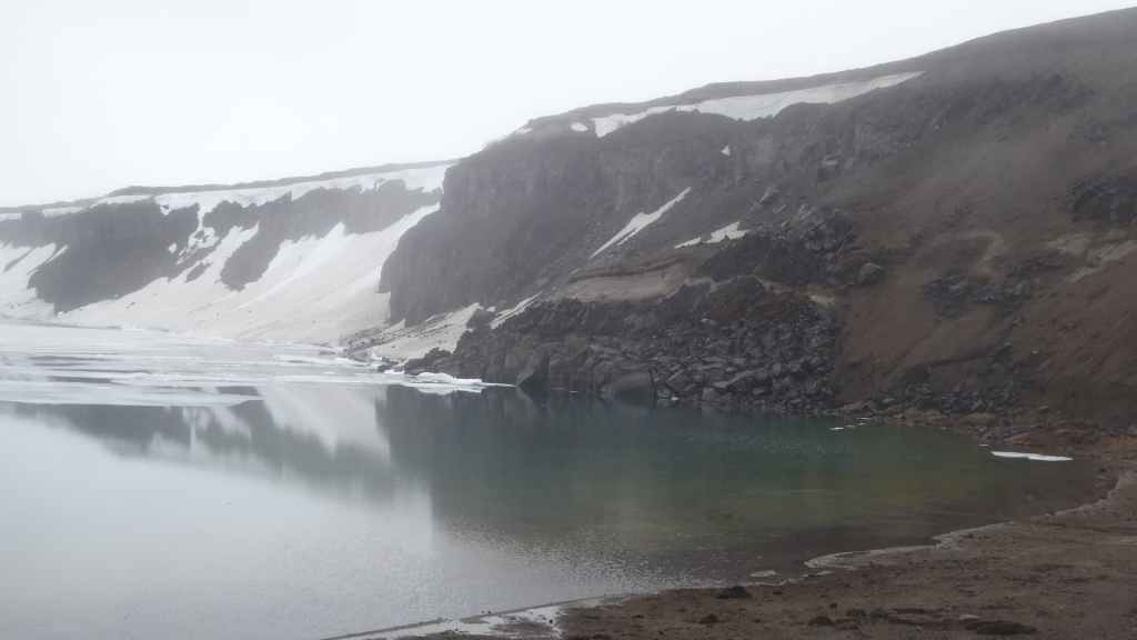 Nous partons pour une balade de 5 km pour voir les lacs de cratère. Nous nous retrouvons 6 mois en arrière en plein hiver à marcher dans la neige. Nous commençons par le cratère du Viti et son eau bleu turquoise qui dégage des odeurs de soufre. Derrière lui un autre lac, beaucoup plus grand est encore, en partie, recouvert de glace ! Ses rives sont faites de roches volcaniques de couleurs très vives et variées.