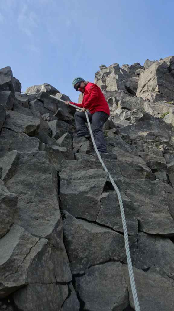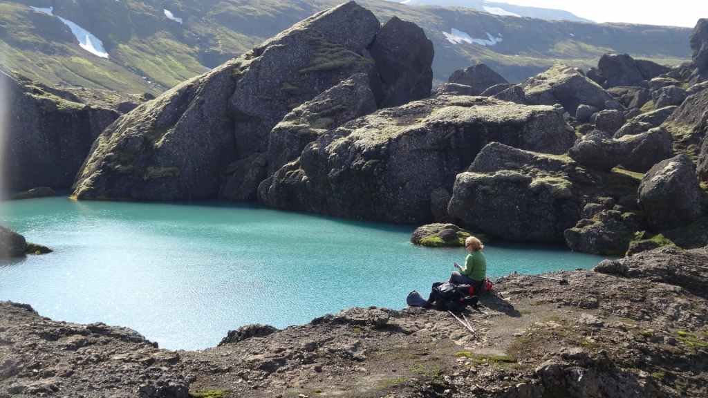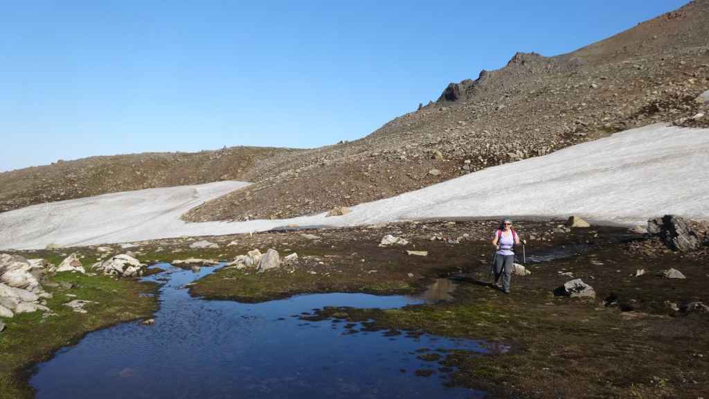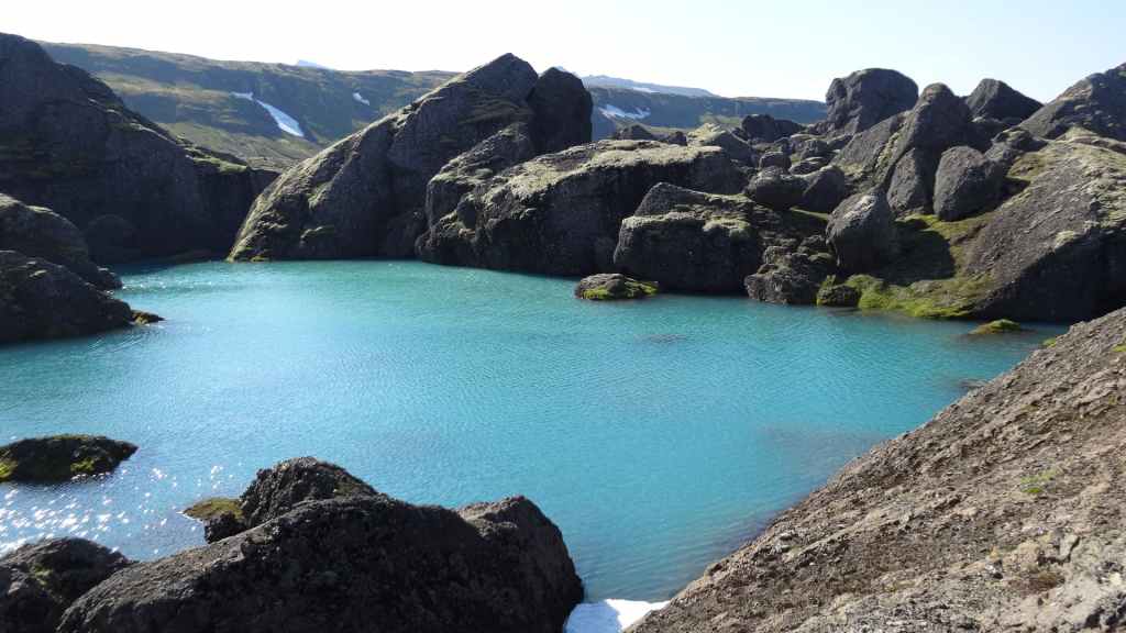 Nous gagnons donc le col où nous commençons notre randonnée. Nous avons préparé nos sacs au lever, et sitôt arrivés, sitôt partis pour une bonne grimpette. On longe quelques lacs dont un encore à moitié gelé : il faut dire que nous sommes à environ 600 m d’altitude ! Puis, nous arrivons en vue de cette énorme brèche creusée au milieu de grand rocs noirs, avec, au pied de l’un d’entre eux, les vestiges d’un glacier. Ça ressemble un peu à la brèche de Roland dans le cirque de Gavarnie. C’est grandiose, d’autant plus que le glacier a laissé d’énormes bloc sur son chemin et un petit lac tout bleu coincé des blocs, parfois d’une hauteur de 20 m. Après avoir traversé un petit torrent pied nus, nous pique-niquons au bord de ce lac.