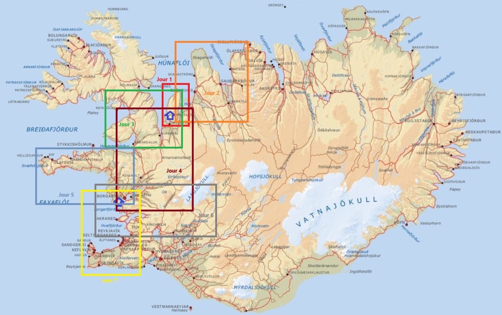 À noter que les pistes intérieures, les routes F, sont fermées l’hiver. Nous effectuerons une moyenne de 300 km par jour. Ci-dessous les zones que nous allons visiter.