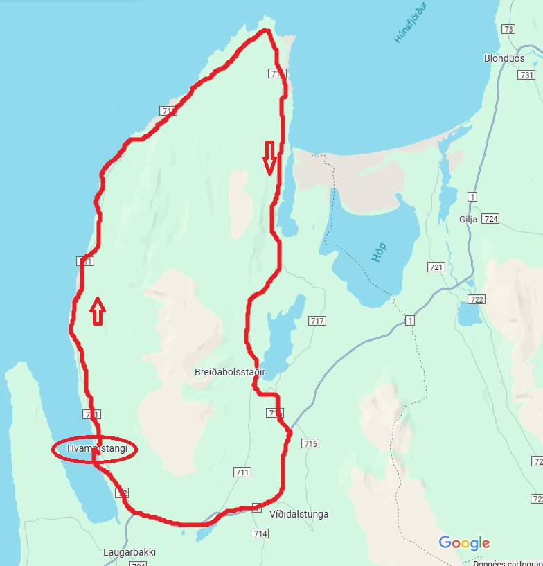 Le long retour passera par la N61 pour rejoindre la N68 et le Steingrimsfjordur situé à l’est, en face de la petite ville de Drangsnes. Cette route rejoint la N1 bien au sud en contournant deux fjords dont les sorties se font par des rampes bien raides aisément franchies par notre Duster.