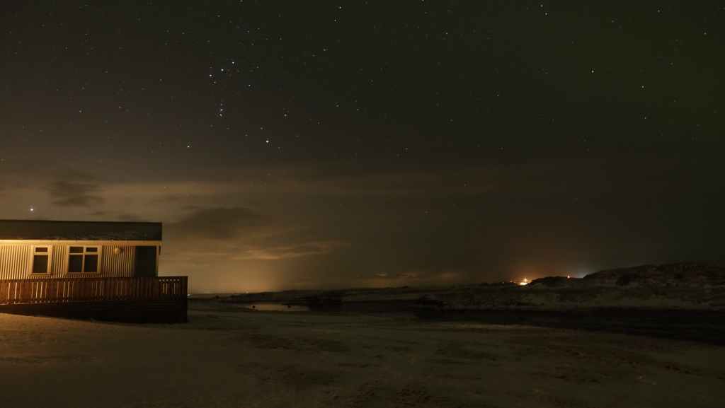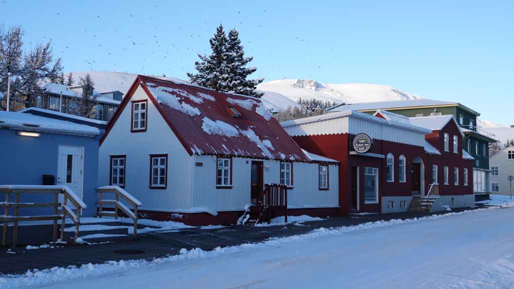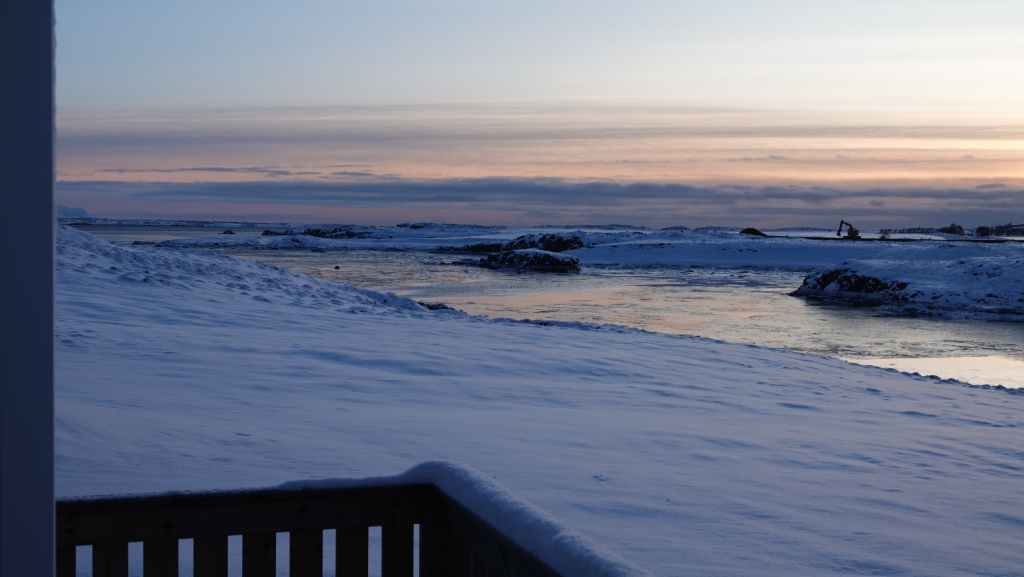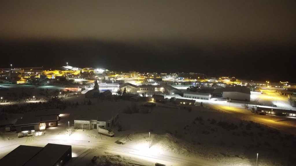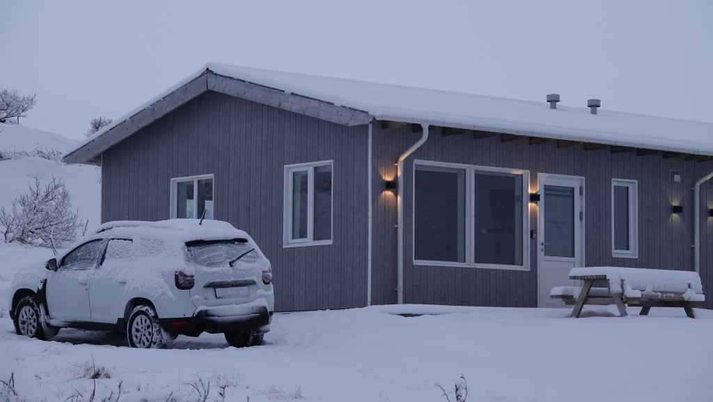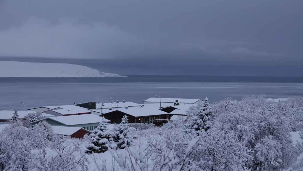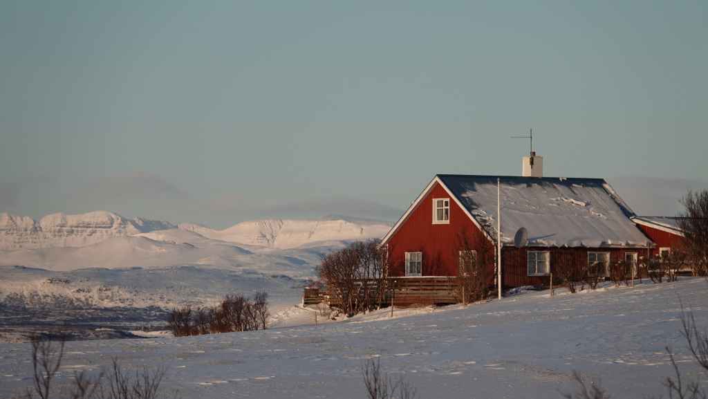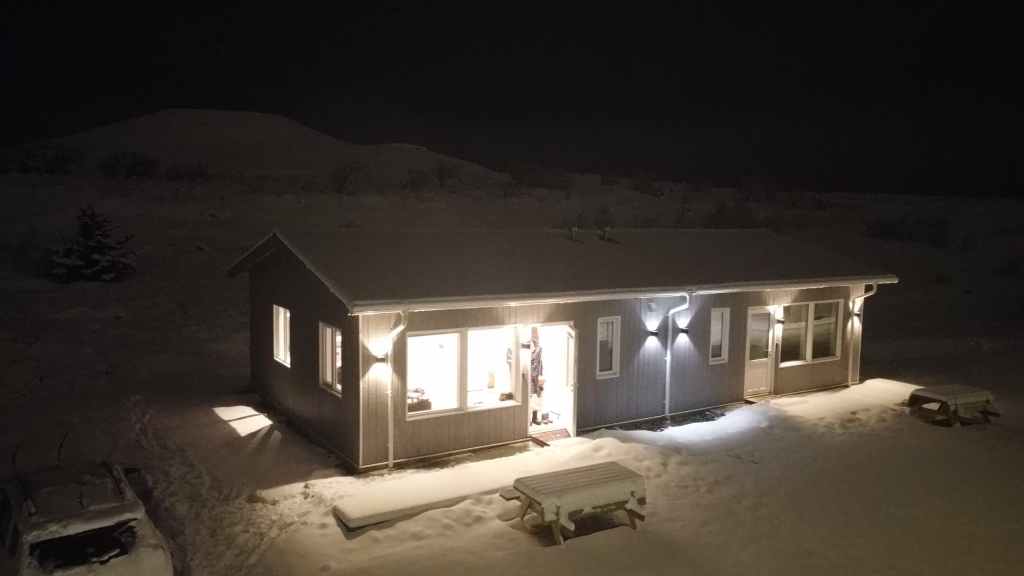Nous avons 250 km à parcourir vers le nord sur la route circulaire, la N1 (la route qui fait le tour de l’île). On trouve un supermarché pour les premiers jours et c’est parti. Il est 18h00 et il fait désormais nuit noire. Nous longeons d’abord les côtes en contournant la capitale Reykjavik puis entrons dans les terres où le vent souffle en tempête. D’ailleurs, au passage d’un « col », je dois stopper la voiture brusquement parce que la visibilité est devenue nulle en l’espace d’une seconde ! Je repars lentement jusqu’à ce que nous puissions à nouveau deviner la route, pourtant très bien délimitée par de hauts poteaux réfléchissants. On arrive à Hvammtangi vers 21h00 et on monte vers notre demi-maison située dans les hauteurs du village : les 4 roues motrices sont bien utiles. La construction est récente et l’appartement de 50 m2 avec chambre est nickel mais surchauffé ! La journée a été longue et fatigante et on est content de s’allonger dans notre lit confortable.