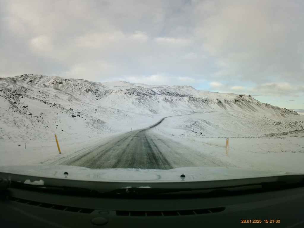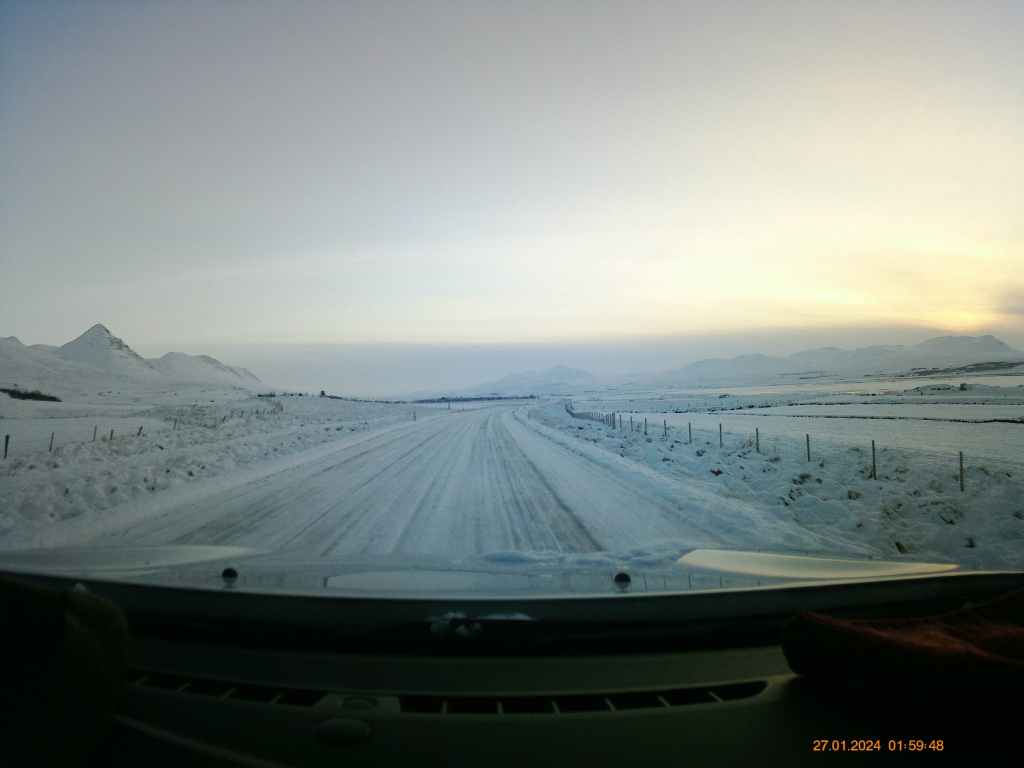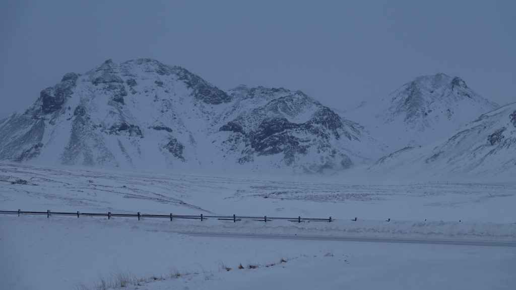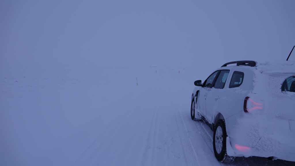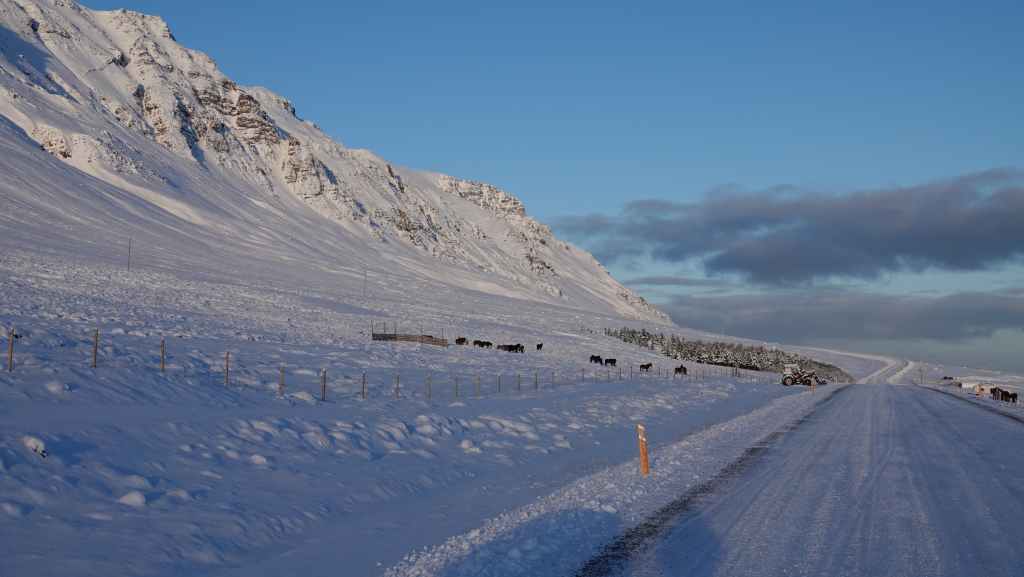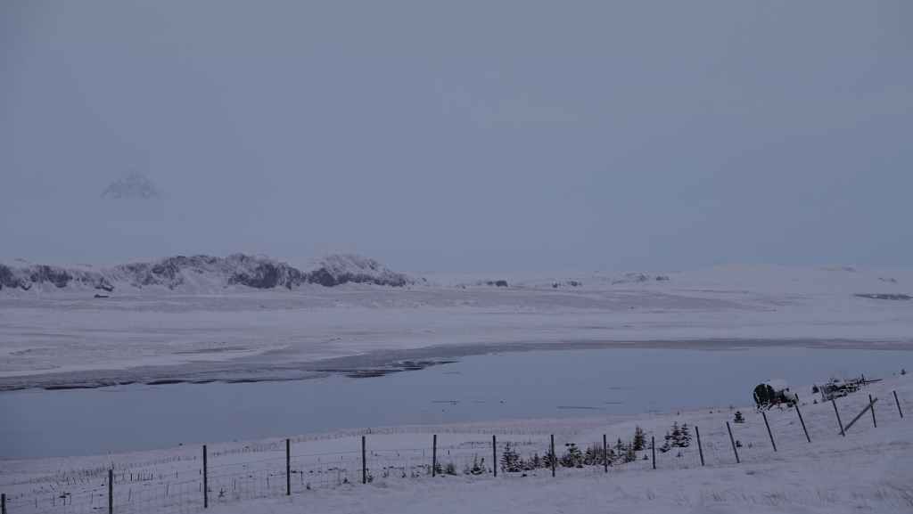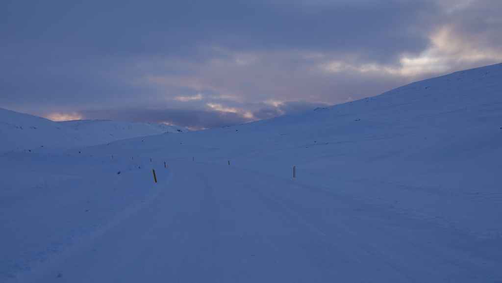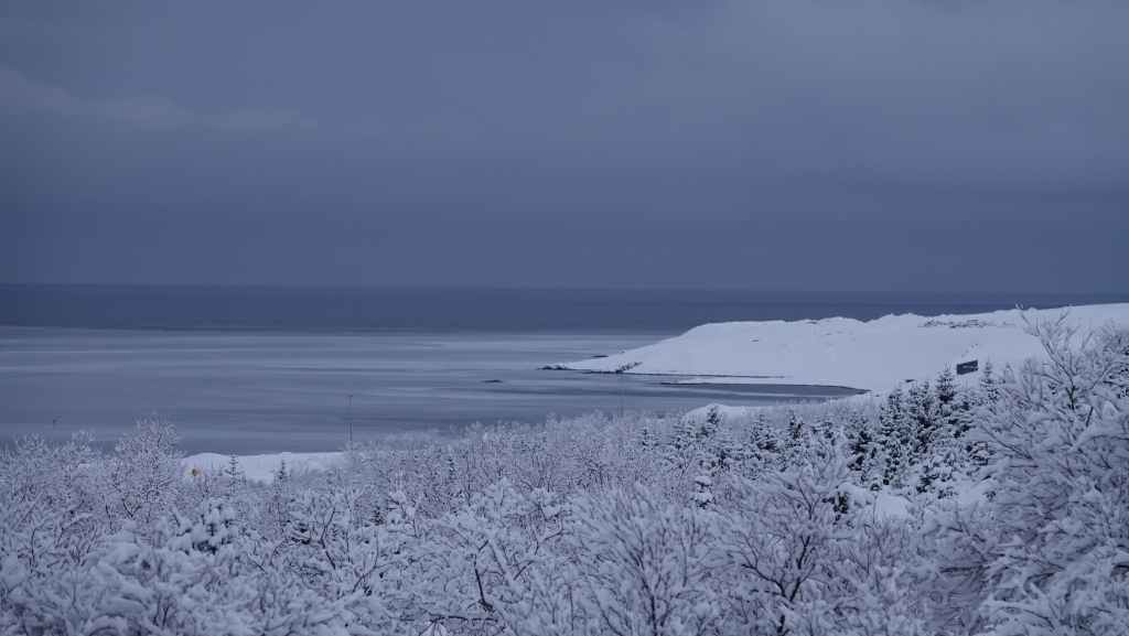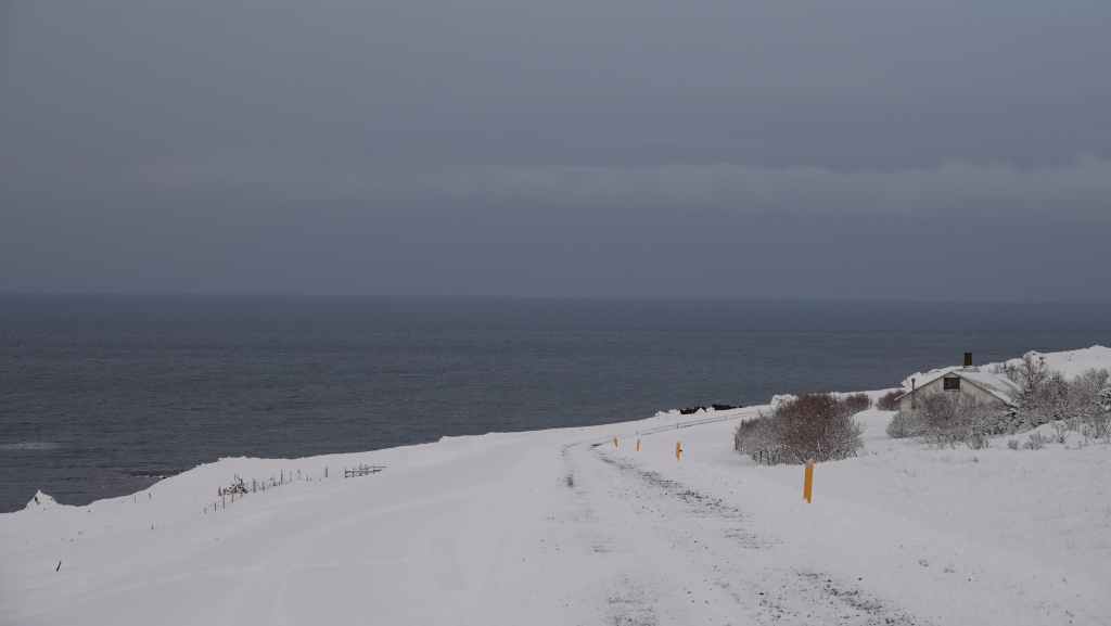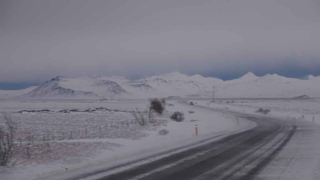 Nous partons donc vers le sud jusqu’à l’entrée de la capitale pour prendre la route N36 puis la N361. La météo n’est pas des plus paisible avec pas mal de vent et quelques chutes de neige en revenant à l’intérieur des terres. Les routes sont ici beaucoup plus fréquentées par les touristes en bus ou en voitures, dont certains, non habitués à conduire sur la neige, roulent au pas, contrairement aux locaux qui eux, nous doublent sans aucune hésitation !