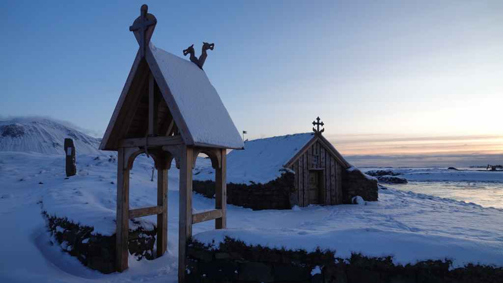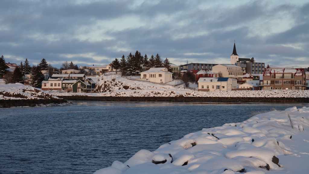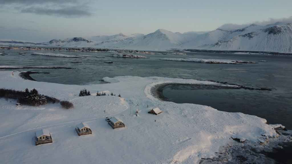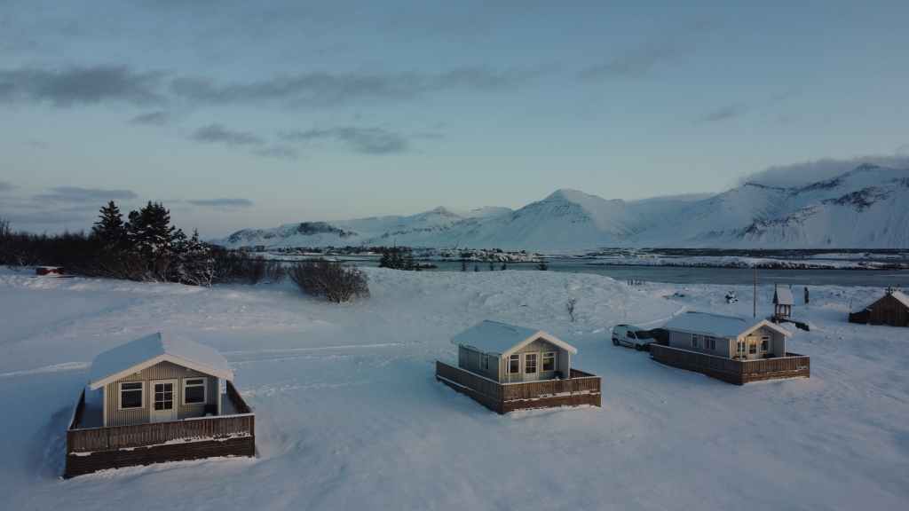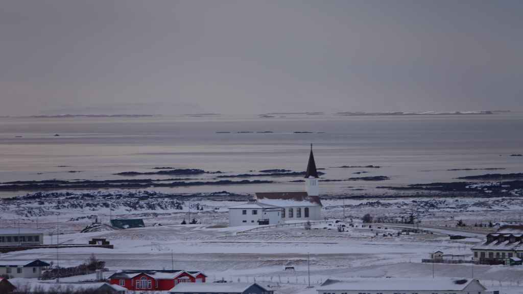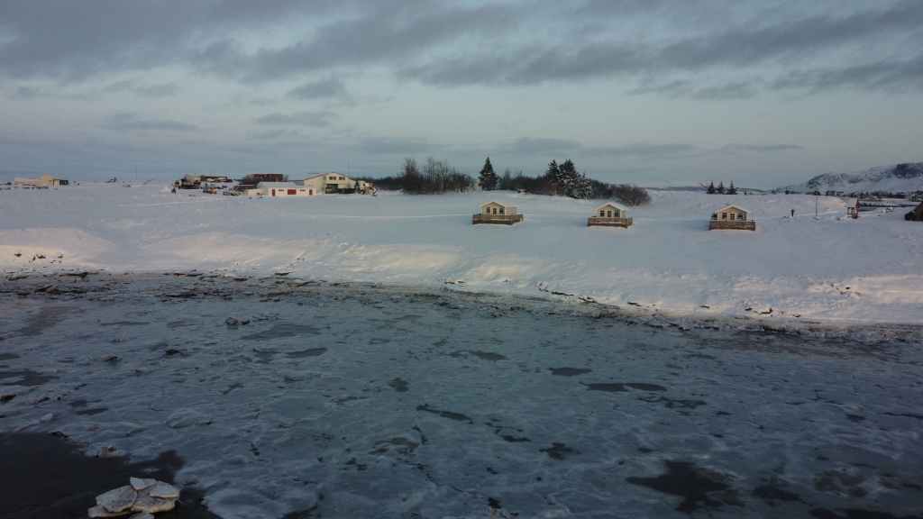 On continue vers Husafell et le bout de la vallée. La route fait une petite boucle pour revenir vers la N50. On rejoint la ville de Borgarnes et son port. Quelques photos et nous rejoignons notre nouveau logement, une petite cabane parmi 3 autres avec une jolie vue sur l’eau gelée du minuscule fjord. Il y a également une petite chapelle en bois d’origine viking.