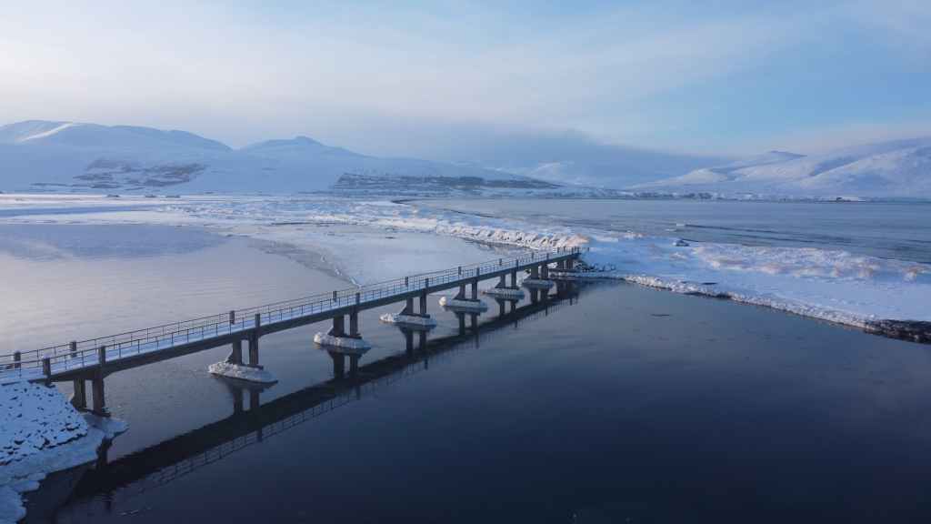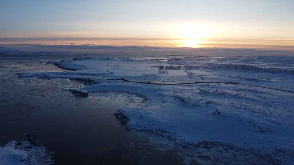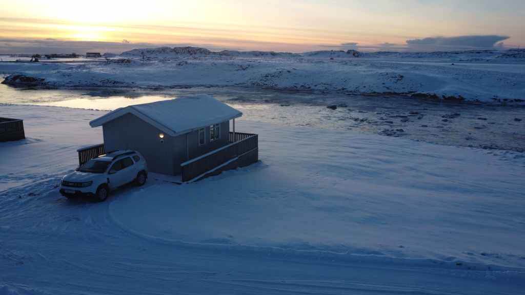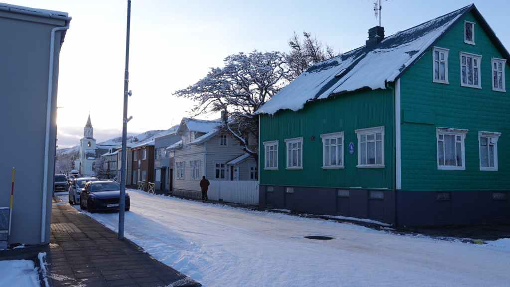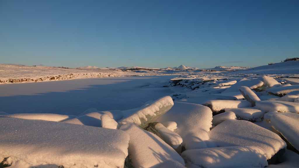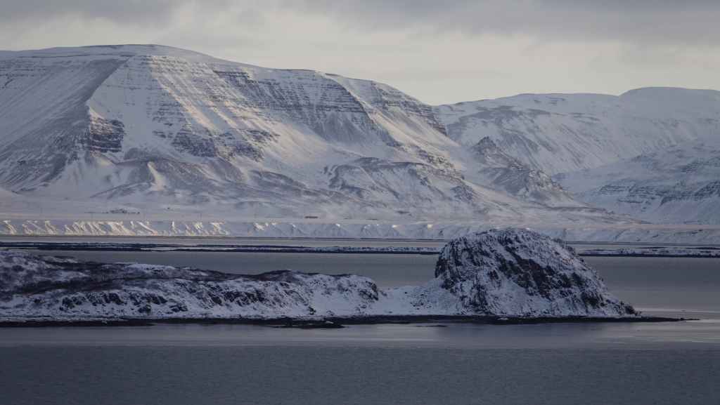 On continue vers Husafell et le bout de la vallée. La route fait une petite boucle pour revenir vers la N50. On rejoint la ville de Borgarnes et son port. Quelques photos et nous rejoignons notre nouveau logement, une petite cabane parmi 3 autres avec une jolie vue sur l’eau gelée du minuscule fjord. Il y a également une petite chapelle en bois d’origine viking.