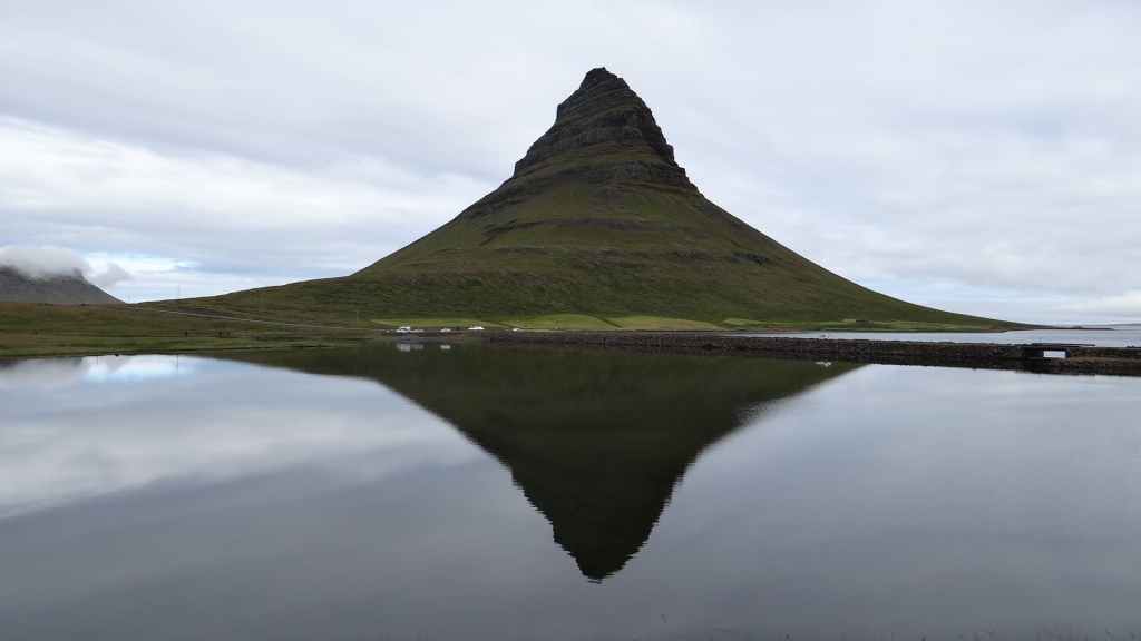 On reprend la route en direction d’Arnarstapi mais on découvre que la route est fermée au-delà. Les conditions météo se dégradant, alors on fait demi-tour pour rejoindre la côte nord de la péninsule. Il faut franchir un col bien venté mais ça passe facilement… On arrive à Grundafjordur sous la neige pour revoir le très connu Kirkjufell. Mais la visibilité est quasiment nulle et on ne voit que la base de la montagne… dont j’ai joint la photo faite en 2015.
