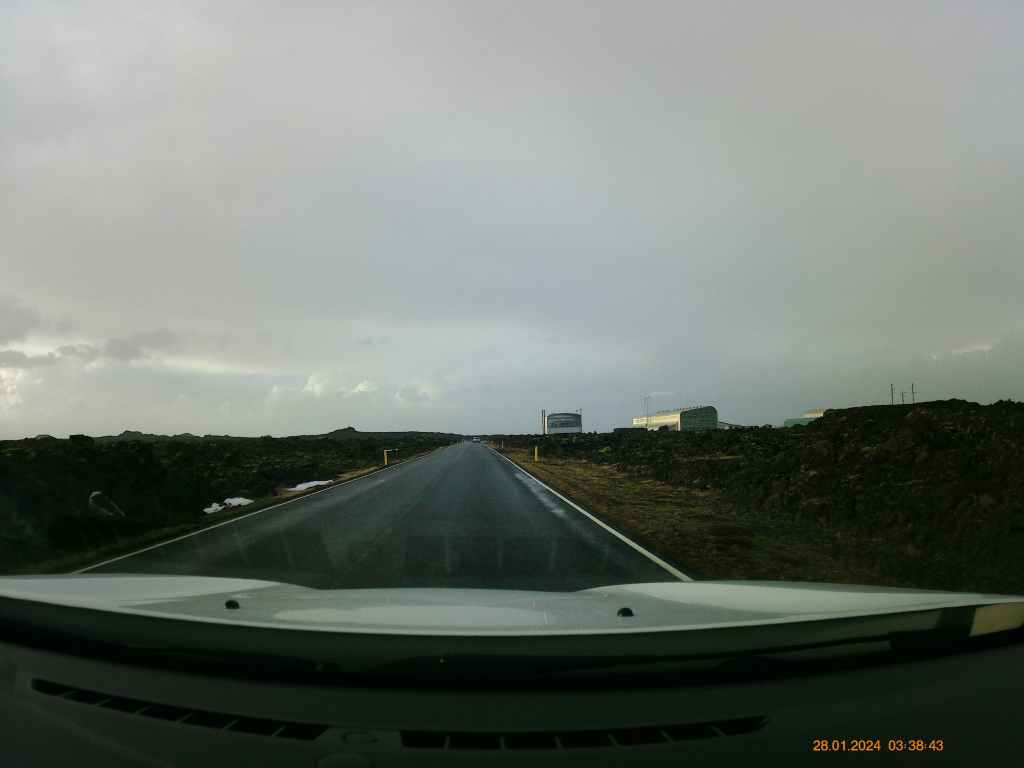 On dépasse la capitale pour rejoindre Grindavik où le réveil d’un volcan a envahi une partie de la ville et la menace toujours bien qu’il soit, malheureusement pour nous, en pause en ce moment. En effet, la faille crache sa lave depuis fin 2023 pendant 15 jours puis se met en pause pendant 2 mois et ça fait donc plus d’un an que cela dure. La route 43 qui mène a Grindavik a du être détournée par endroit, et celle-ci est bordée de lave noircie et dure mais qui fume encore, bien que la dernière éruption date du 8 décembre 2024. Un gigantesque chantier est encours pour construire une digue géante sensée dévier les futures coulées de lave.