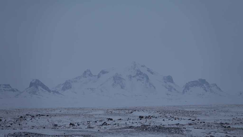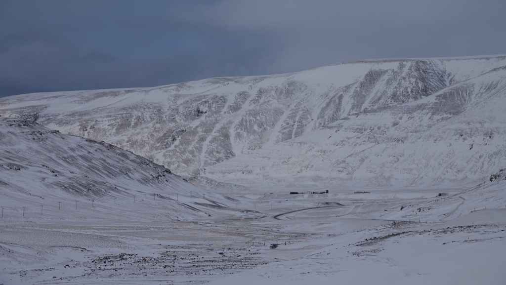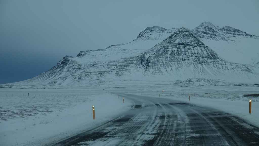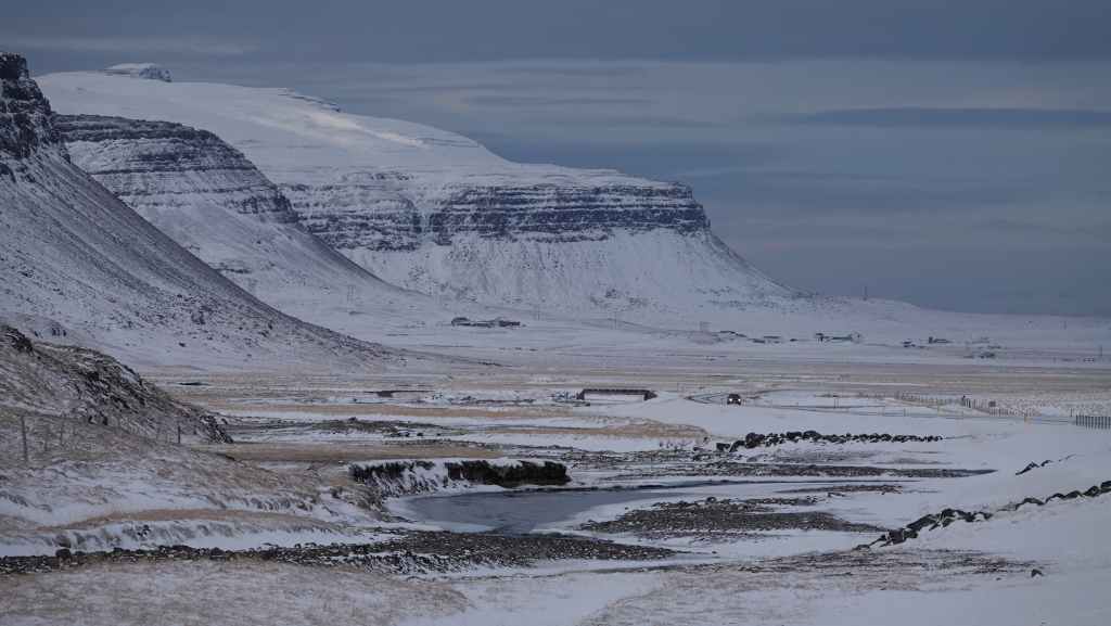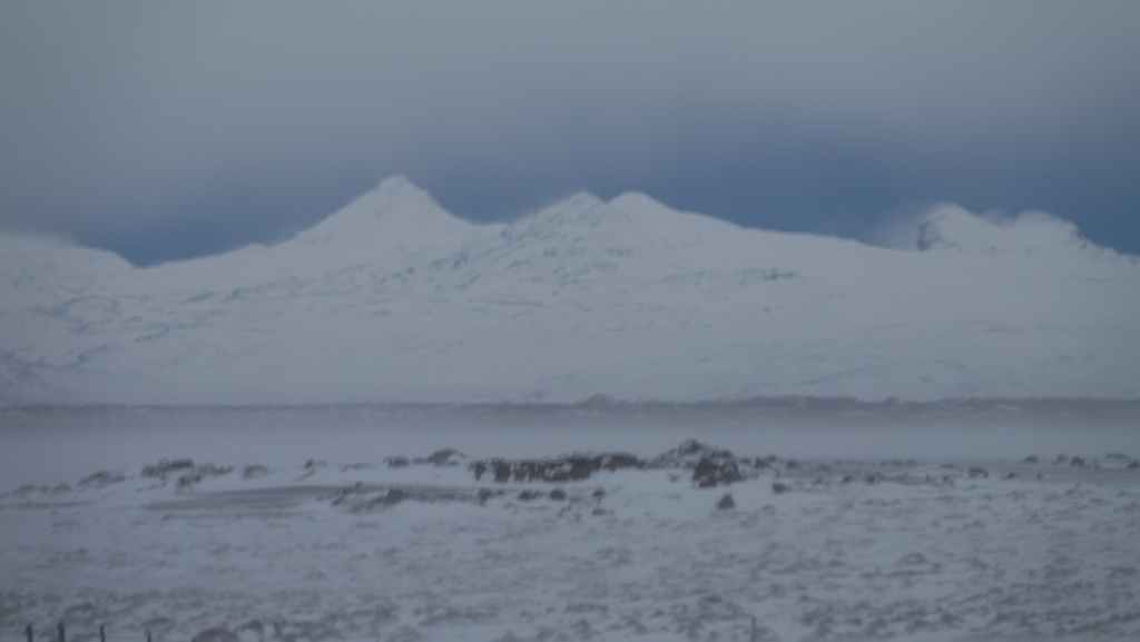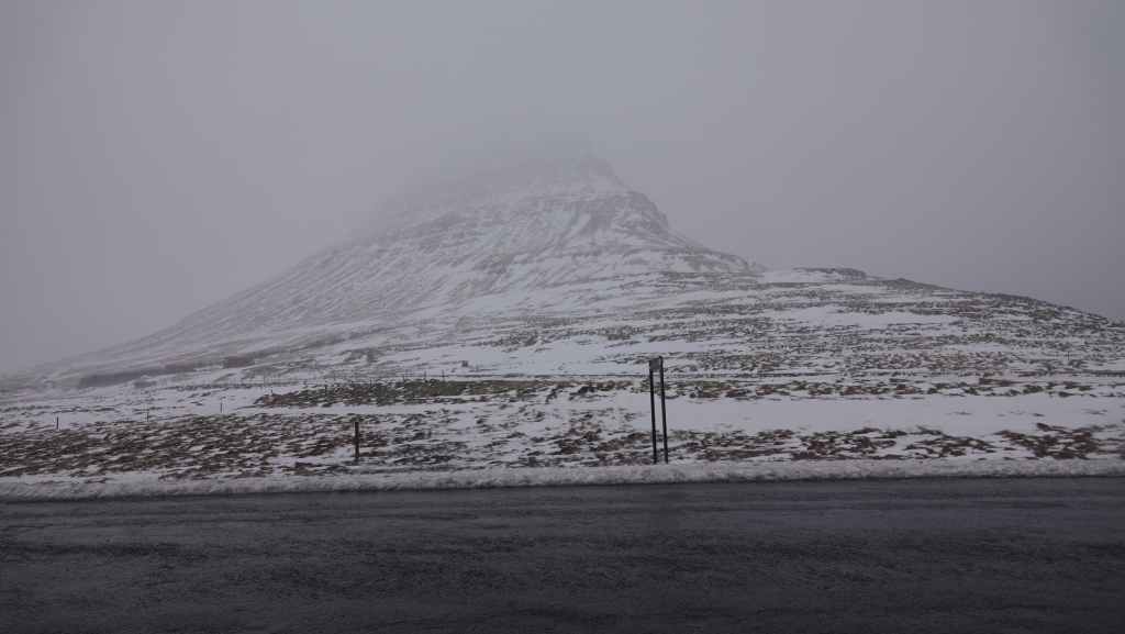 C’est reparti pour de nouvelles aventures en direction de la célèbre péninsule de Snaefellsnes, dominée tout à l’ouest par le non moins célèbre volcan Snaefellsjökull mis en lumière par J. Verne dans son « voyage au centre de la Terre ». Nous y étions venu en 2015. Mais aujourd’hui, la météo n’est pas au beau temps : les nuages sont bas, il y a du vent et il neige un peu… On prend donc la N54 vers le nord.