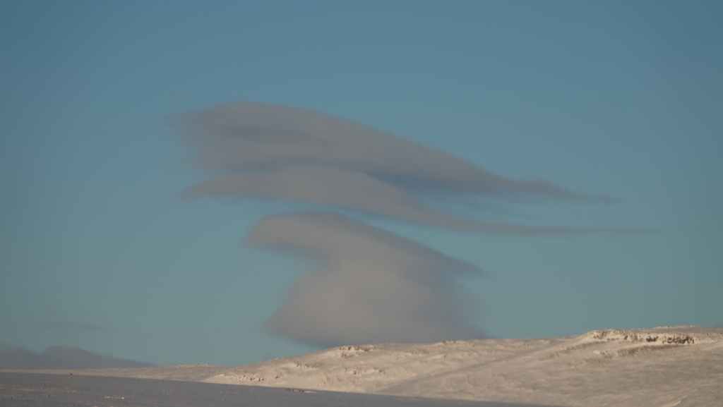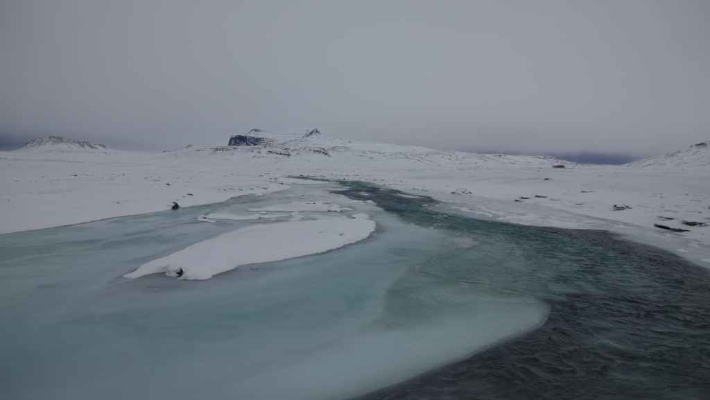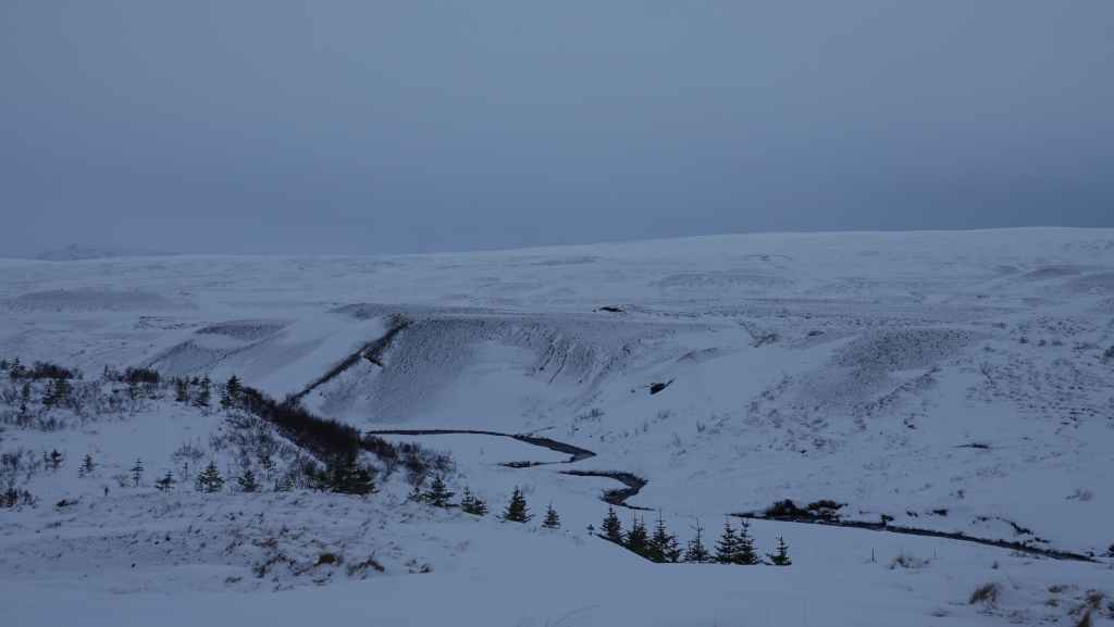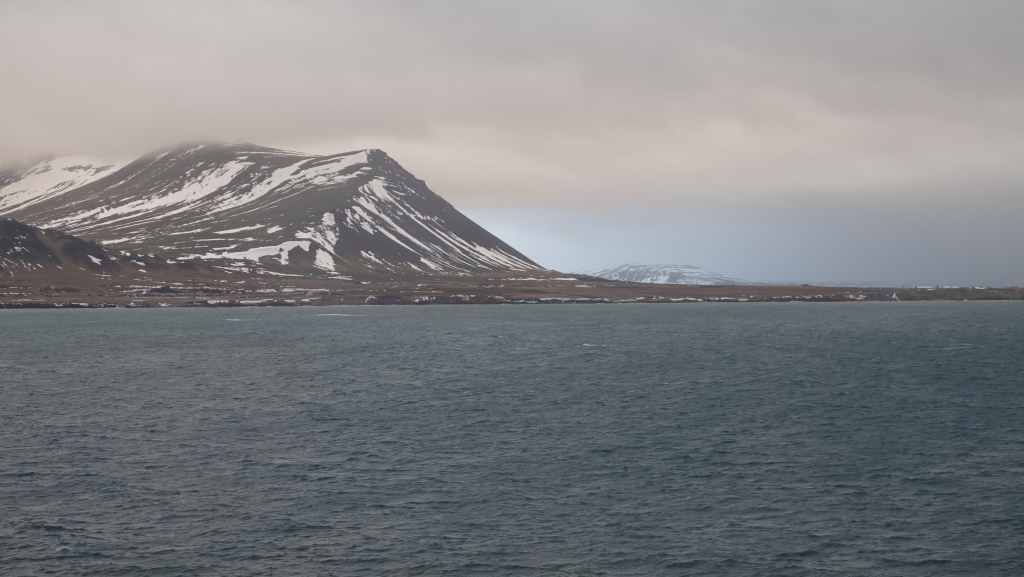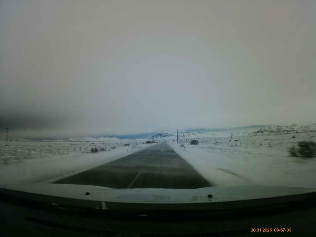 C’est reparti pour de nouvelles aventures en direction de la célèbre péninsule de Snaefellsnes, dominée tout à l’ouest par le non moins célèbre volcan Snaefellsjökull mis en lumière par J. Verne dans son « voyage au centre de la Terre ». Nous y étions venu en 2015. Mais aujourd’hui, la météo n’est pas au beau temps : les nuages sont bas, il y a du vent et il neige un peu… On prend donc la N54 vers le nord.