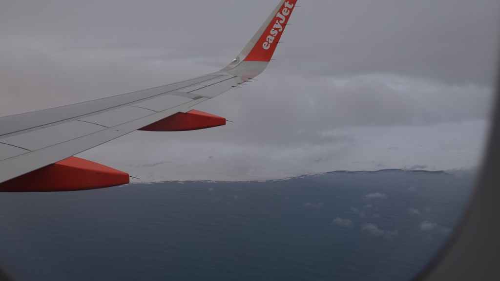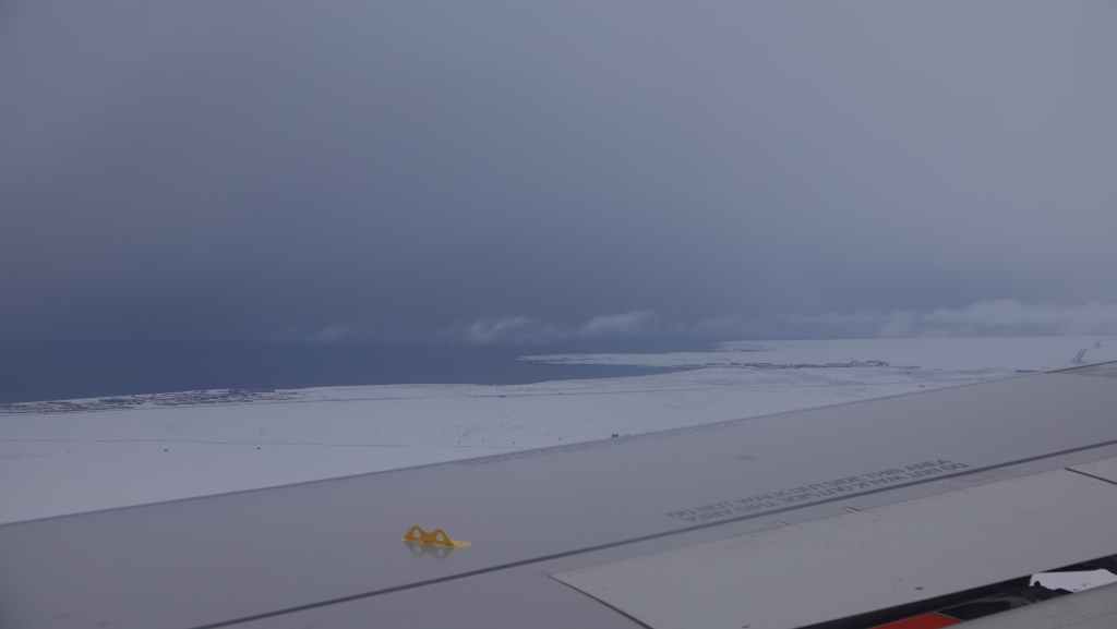 Nous quittons Auxerre, où nous avons passé la nuit, en direction d’Orly, notre avion décollant à 13h40. L’horaire est respecté et l’on transperce l’épaisse couche de nuages pour nous retrouver au soleil à environ 11000 m d’altitude. On survole les Highlands écossaises enneigées puis l’Atlantique nord. Vers 16h00 heure locale (+ 1 heure), on atteint les côtes islandaises avant d’atterrir à l’aéroport de Keflavik avec près d’une 1/2 heure d’avance. La neige tant espérée est bien là, et tombe à gros flocons.