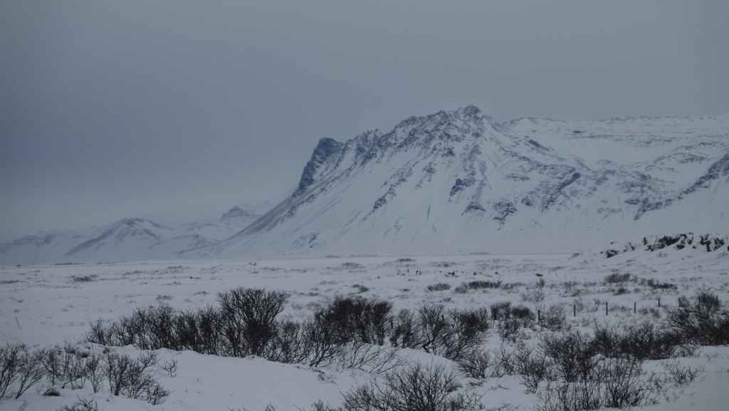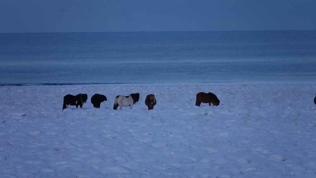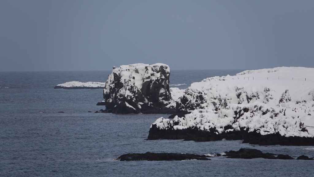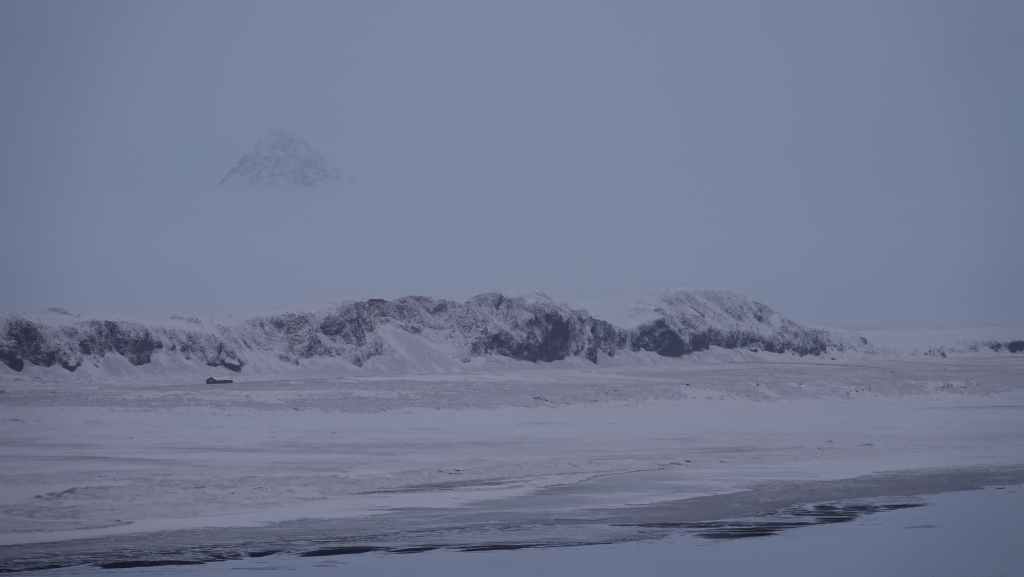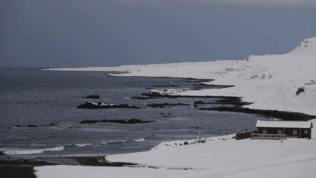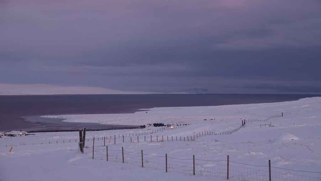 Nous nous arrêtons en cours de route à Illugastadir Stapar, une plage où il est possible d’observer des phoques, mais à part 3 jeunes parisiens et un bécasseau violet, il n’y a aucun phoque. Nous poursuivons donc notre itinéraire. On fait quelques arrêts « photo » : les paysages blancs sur le fond gris du ciel et de l’océan sont magnifiques… On redescend par l’ouest de la péninsule. Nous sommes passés par là il y a dix ans mais, avec la neige, nous avons du mal à reconnaitre les lieux. Nous arrivons de nuit à la maison…
