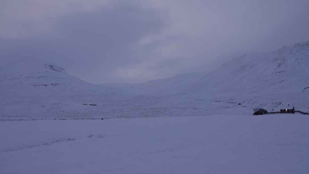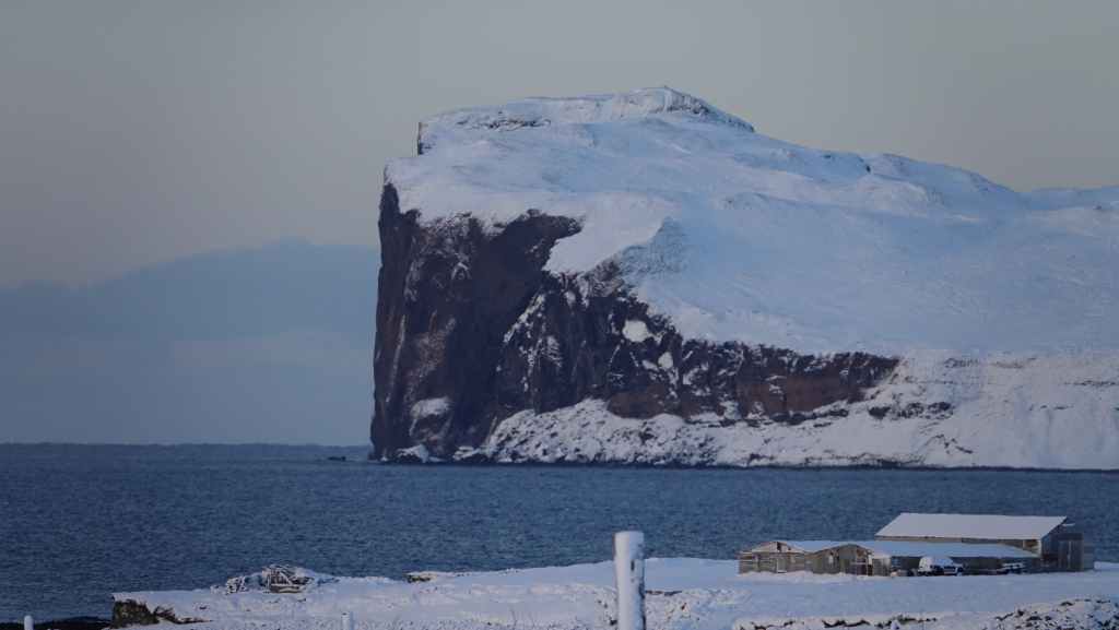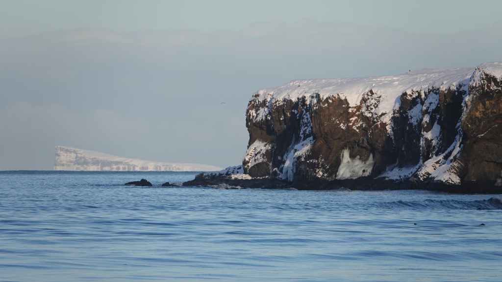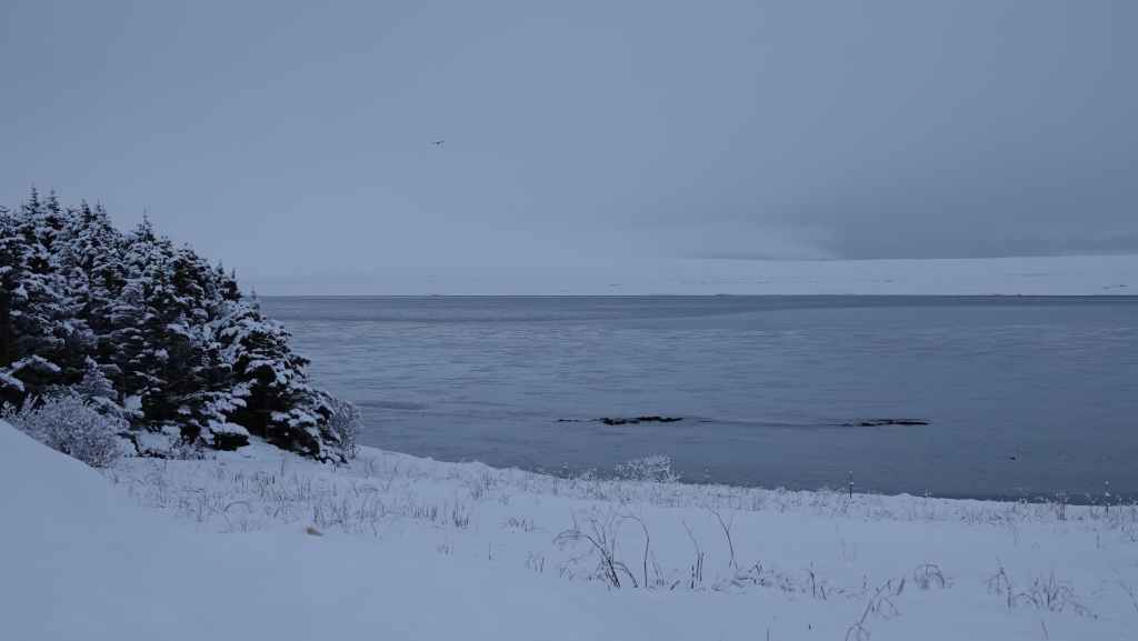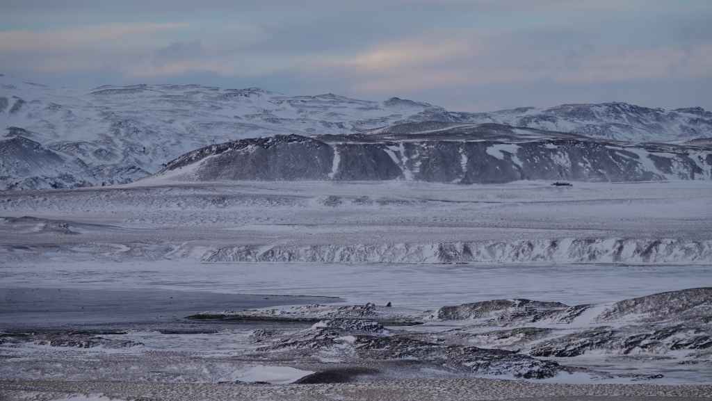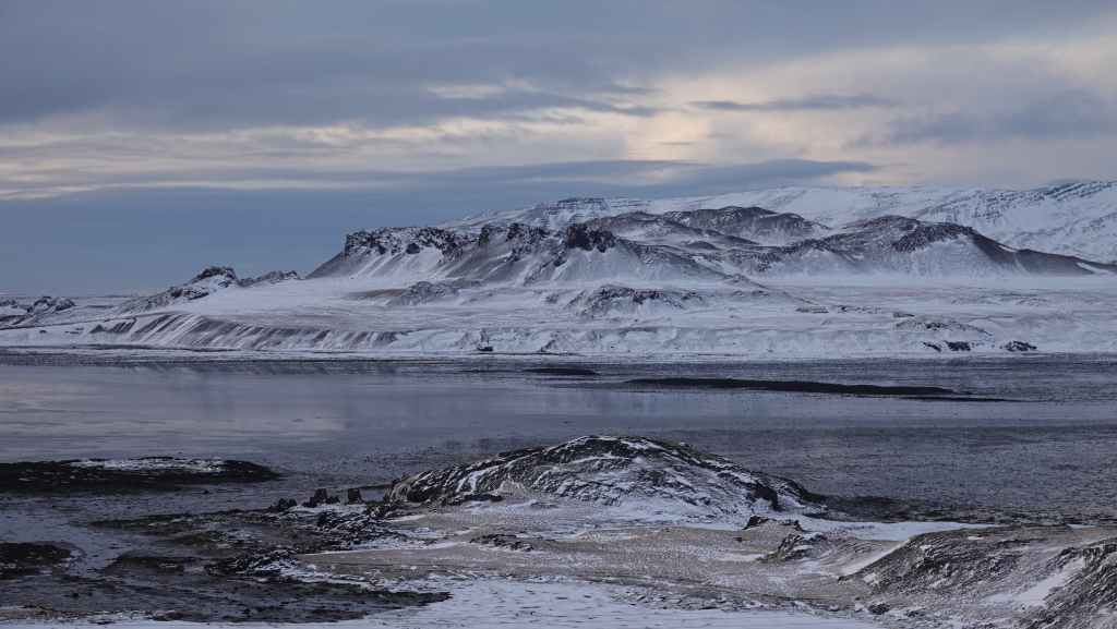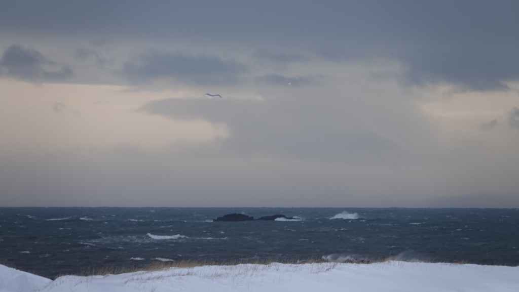 Nous nous arrêtons en cours de route à Illugastadir Stapar, une plage où il est possible d’observer des phoques, mais à part 3 jeunes parisiens et un bécasseau violet, il n’y a aucun phoque. Nous poursuivons donc notre itinéraire. On fait quelques arrêts « photo » : les paysages blancs sur le fond gris du ciel et de l’océan sont magnifiques… On redescend par l’ouest de la péninsule. Nous sommes passés par là il y a dix ans mais, avec la neige, nous avons du mal à reconnaitre les lieux. Nous arrivons de nuit à la maison…