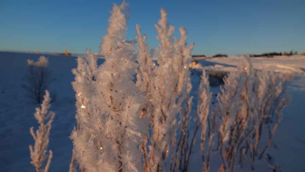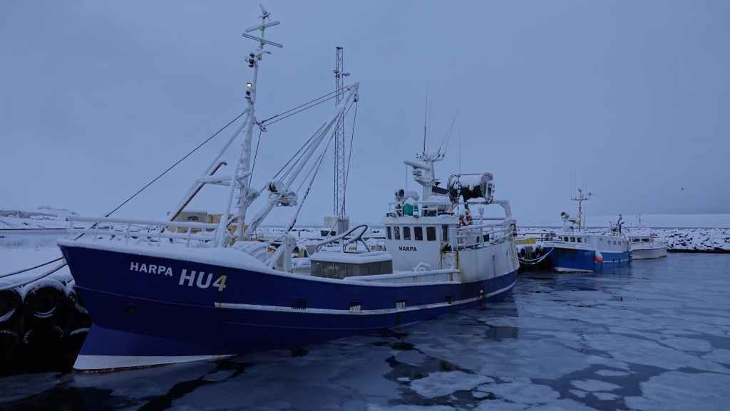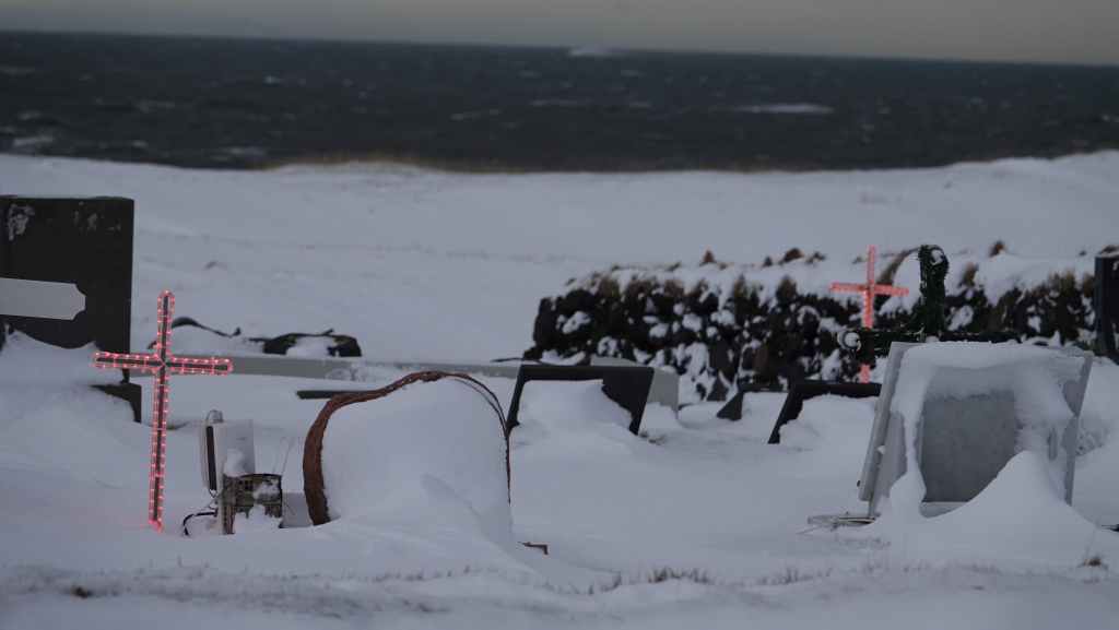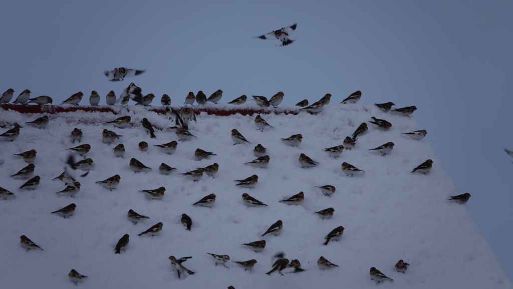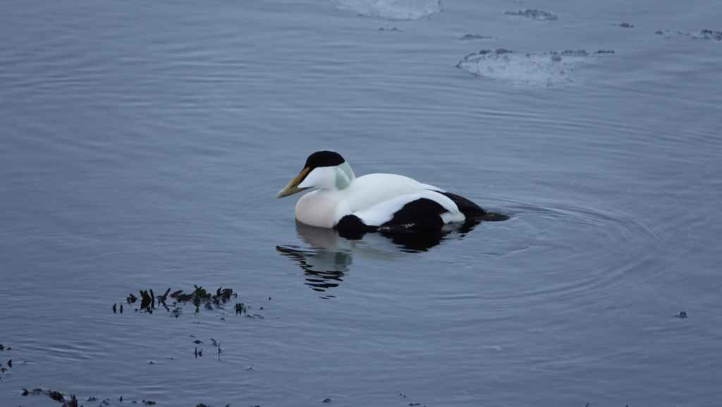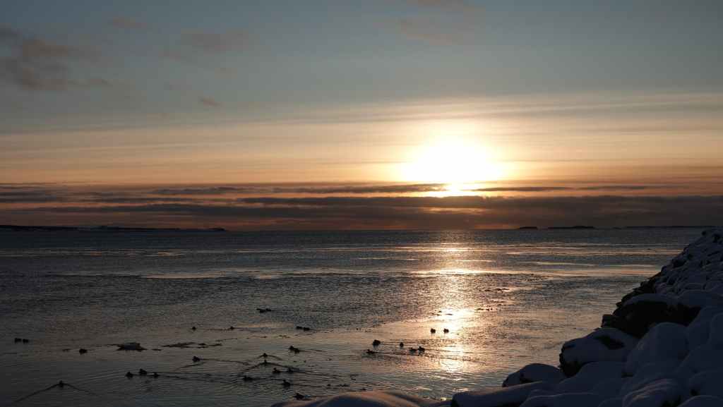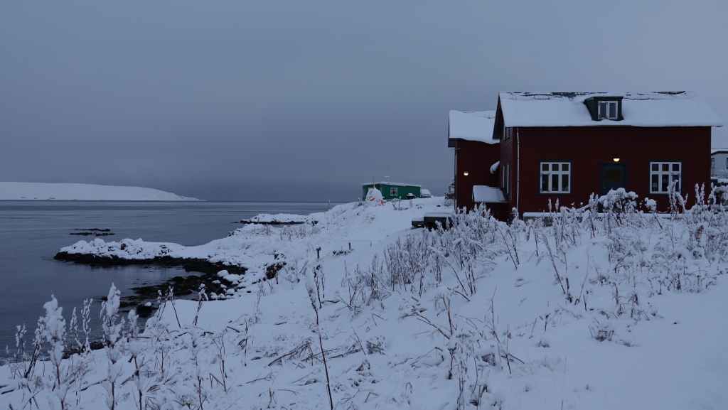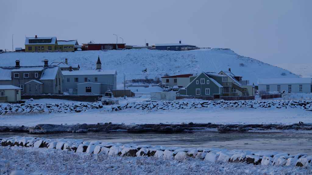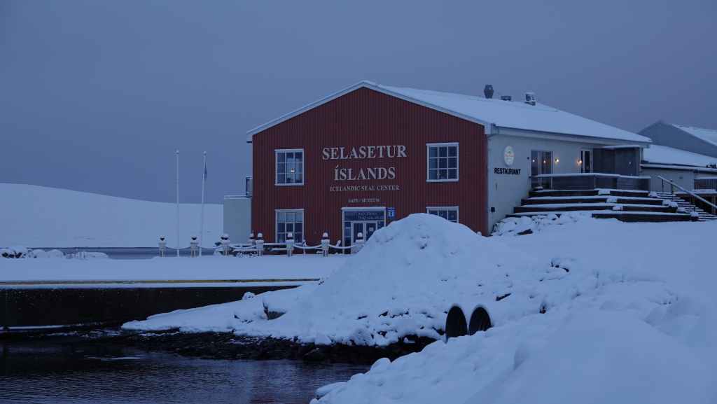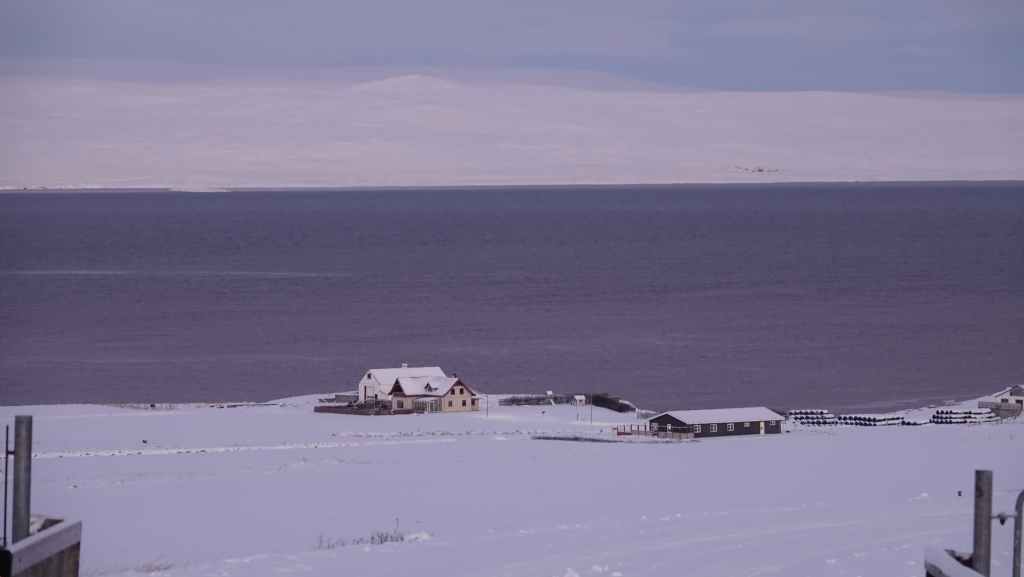 Après une bonne nuit et un lever tardif, comme le soleil (il fait bien jour à 10h30), nous descendons visiter le village qui n’est pas exceptionnel : il est situé en bord de mer et possède un petit port en partie gelé, où pataugent quelques canards eiders. Autour, quelques maisons anciennes, un musée exposition (fermé en hiver) sur les phoques présents dans les alentours et que nous espérons bien voir cet après-midi, un restaurant, un magasin d’objets artisanaux (fermé lui aussi) et des hangars… Nous remontons en direction de l’église puis au-dessus du petit lotissement où nous résiderons pour 4 nuits. Nous observons des nuées de petits oiseaux, des bruants des neige, qui virevoltent au-dessus d’une maison et d’arbres. Nous poursuivons en direction du cimetière et de sa chapelle, très isolés de Hvammstangi. Notre balade de 2h30 se termine à l’heure du repas.