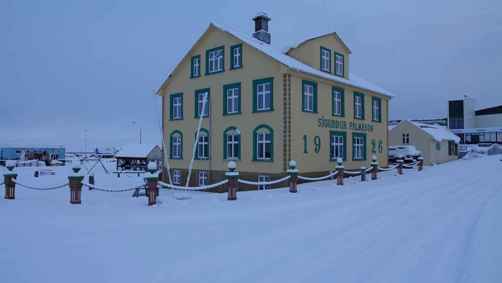 Nous avons décidé de descendre prendre notre diner au restaurant vers le port. Nous suivons un petit sentier éclairé afin de rejoindre le Heilbrigðisstofnun Hvammstanga. Et vu les prix pratiqués, nous nous contenterons d’un plat de poisson (excellent) et d’un verre de vin du patron (cher et moyen)…