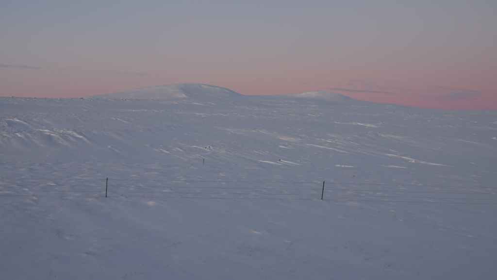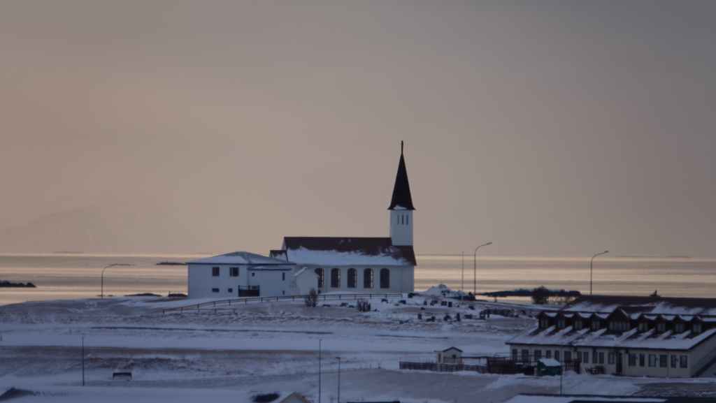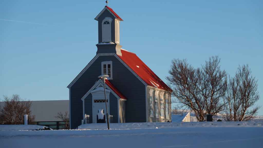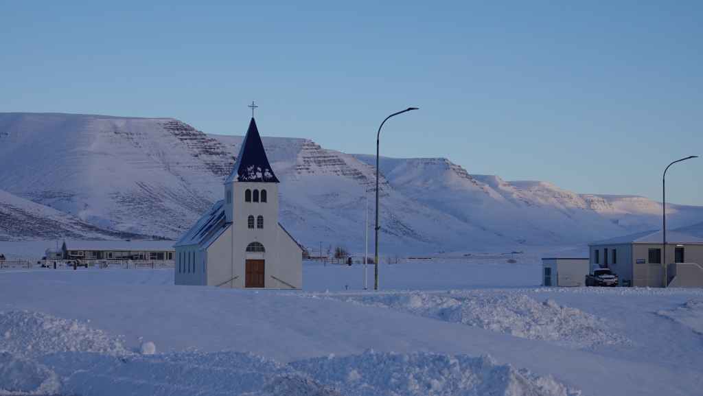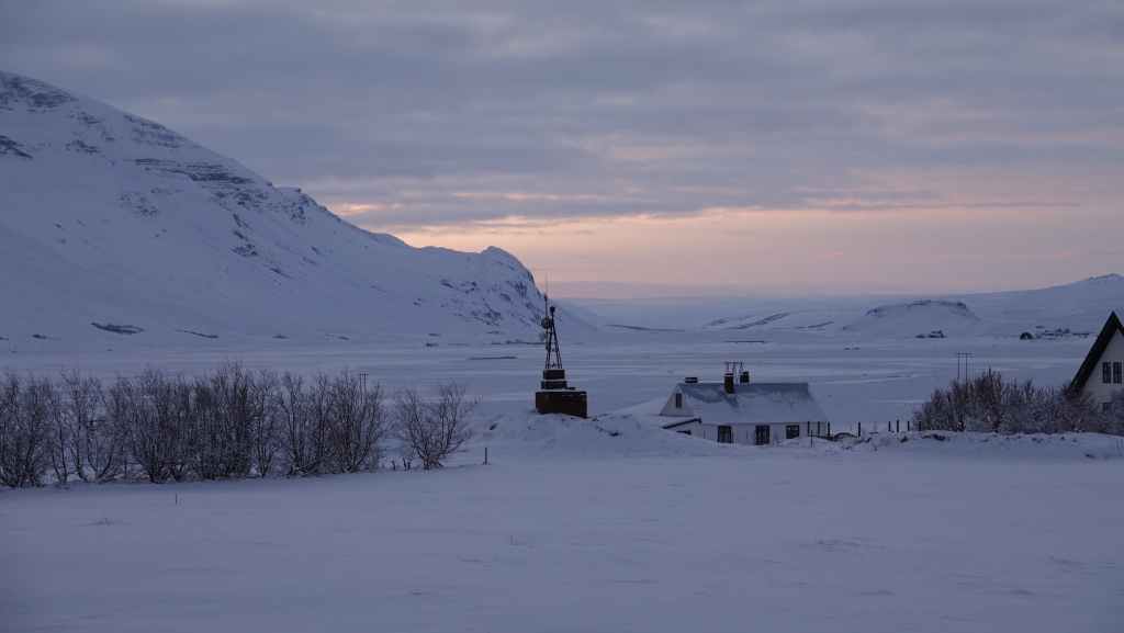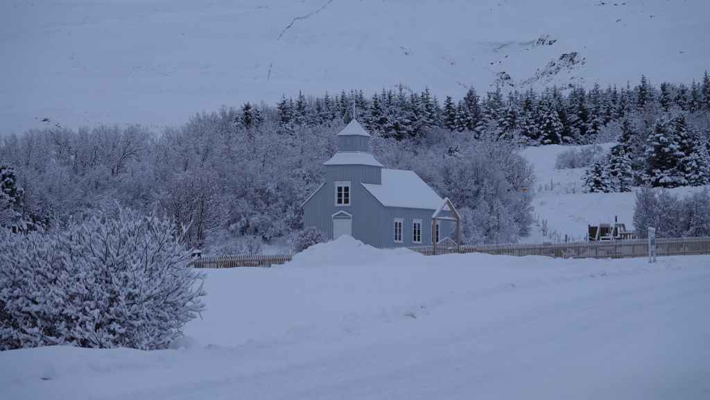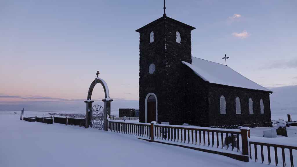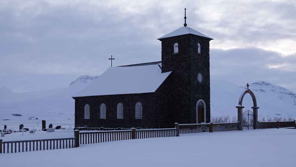 On se lève vers 8h00 : il fait complètement nuit… Nous quittons l’appartement vers 9h30 quand l’aube commence à pointer. Nous avons décidé de partir vers l’est de Hvammstangi, en direction de Hofsos, mais nous nous arrêtons d’abord à la petite chapelle de Pingeyrar construite en pierre volcanique sombre. Les couleurs du ciel sans nuages sont somptueuses, avec du rose sur l’océan sombre.