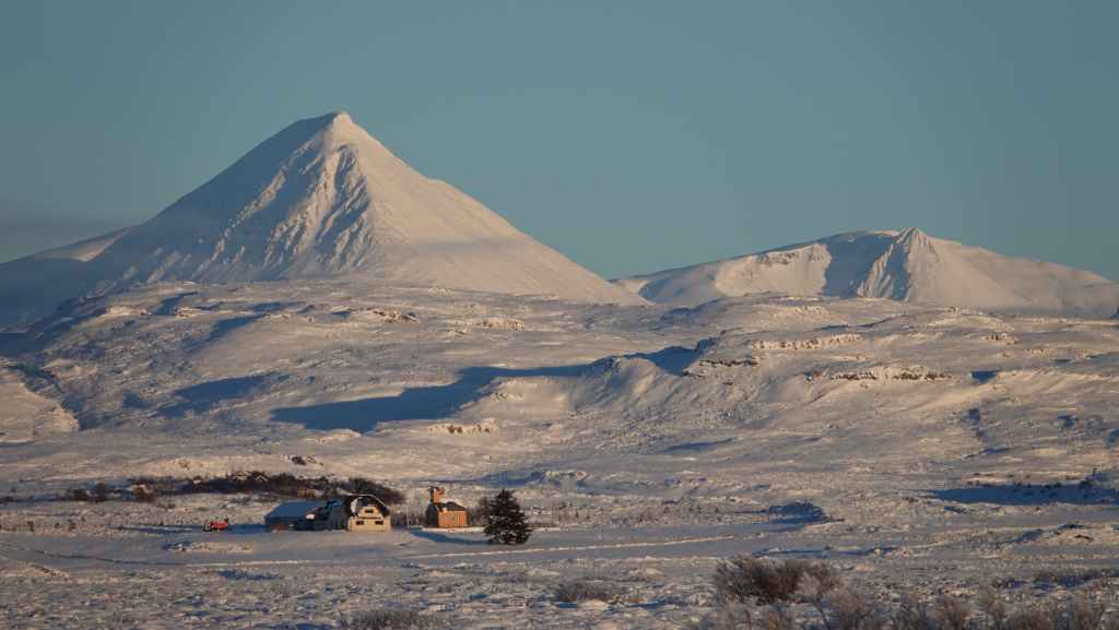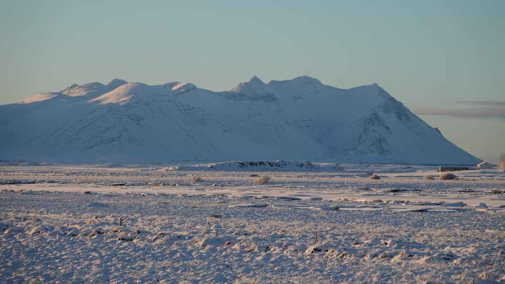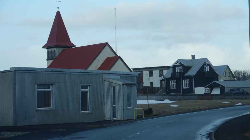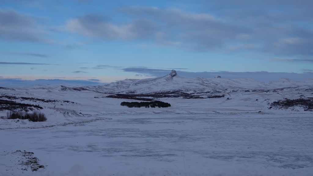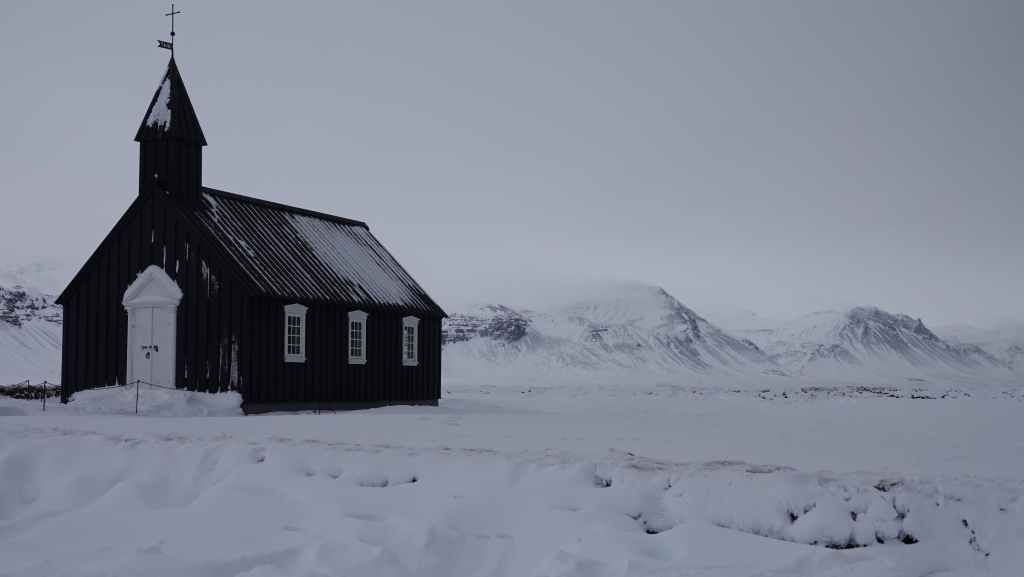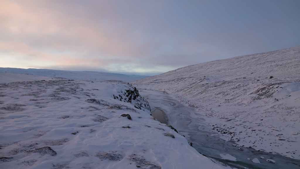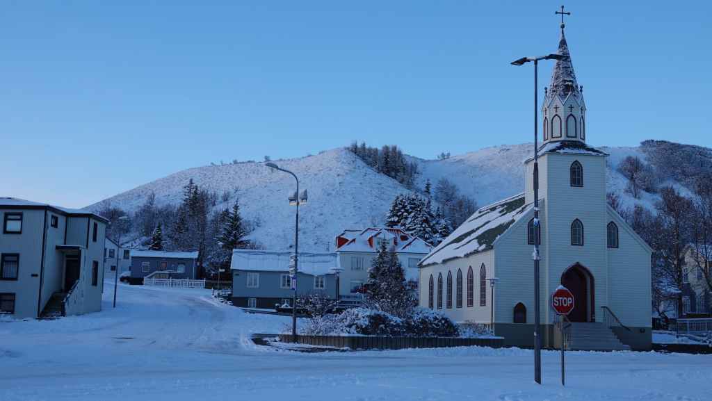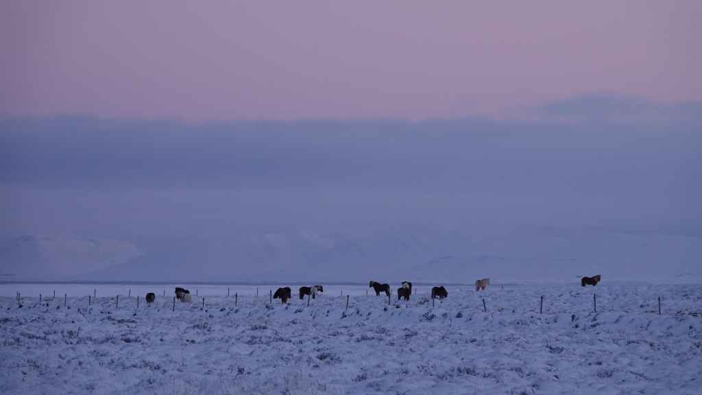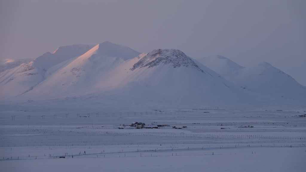 On se lève vers 8h00 : il fait complètement nuit… Nous quittons l’appartement vers 9h30 quand l’aube commence à pointer. Nous avons décidé de partir vers l’est de Hvammstangi, en direction de Hofsos, mais nous nous arrêtons d’abord à la petite chapelle de Pingeyrar construite en pierre volcanique sombre. Les couleurs du ciel sans nuages sont somptueuses, avec du rose sur l’océan sombre.