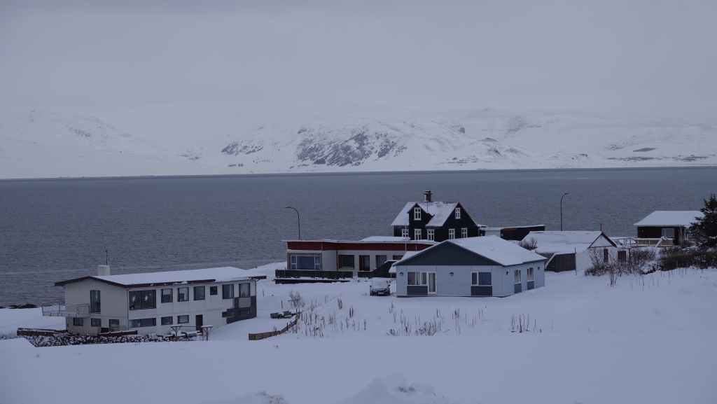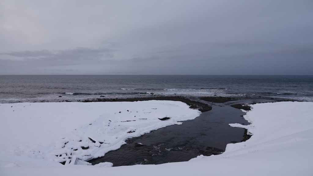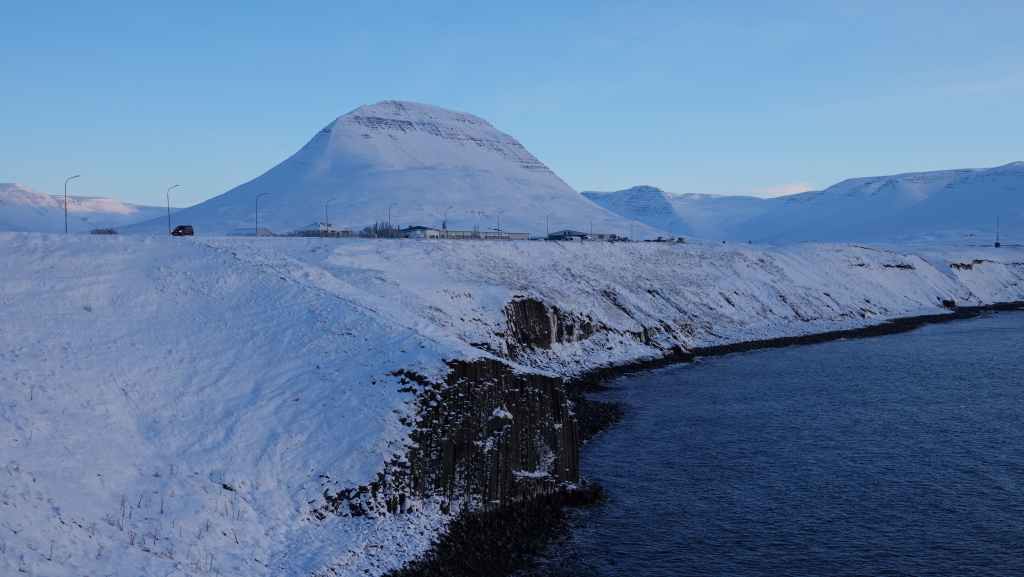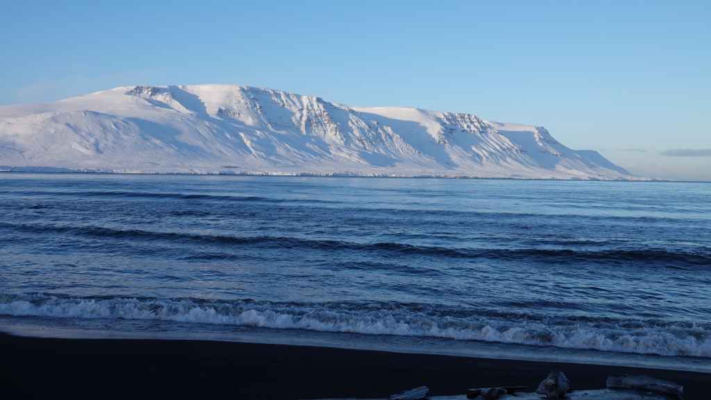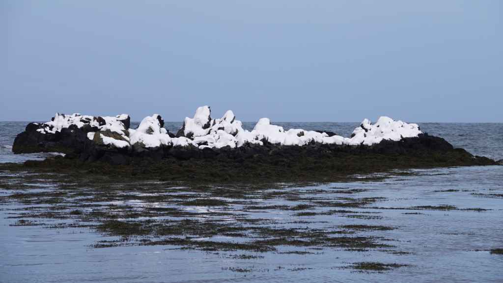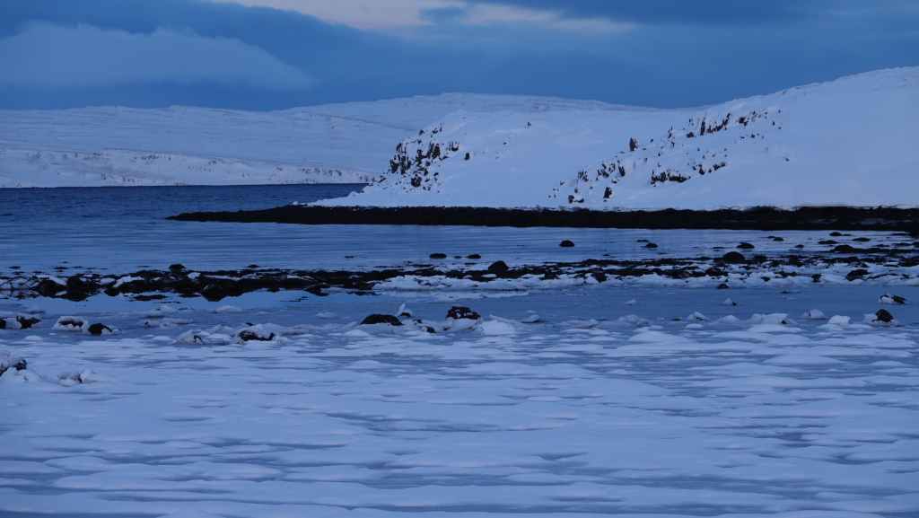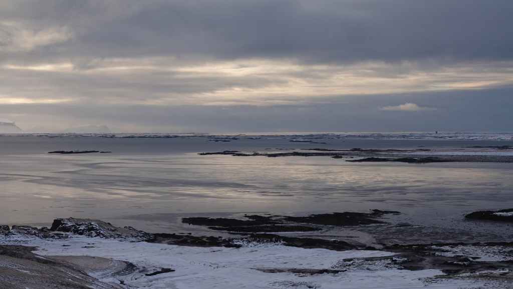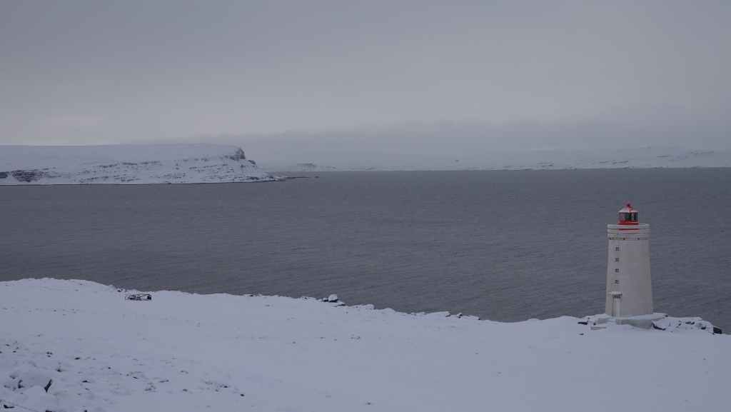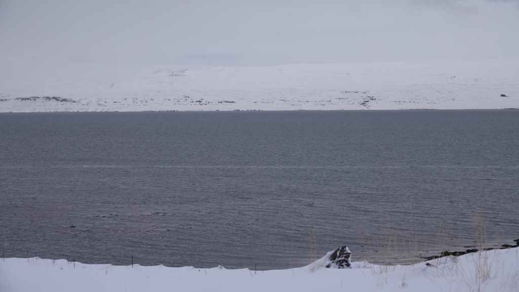Comme hier, nous partons vers 9h30, cette fois-ci en direction de l’ouest. Le ciel est un peu nuageux et le plafond assez bas. Nous prenons la N1 jusqu’à Stadarskali, la N68 sur 9 km puis la N59 qui monte dans la montagne, et plus on monte, moins la visibilité est bonne… On est dans un brouillard épais et il neige. C’est dans la descente que nous sortons du jour blanc et que nous apercevons les premières éclaircies sur Budarladur, petite ville côtière sans charme particulier. Nous faisons tout de même un petit tour à pied, histoire de se détendre les jambes…