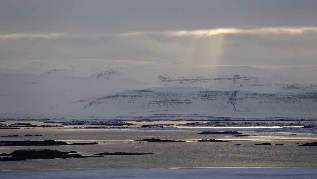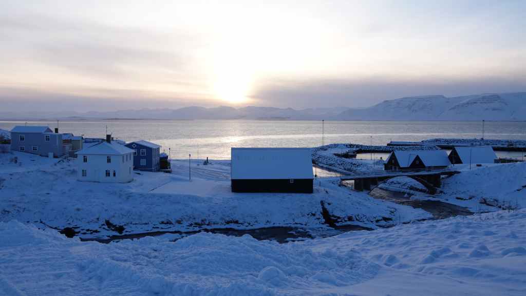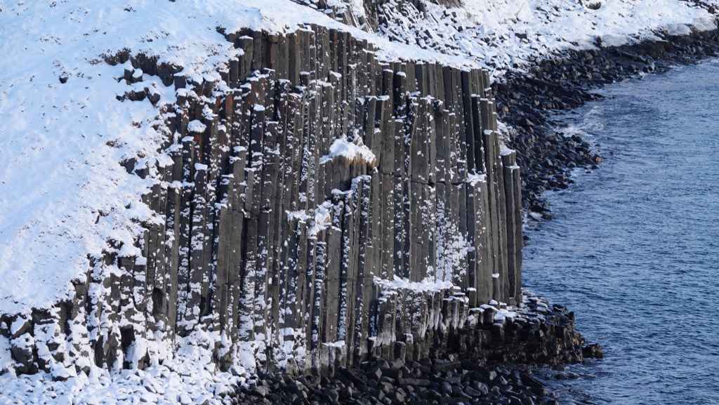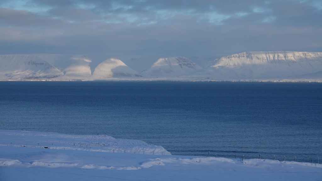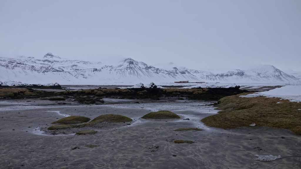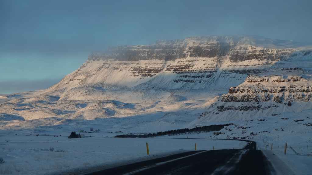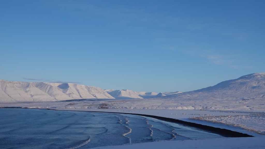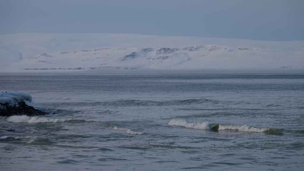 Comme hier, nous partons vers 9h30, cette fois-ci en direction de l’ouest. Le ciel est un peu nuageux et le plafond assez bas. Nous prenons la N1 jusqu’à Stadarskali, la N68 sur 9 km puis la N59 qui monte dans la montagne, et plus on monte, moins la visibilité est bonne… On est dans un brouillard épais et il neige. C’est dans la descente que nous sortons du jour blanc et que nous apercevons les premières éclaircies sur Budarladur, petite ville côtière sans charme particulier. Nous faisons tout de même un petit tour à pied, histoire de se détendre les jambes…