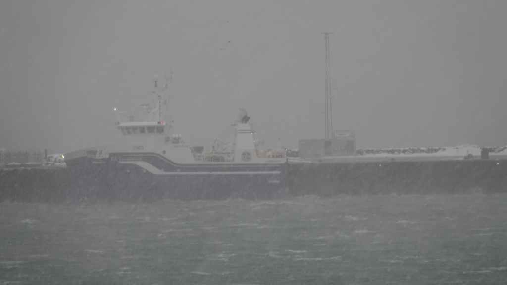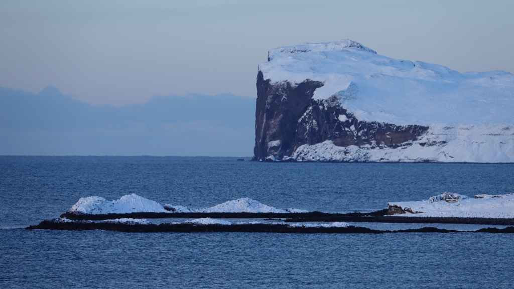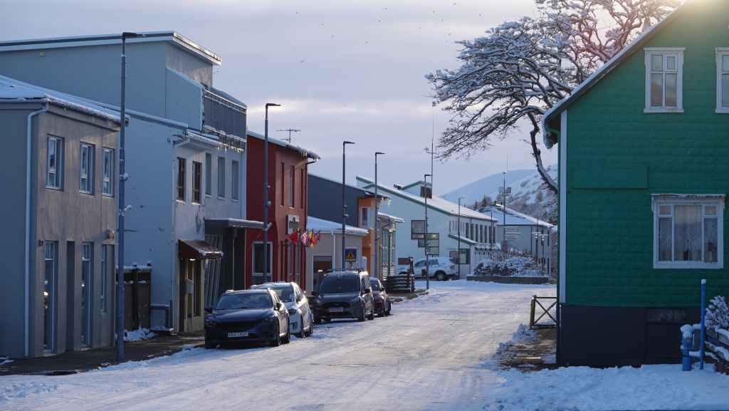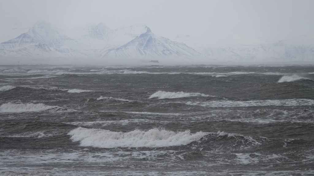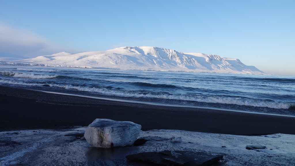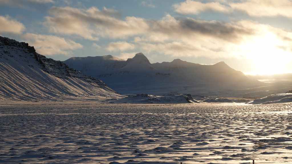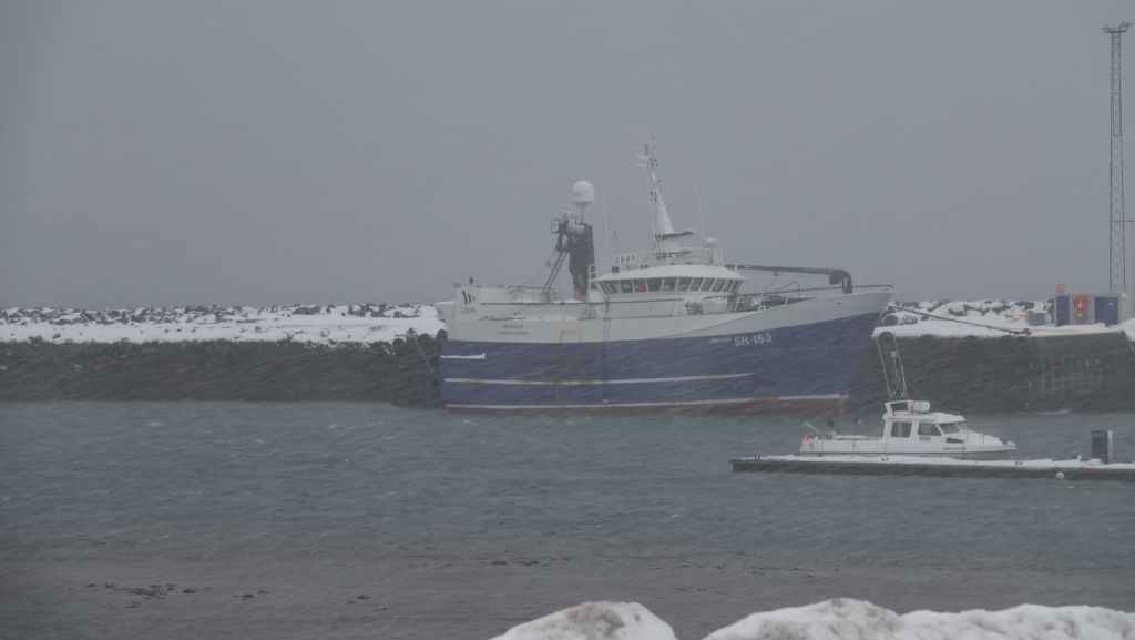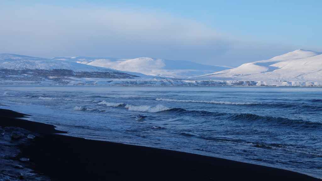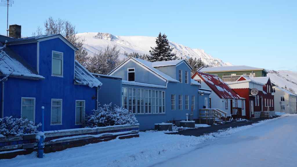 Comme hier, nous partons vers 9h30, cette fois-ci en direction de l’ouest. Le ciel est un peu nuageux et le plafond assez bas. Nous prenons la N1 jusqu’à Stadarskali, la N68 sur 9 km puis la N59 qui monte dans la montagne, et plus on monte, moins la visibilité est bonne… On est dans un brouillard épais et il neige. C’est dans la descente que nous sortons du jour blanc et que nous apercevons les premières éclaircies sur Budarladur, petite ville côtière sans charme particulier. Nous faisons tout de même un petit tour à pied, histoire de se détendre les jambes…