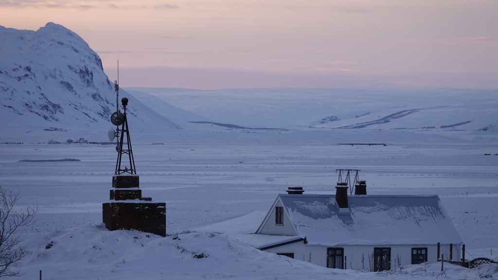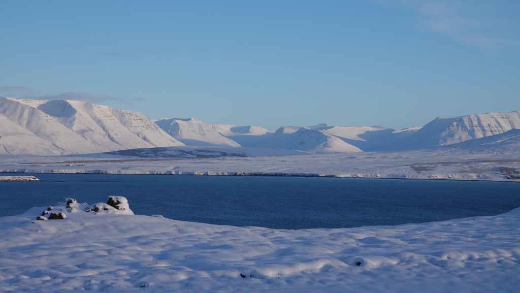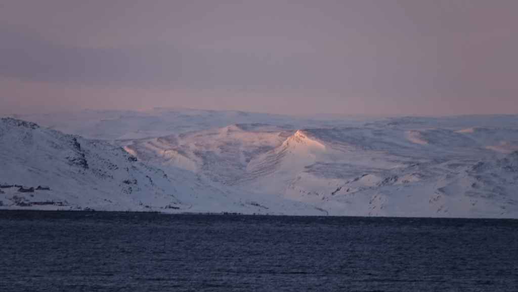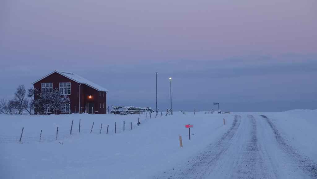 L’après-midi, nous prenons la voiture pour faire le tour de la péninsule jusqu’à la pointe nord d’Hindisvik. À la sortie du village, l’asphalte se transforme en piste enneigée mais le chasse-neige est déjà passé.