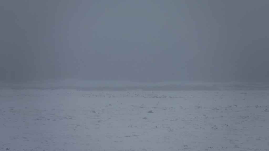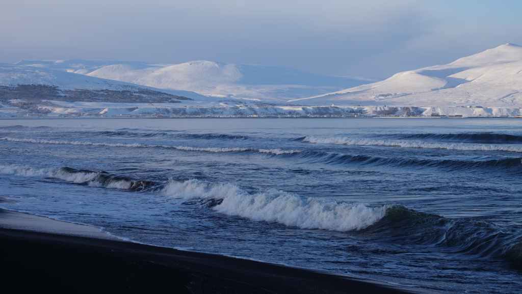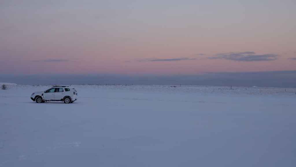 Comme il est déjà l’heure du déjeuner, nous trouvons un petit coin sympa sur une plage enneigée. On prend notre repas (un plat déshydraté) dans la voiture et face à l’océan : c’est magique ! Et après le repas, nous profitons du soleil qui a bien du mal à réchauffer l’atmosphère…