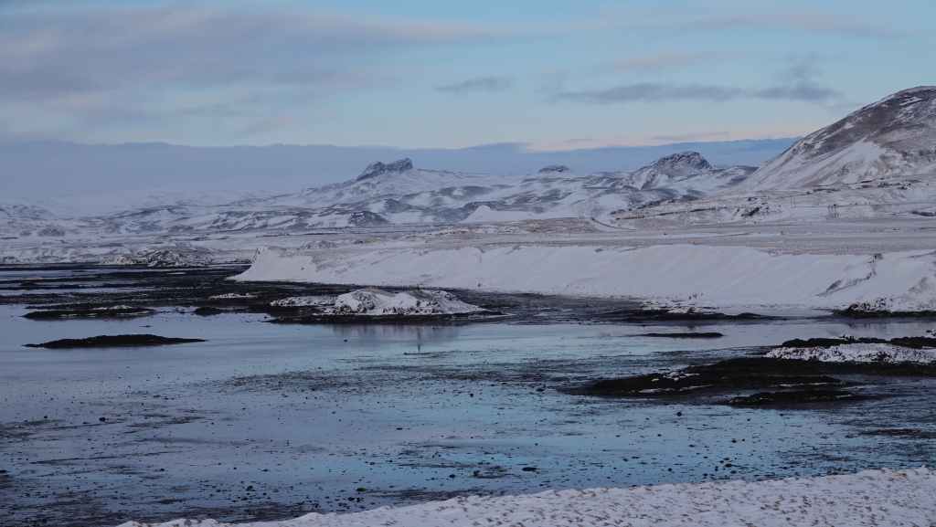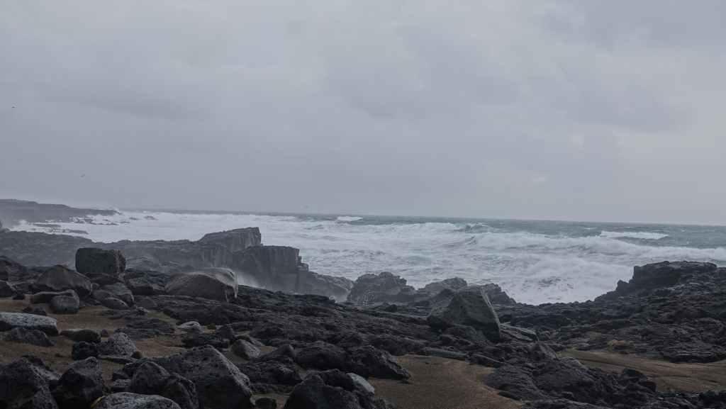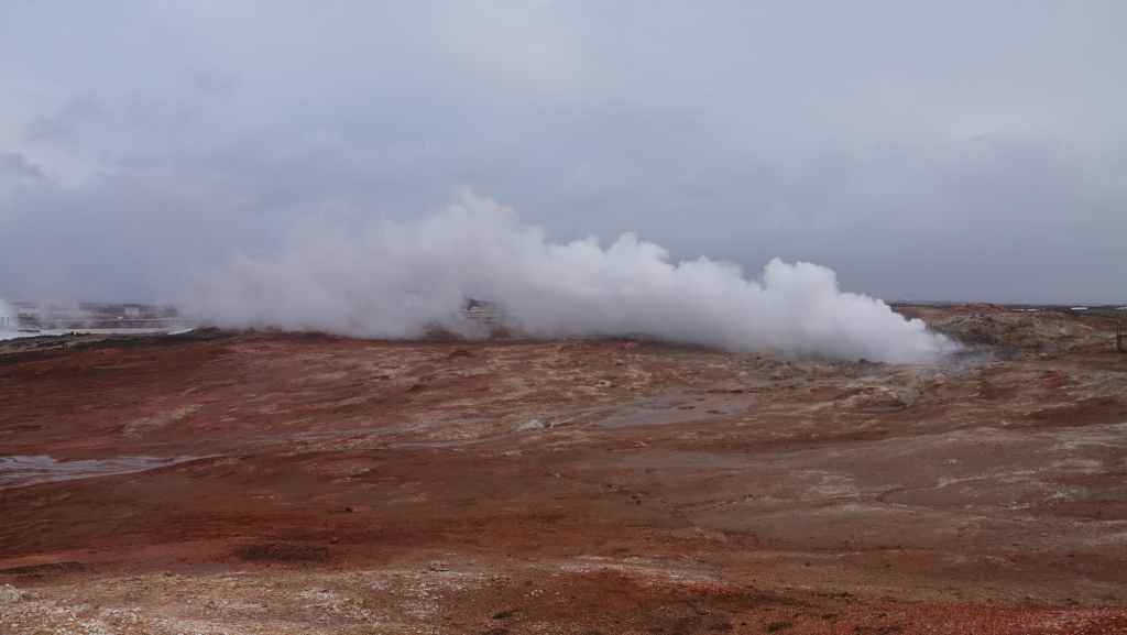 Bon, c’est le dernier jour et on se réveille sans électricité… La température est encore remontée puisqu’il fait ce matin 10,5°C, mais la tempête s’est affaiblie. On déjeune et on fait nos sacs à la lueur de nos frontales. Puis on part en direction du sud et plus précisément la péninsule de Reykjanes où se situe l’aéroport. La météo annoncée parait meilleure au sud et il est vrai que le ciel s’éclaircit en se rapprochant de Reykjavik.
