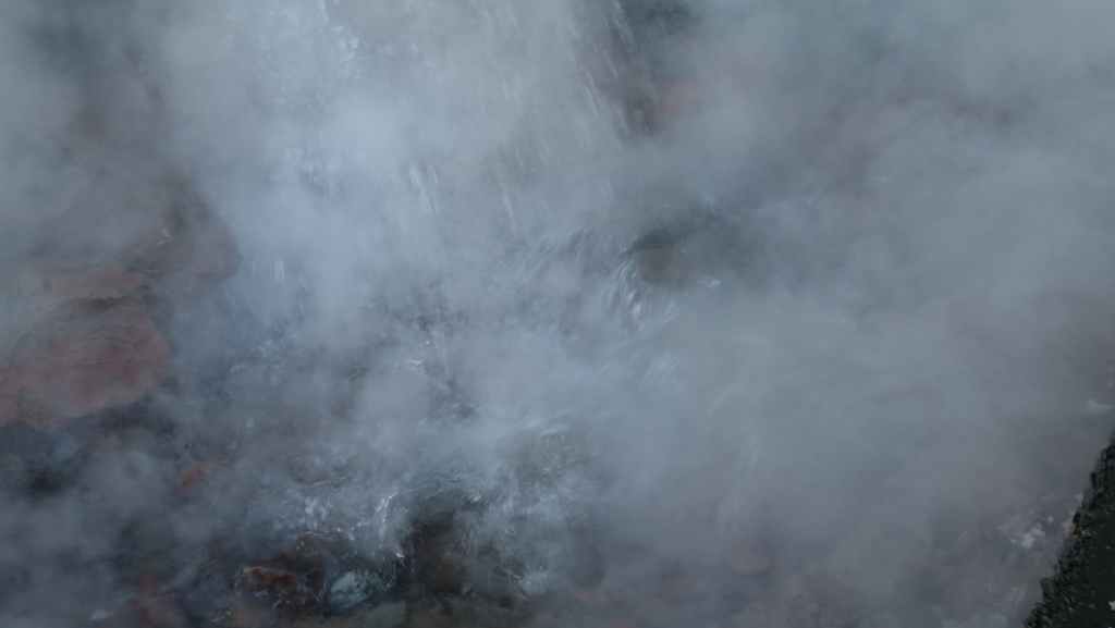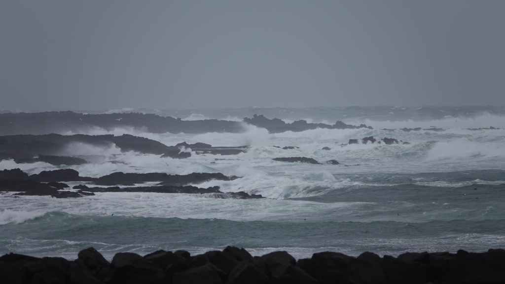 L’explosion d’eau bouillante se fait à intervalles assez réguliers. Des marmites d’eaux bouillonnantes sont disséminées un peu partout autour du geyser. Et comme il fait froid et qu’il nous reste encore beaucoup de route à faire, nous ne nous attardons pas trop longtemps sur le site. Au retour, les conditions de circulation se sont dégradées et on dépasse 2 véhicules de touristes, le nez dans le fossé, sorties de route sans gravité… on rejoint la côte sous la pluie et un vent très violent puisque des panneaux lumineux indiquent des rafales à 48 m/s soit 173 km/h !!! Je m’agrippe donc fermement au volant du Duster pour le maintenir sur la route… les pauses photos ne sont alors plus d’actualité ! On rejoint notre cabanon qui vibrera toute la soirée et toute la nuit sous les coups de boutoirs de la tempête. La température est remontée à 8°C.
