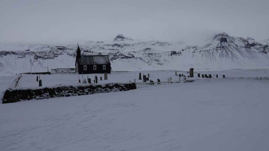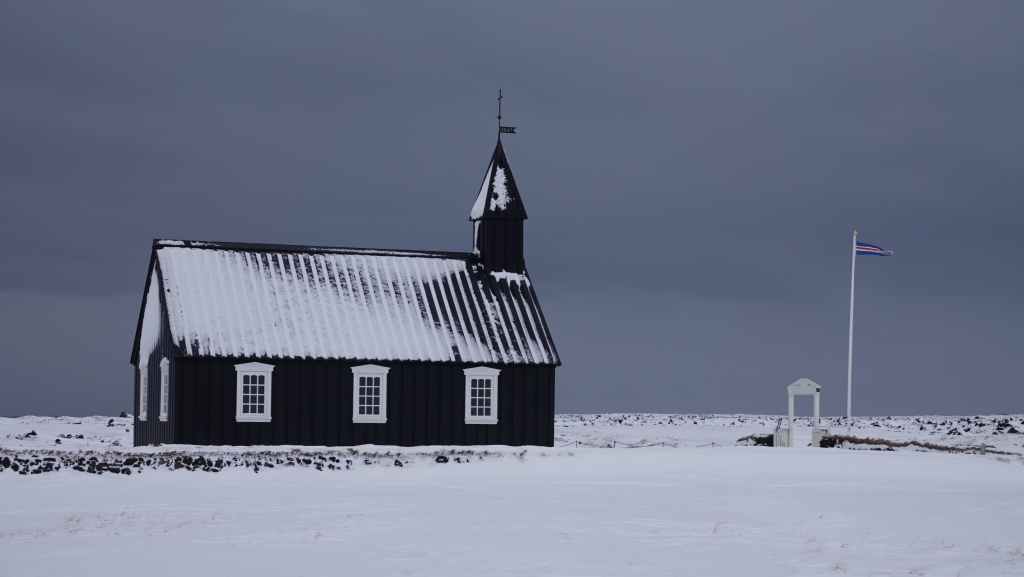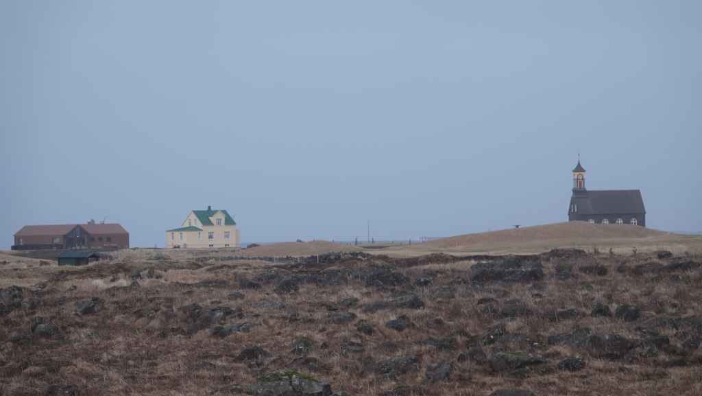 Puis la route part plein ouest en longeant plus ou moins la côte. On s’arrête à Budir pour espérer voir des phoques. Nous avions bivouaquer en 2015 à côté de la chapelle. Mais à part des touristes qui vont se réchauffer à l’hôtel restaurant, il n’y a pas de mammifères, marins en l’occurrence ! On en profite pour manger sur le parking du site.