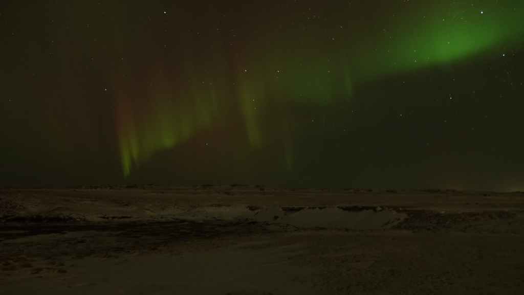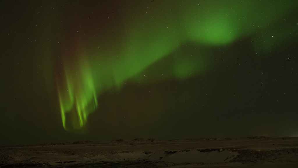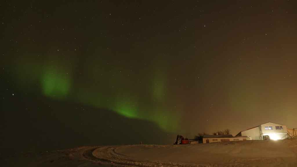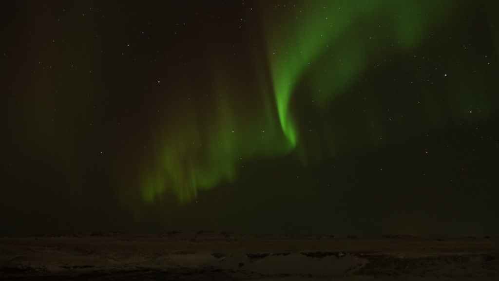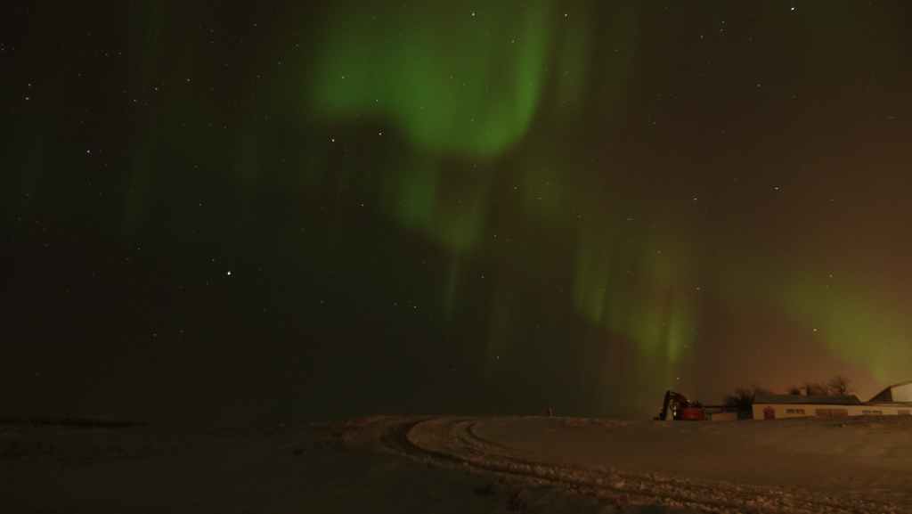 Il fait nuit noire quand nous apercevons une aurore boréale depuis la voiture. Nous stoppons à un carrefour pour l’observer quelques minutes puis repartons en espérant en observer d’autres depuis Hvammstangi. Mais à notre arrivée, le ciel est couvert, donc pas de nouvelles aurores. Du coup, nous préparons nos sacs car nous passons notre dernière nuit ici… déjà ! Comme le temps passe vite…