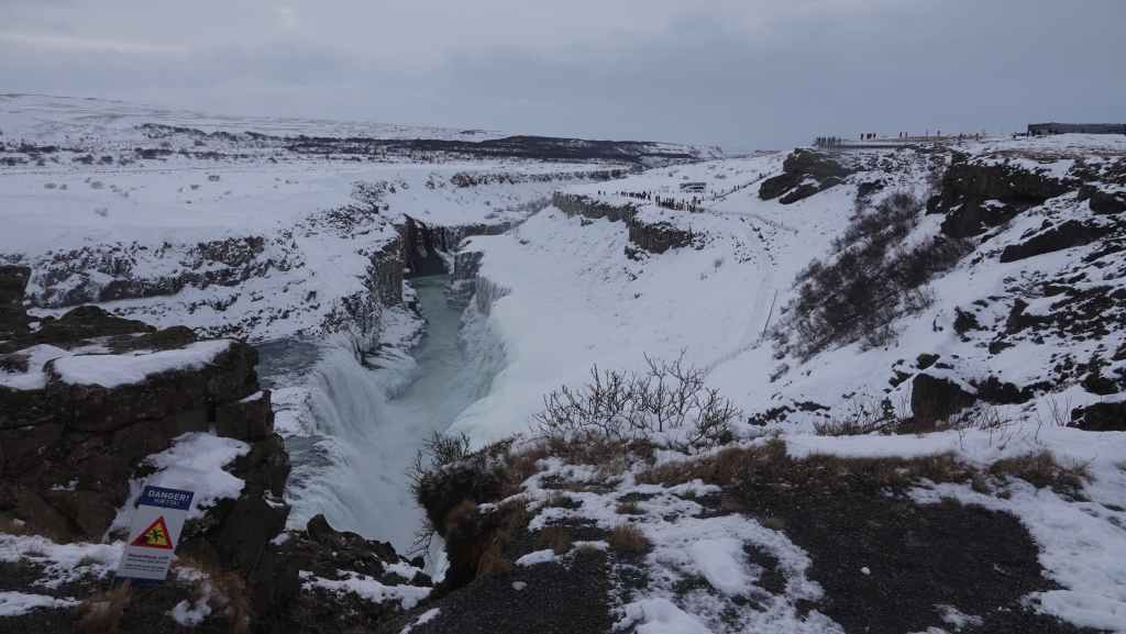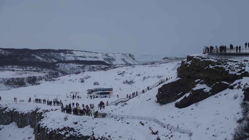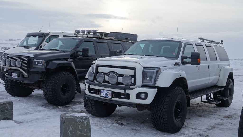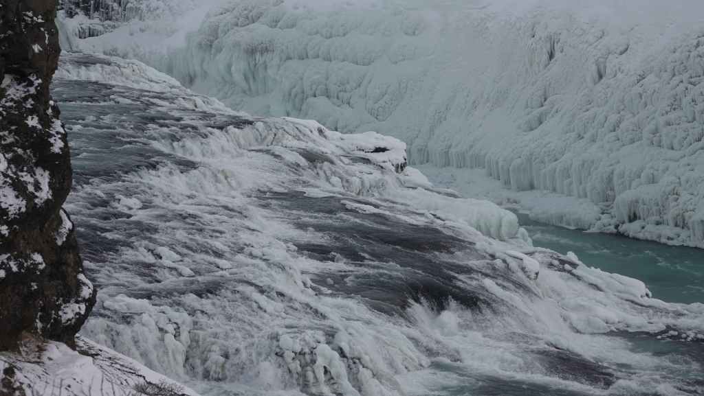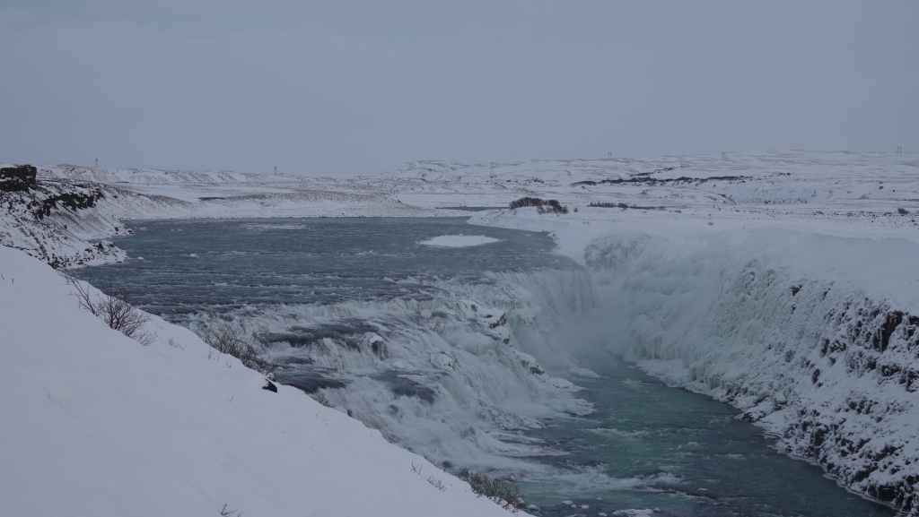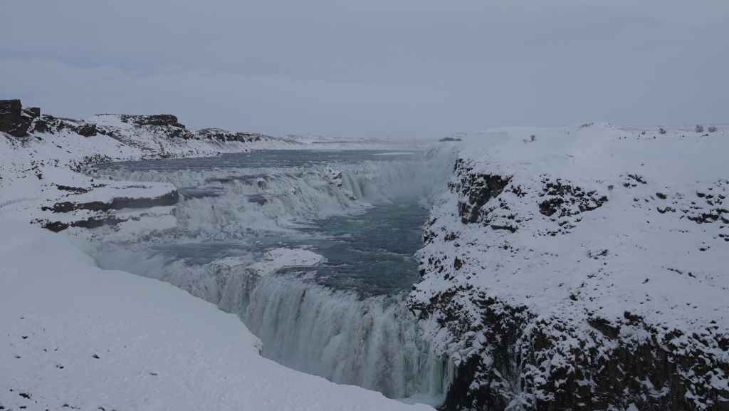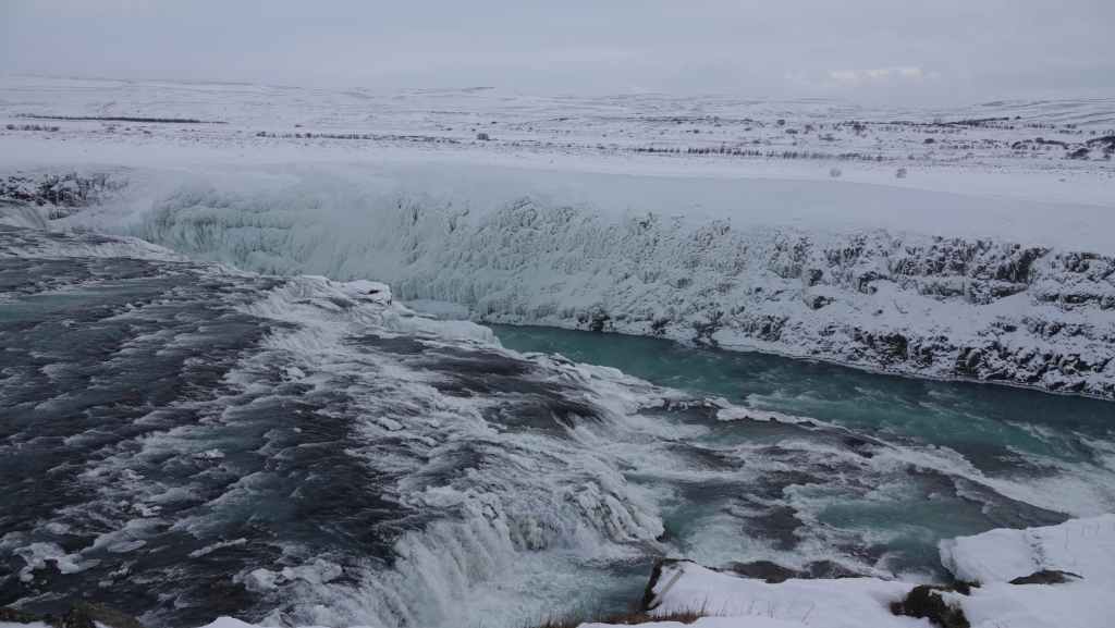 Comme il est l’heure de manger, on se gare sur le parking très touristique de Gullfoss où stationnent des véhicules tous-terrains hors normes, les « bigfoots ». puis on se rend aux chutes, à quelques encablures du bâtiment commercial… Avec la glace, le spectacle est vraiment grandiose et beaucoup plus joli qu’en été dont j’ai joins quelques photos à la fin de ce diaporama.