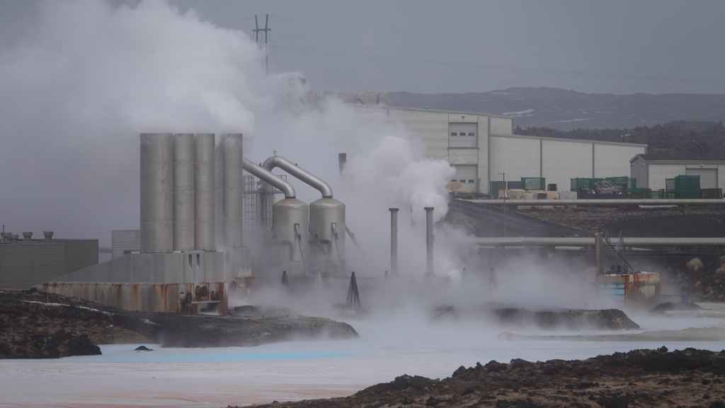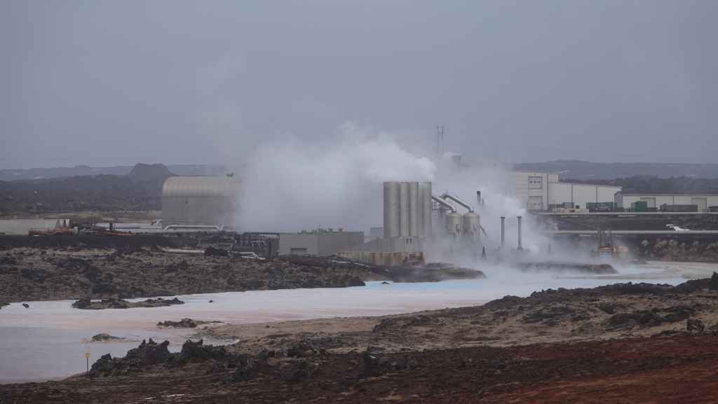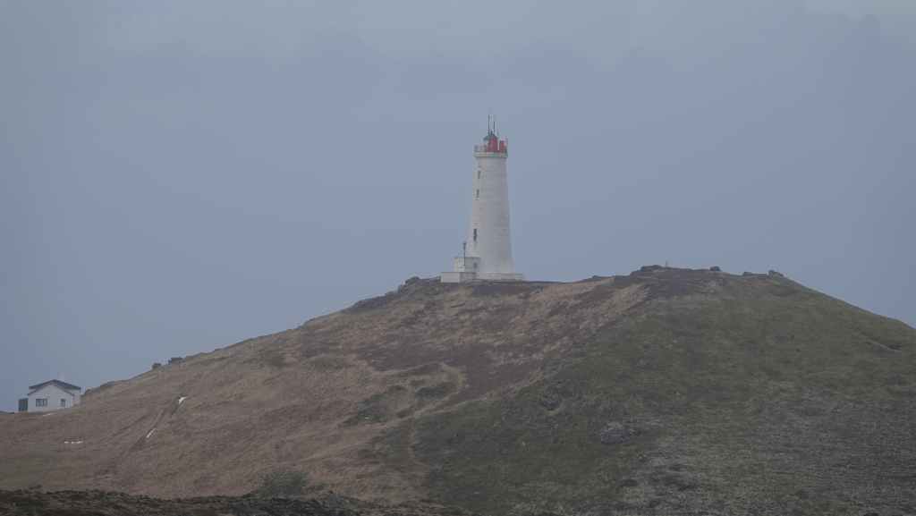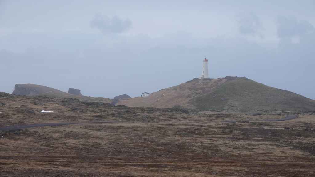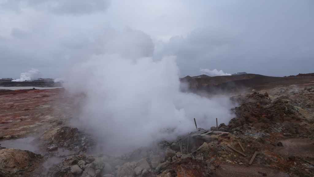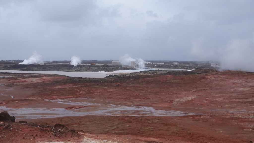 On poursuit tout en s’arrêtant en bord d’océan pour observer la tempête puis des sources géothermiques et les usines de distribution d’eaux chaudes… On aperçoit le phare de Reykjanesvirkjun.