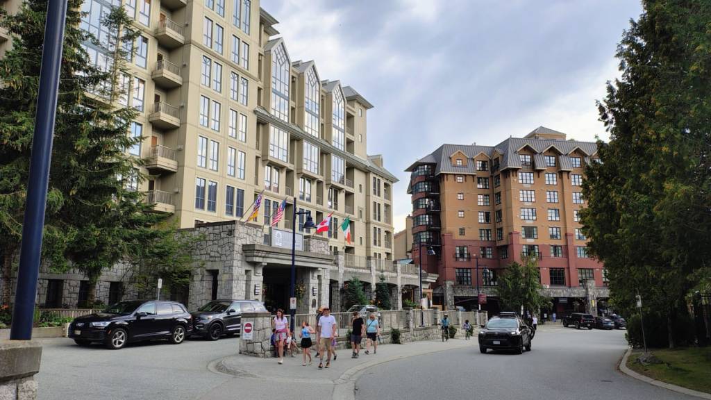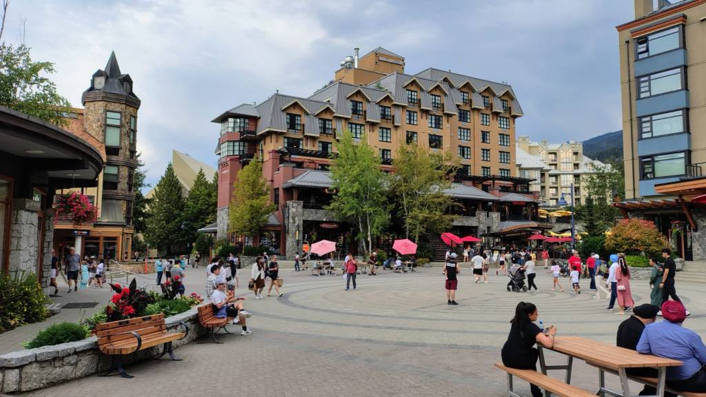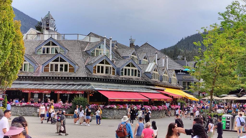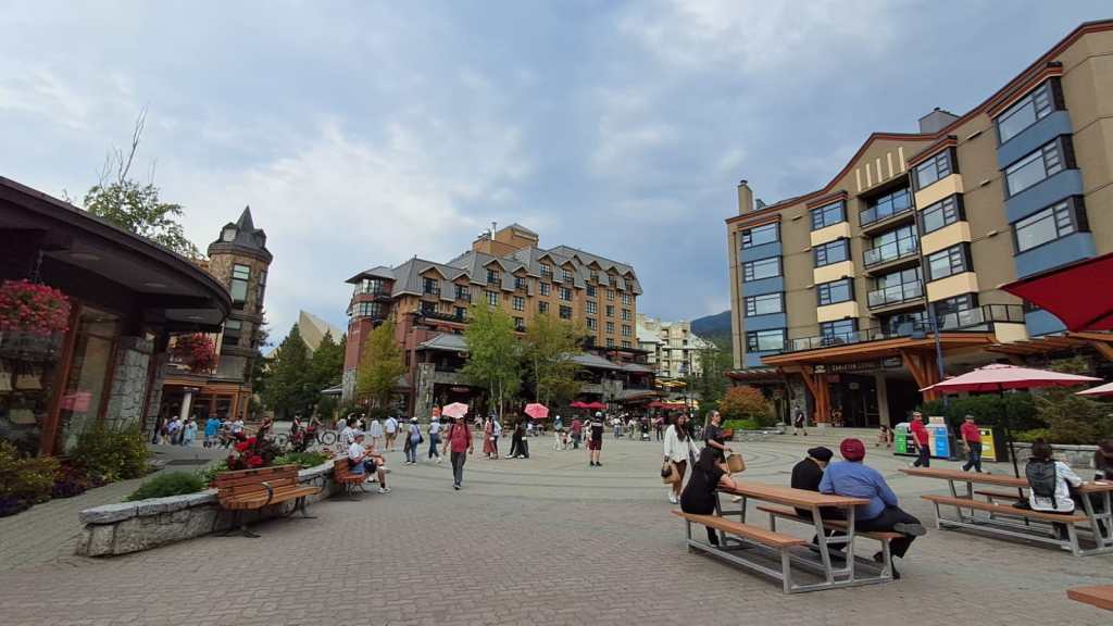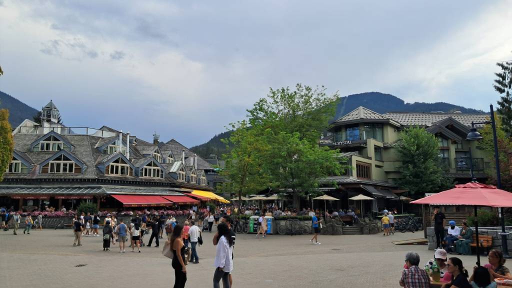 Puis nous redescendons en direction de la belle et célèbre station de sports d’hiver de Whistler. Il y a beaucoup de monde et les places de parking sont très rares. Nous nous garons provisoirement pour compléter les courses de la veille, en particulier quelques boissons apéritives et du vin local dans un magasin spécialisé. En effet, les alcools ne sont vendus que dans des magasins d’Etat. Puis nous montons tout en haut de la station pour déjeuner. Nous redescendons à pied pour visiter la station. La ville est très verte et ne ressemble à aucune autre station européenne. Ca grouille de touristes mais ça reste pourtant assez calme…