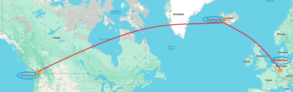 Nous avions réservé un vol Paris / Vancouver direct sur Air France mais quelques mois avant notre départ, la compagnie a annulé le vol retour, ce qui nous a obligé à annuler et reprendre un vol Francfort / Vancouver via Reykjavik avec la compagnie nationale islandaise Icelandair : 1h30 d’escale sur l’île et une compagnie nationale digne d’une compagnie lowcoast où tout est payant, y compris sur le vol le plus long. Ce n’était pas mieux qu’Easyjet l’hiver dernier pour nous rendre en islande ! De ce fait, nous déconseillons cette compagnie, en particulier pour les vols long courrier.