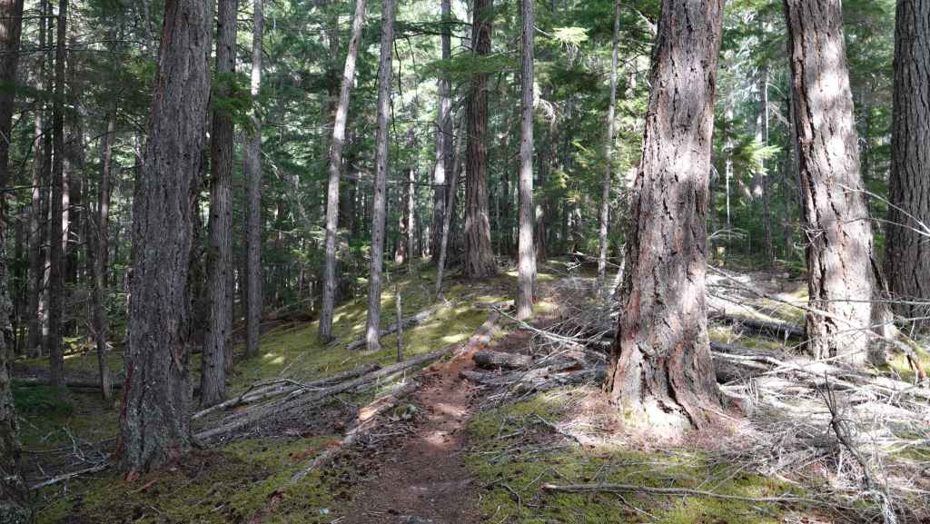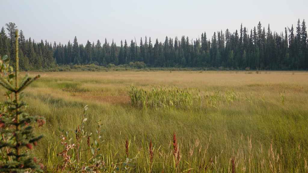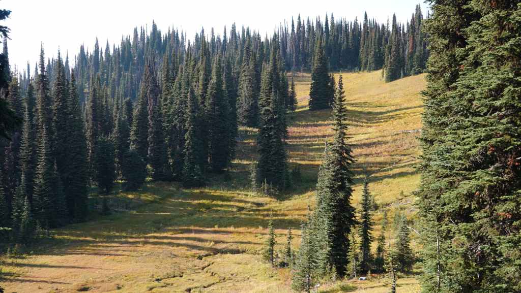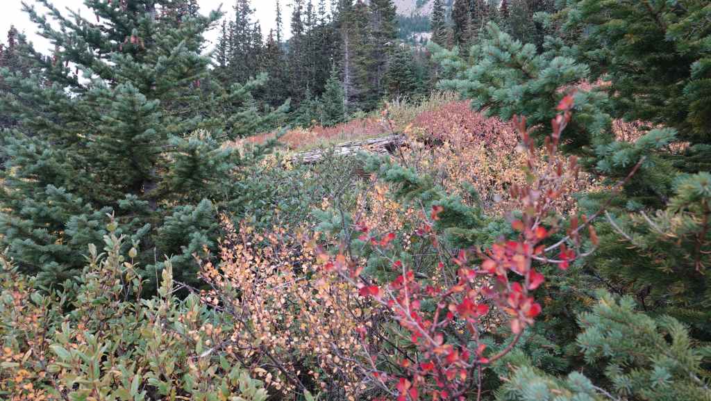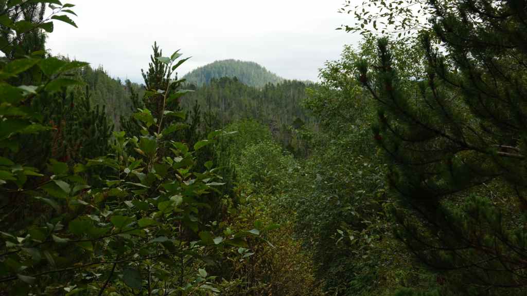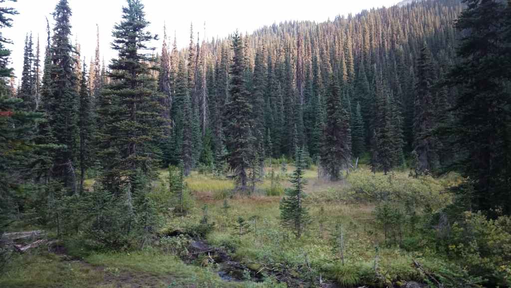 On débute la rando par un long faux plat montant sur une piste assez large. Comme nous sommes au pays des ours, on à mis à la ceinture le spray de gaz poivré obligatoire en cas d’attaque. On a eu la chance d’en trouver une oubliée dans le pick-up par les derniers locataires. Après un bon moment de marche inintéressante, on prend enfin de la hauteur, toujours dans la forêt pour rejoindre une zone humide.