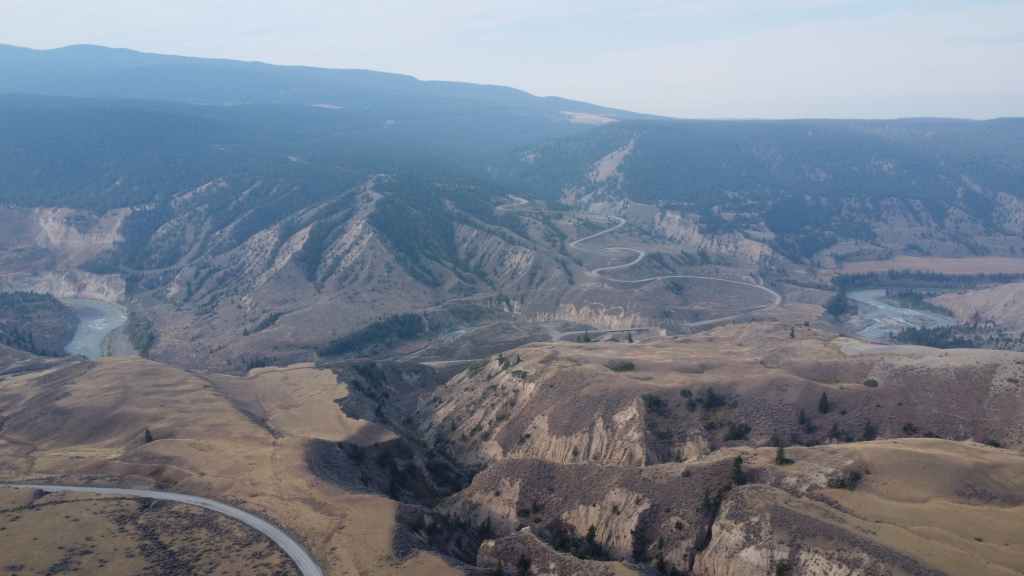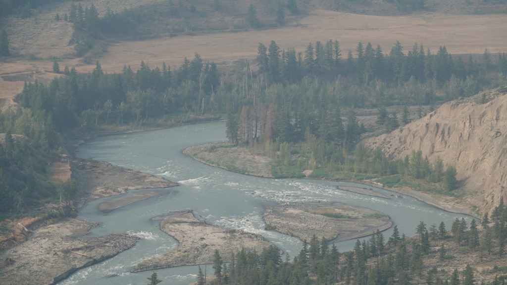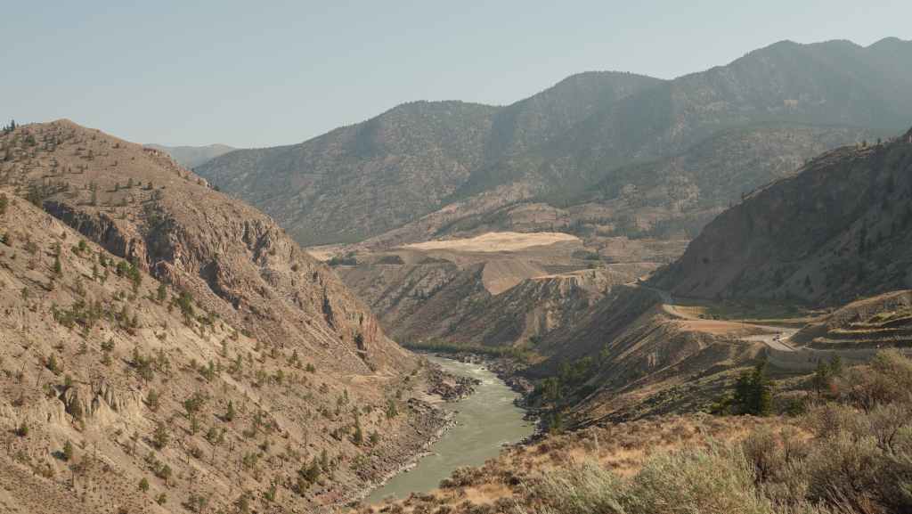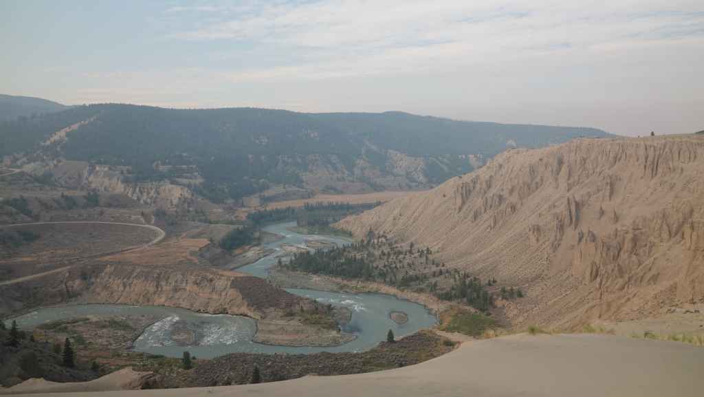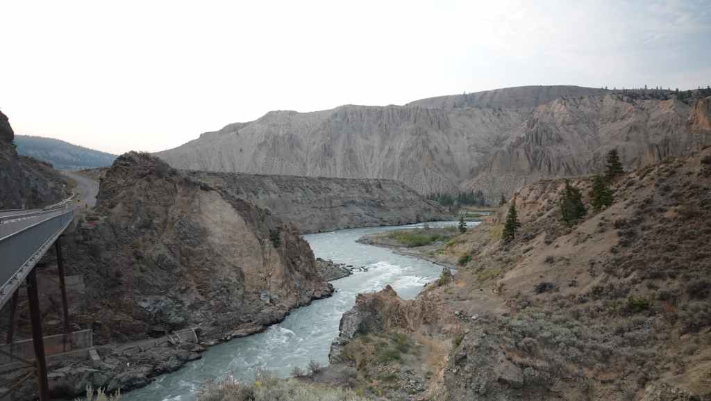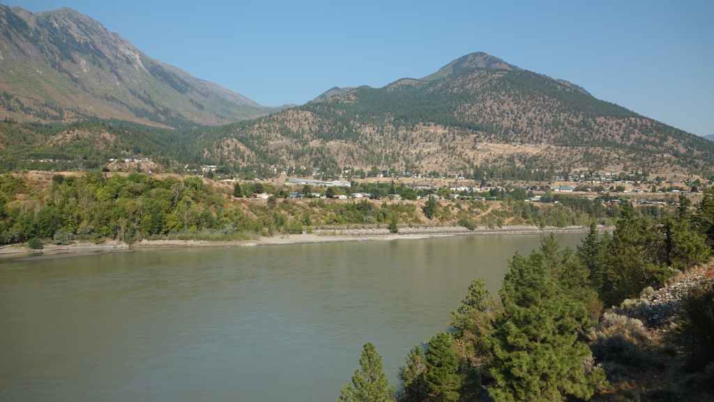 Nous nous rendons d’abord dans la petite ville de Lillooet et son supermarché puis repartons en traversant le fleuve Fraser, qui forme un canyon à cet endroit dans un paysage semi-désertique.