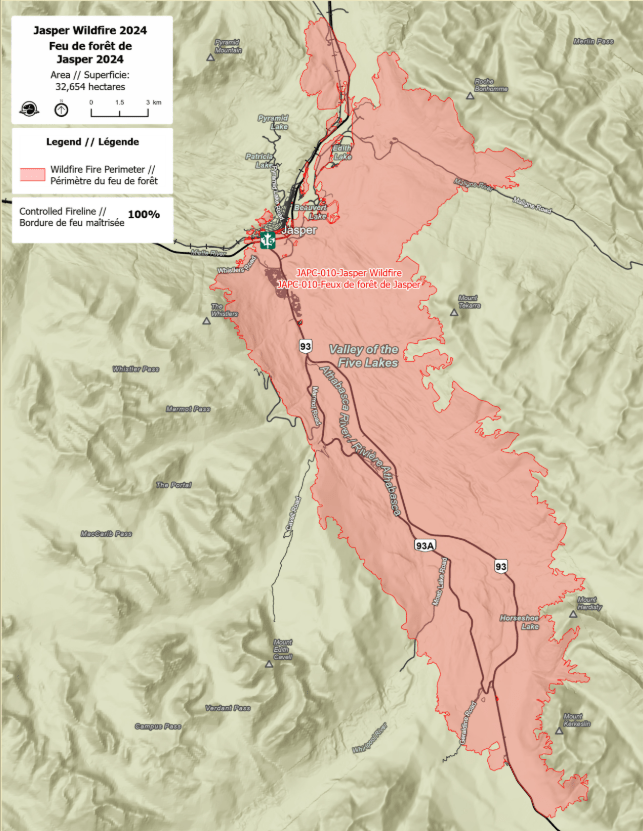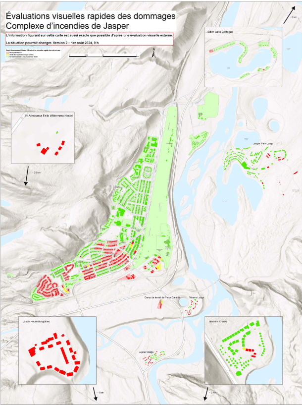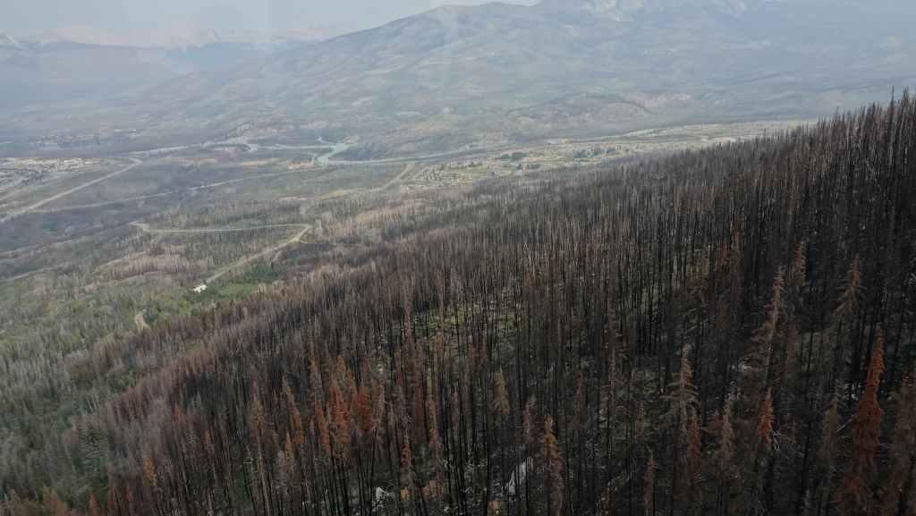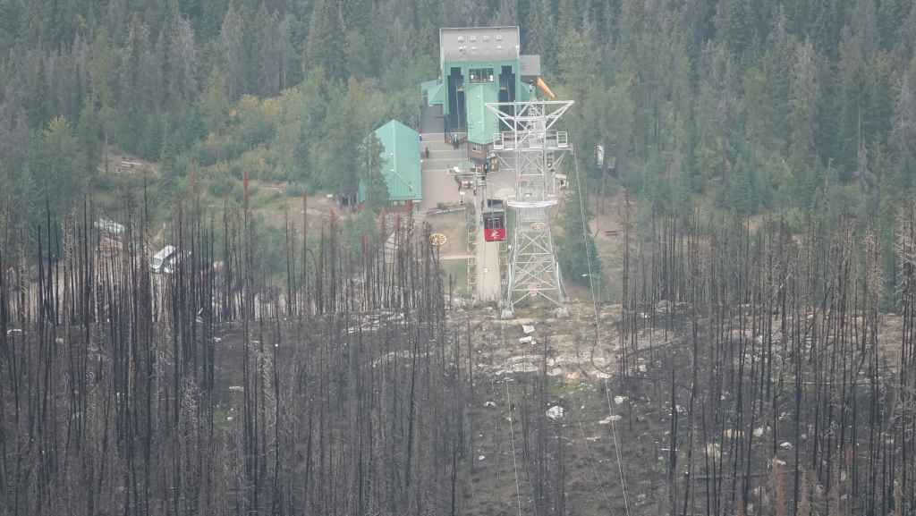On déjeune sur un parking en contre-bas du téléphérique. En début d’après-midi, on « s’envole » vers les hauteurs de Jasper. On est loin de la modernité d’une cabine de l’Aiguille du Midi ! Au fur et à mesure de la montée, on se rend compte de l’ampleur des incendies… c’est énorme ! De nombreux immeubles et maisons ont brulés. Ci-dessous, l’étendue des dégâts :