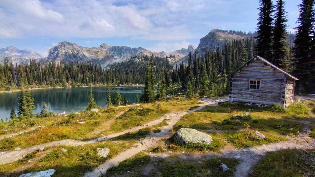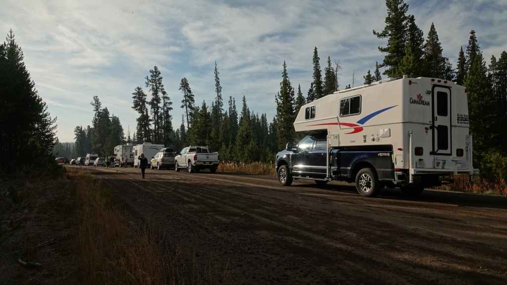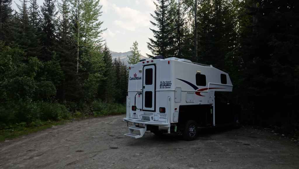 Puis nous reprenons la route 99 sur 65 km afin de rejoindre le parking pour la randonnée du lendemain. On quitte le goudron pour emprunter une piste un peu limite pour notre gros truckcamper, qui n’est pas un modèle de délicatesse ! Mais on arrive tant bien que mal à gravir le chemin un peu trop étroit et caillouteux et à faire demi-tour sur le parking encore un peu encombré… Une fois garés, on se balade un peu pour reconnaître le début du sentier qui nous emmènera au lac Rohr demain.