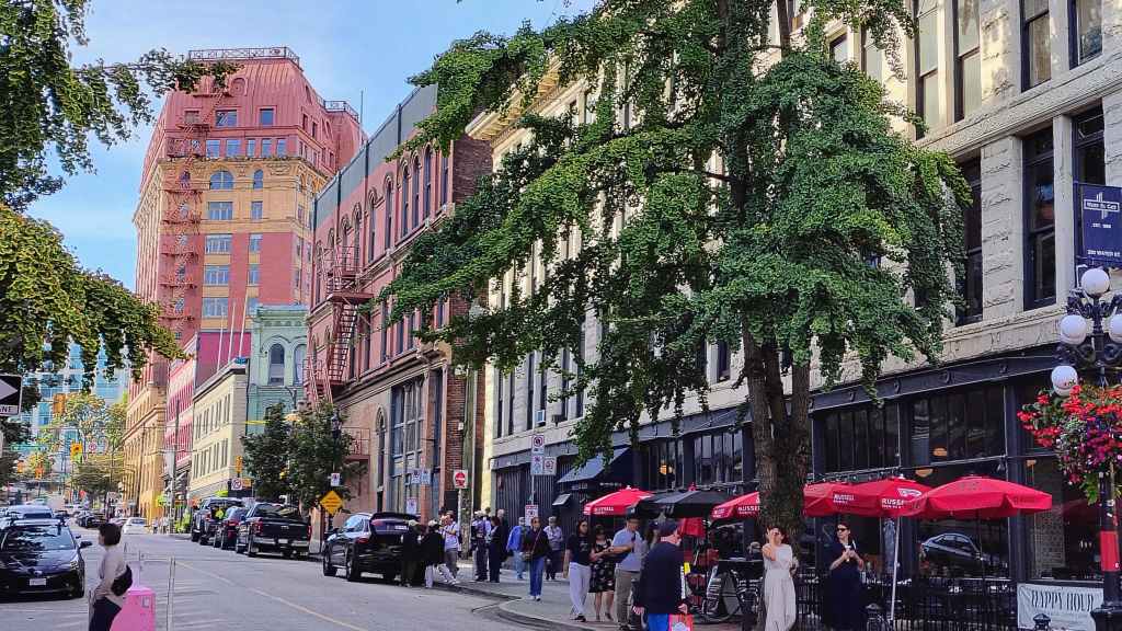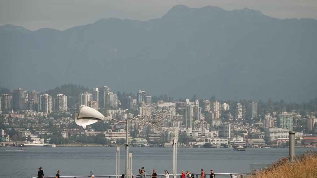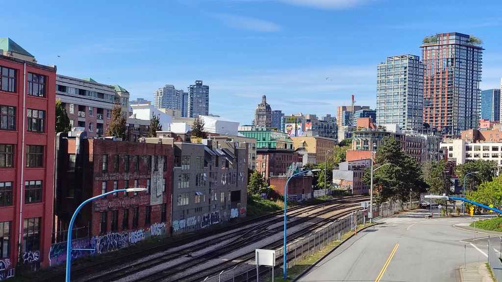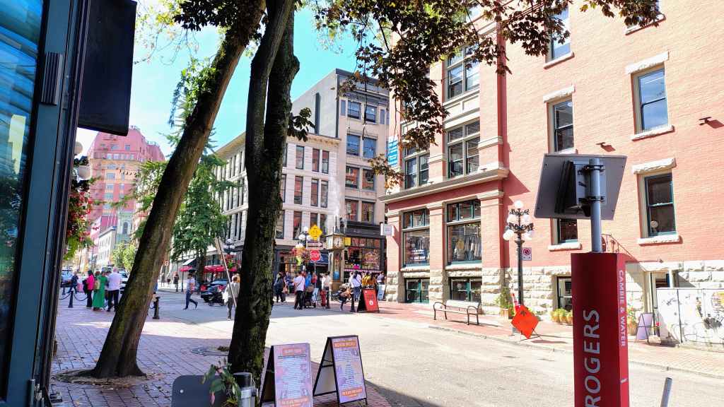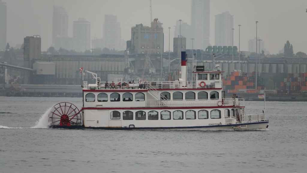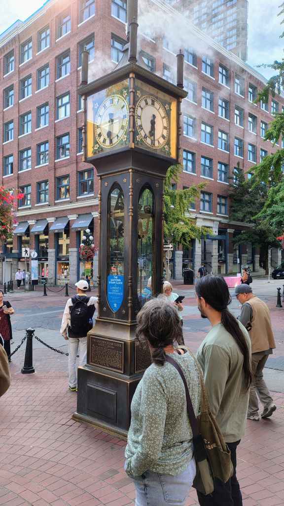 Nous arrivons à l’heure chez Canadream. Tout se passe pour le mieux et la dame de l’accueille accepte de nous appeler un taxi. Comme notre avion décolle à 19h05, nous avons prévu de visiter la ville de Vancouver, pas les quartiers modernes aperçus la veille, mais le centre ancien et le port. Nous avions réservé en amont un lieu de consigne à bagages avec Nannybag, non loin de la station du Skytrain, le métro plus ou moins aérien de Vancouver. Après avoir déposer nos bagages, on part à la découverte de la ville, un mélange de constructions anciennes et buildings en verre. On découvre également une horloge à vapeur qui sonne le carillon de BigBen toutes les demi-heures. Cela attire beaucoup les touristes !