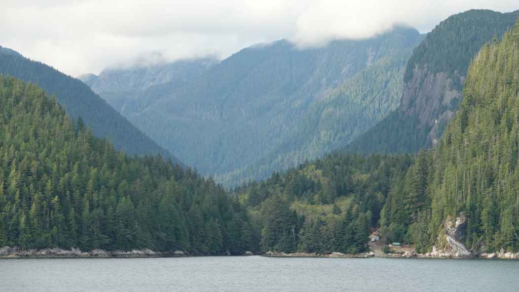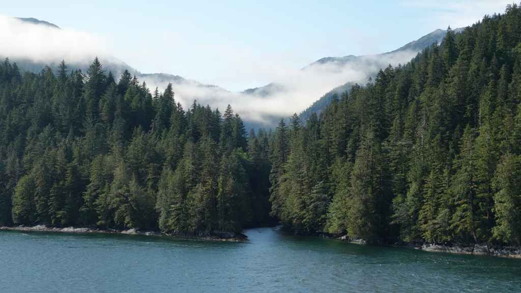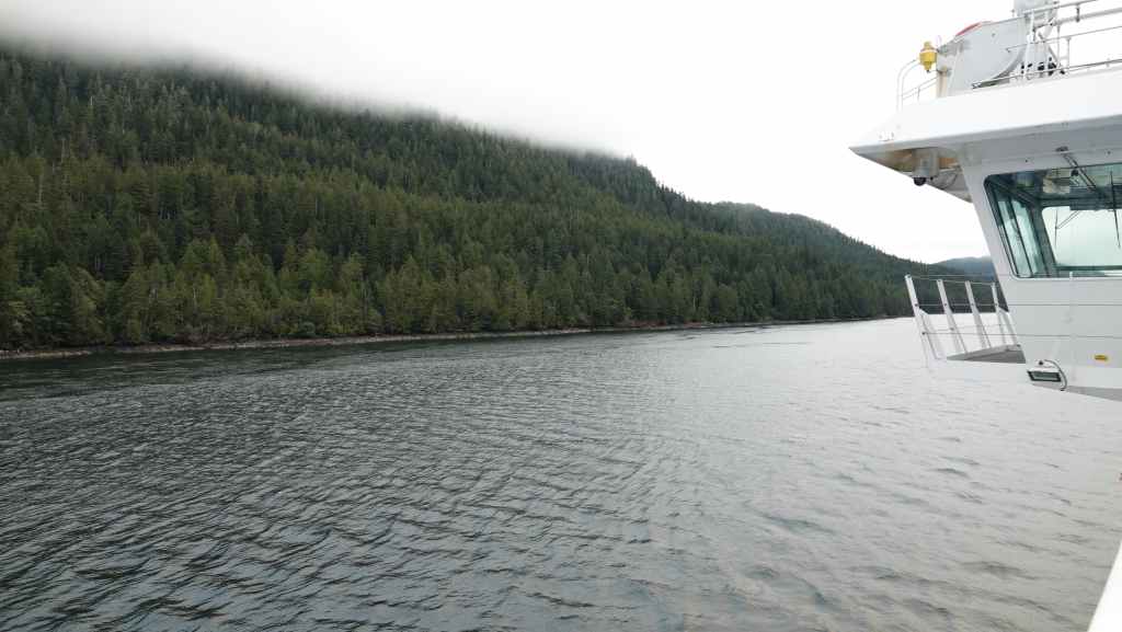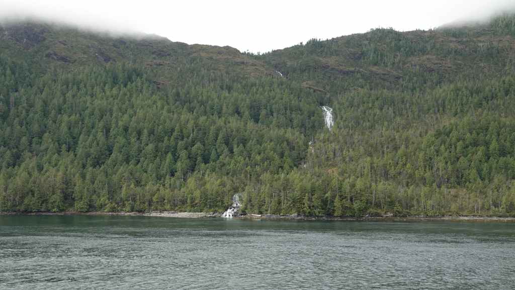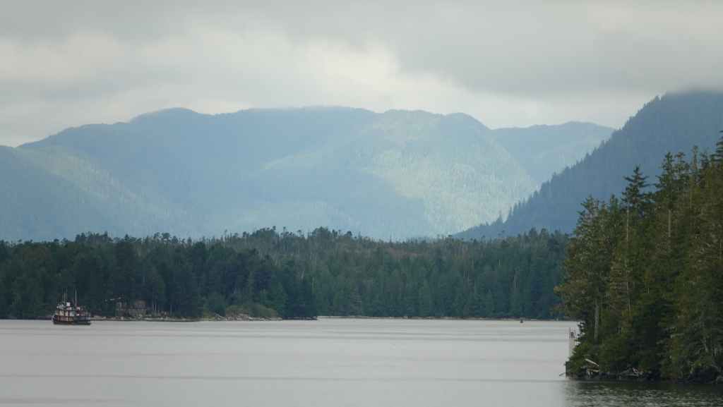 Il y a en face de Bella Bella, le village plus touristique de Chearwater sur l’île Denny Island. Vers midi, nous rentrons déjeuner dans notre Truckcamper sur le parking du supermarché où l’on est plus tranquilles mais le terrain est aussi plus pentu. On aperçoit un gros paquebot qui descend vers Vancouver.
