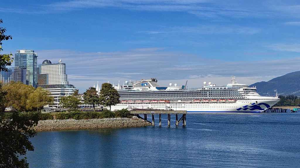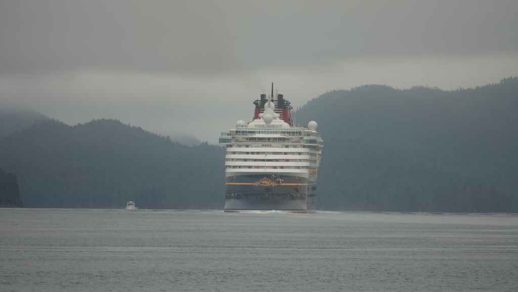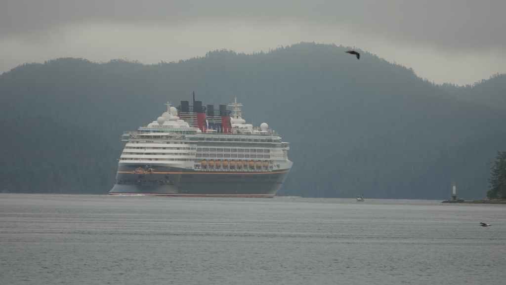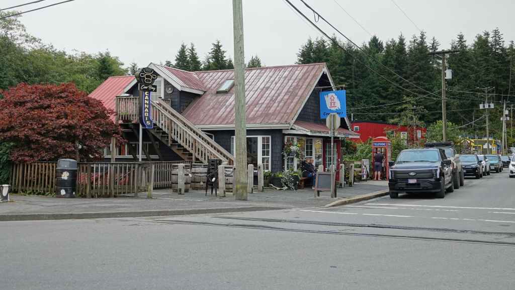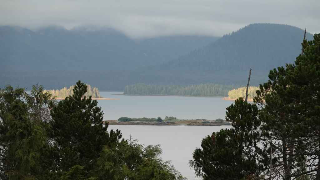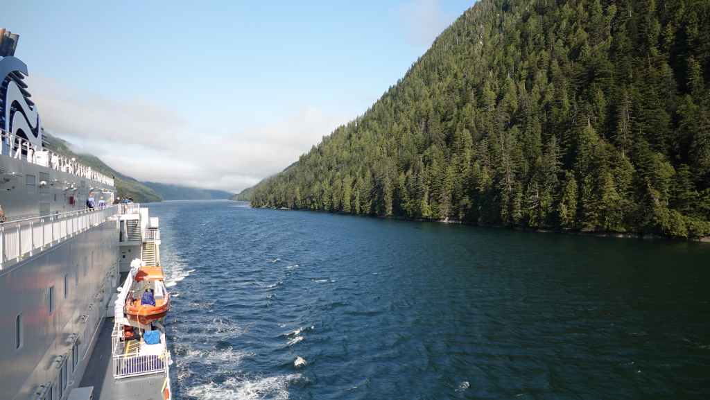 Il y a en face de Bella Bella, le village plus touristique de Chearwater sur l’île Denny Island. Vers midi, nous rentrons déjeuner dans notre Truckcamper sur le parking du supermarché où l’on est plus tranquilles mais le terrain est aussi plus pentu. On aperçoit un gros paquebot qui descend vers Vancouver.