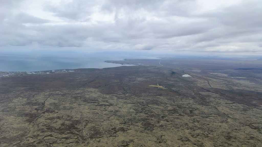 Après une nuit très moyenne et un réveil très matinal à 3h00, nous rejoignons le parking « Holidays Süd » où nous prenons une navette pour le Terminal 2. Il y en a toute les 30 mn. Formalités, enregistrement des bagages, contrôles… et nous décollons à 7h05. On a prévu nos repas à l’avance en sachant qu’aucun repas ou collation n’était servi chez Icelandair. Après environ 3h30 de vol, nous attérrissons à l’aéroport de Keflavik en Islande à 8h40 pour redécoller à 10h15.