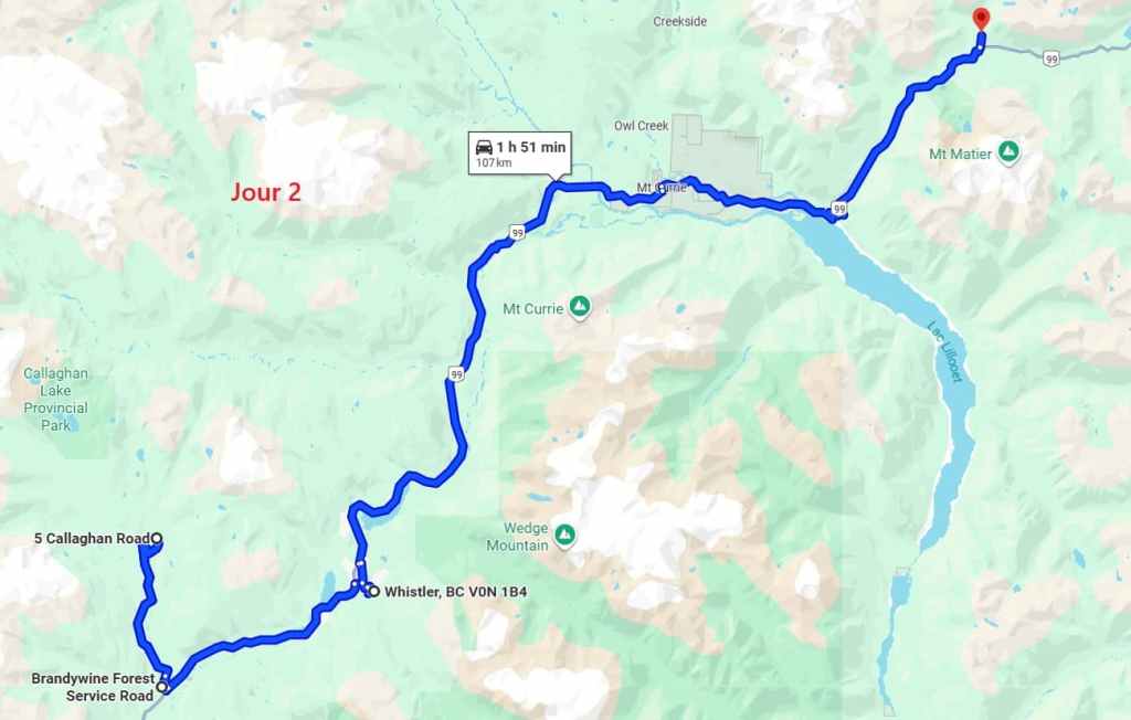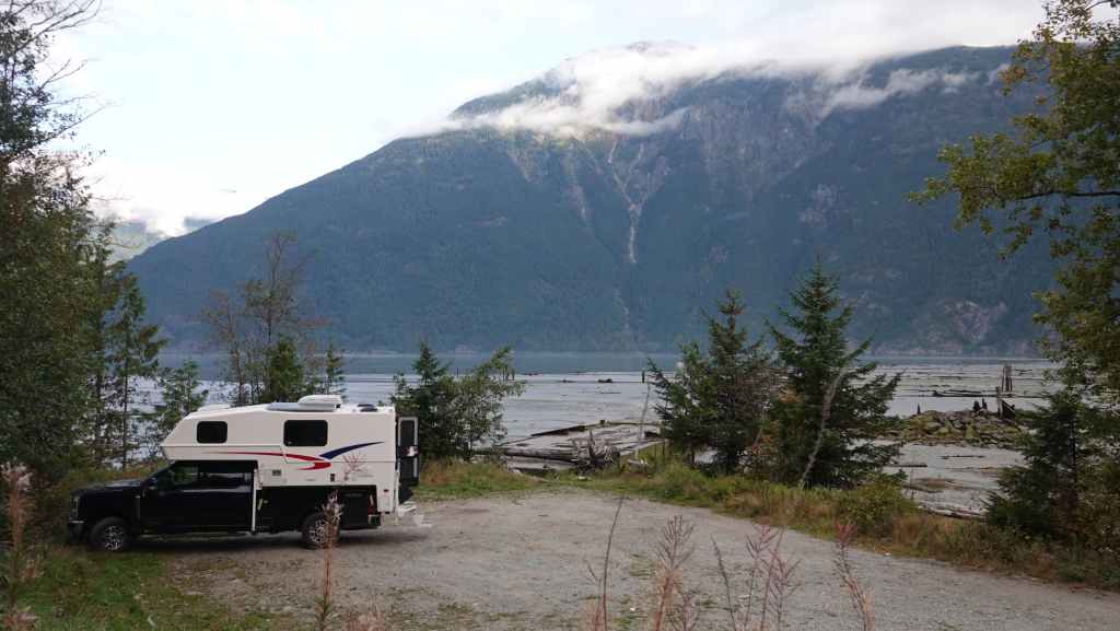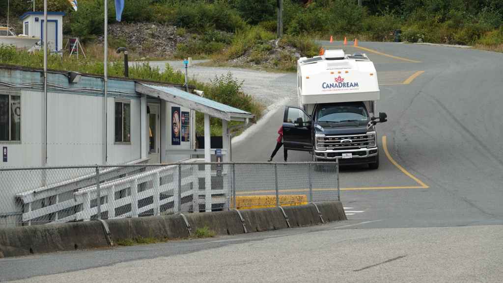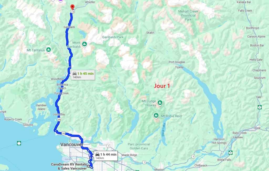 Ensuite, nous partons vers le nord et il faut donc traverser la ville de Vancouver et bien que l’on soit samedi, c’est compliqué : bouchons et ralentissements. Enfin, on sort de la métropole pour longer la côte pacifique. La météo est plutôt clémente. On s’arrête pour remplir le frigo à un supermarché de Squamish. Ensuite on continue sur environ 45 km pour rejoindre un grand parking gravillonné à une vingtaine de kilomètres de Whistler. On se pose ici pour la nuit : il est temps car nous sommes épuisés après 24 heures sans dormir. Du coup, la soirée est courte : repas et dodo !