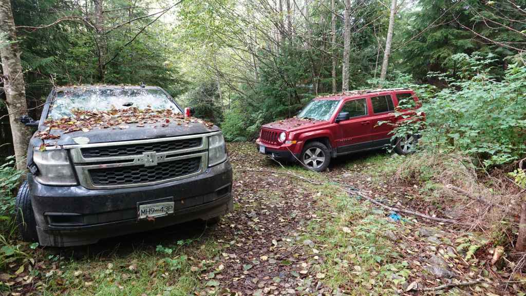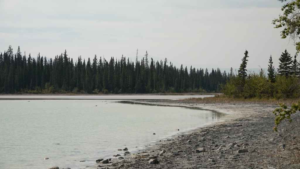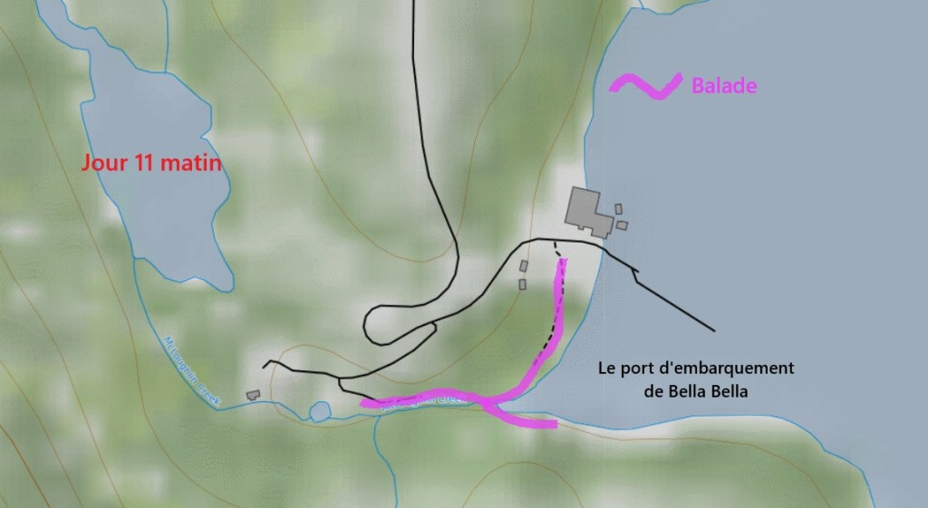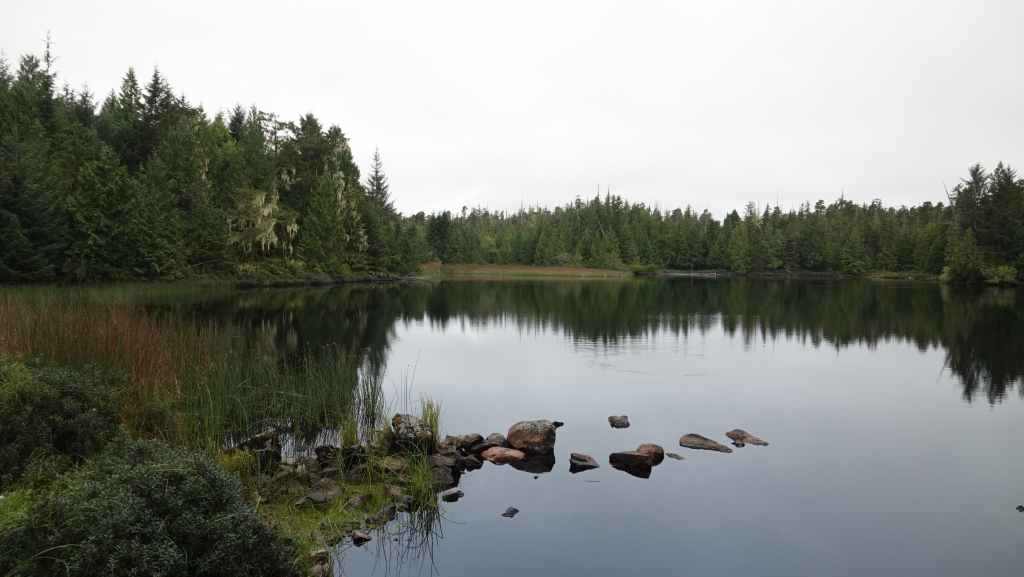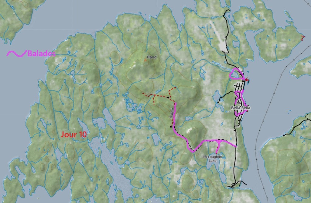 L’après-midi, nous faisons une petite randonnée en aller-retour vers le centre de l’île. Celle-ci ne présente que très peu d’intérêts, à part des véhicules abandonnés en forêt, et malgré un détour par le lac McLaughling. On reprend le véhicule pour aller passer la nuit sur une des plateformes en cailloux située entre le village et le port, non loin d’un point de contrôle d’un genre de police des frontières !!! À quoi sert-il ? Probablement à donner des emplois aux amérindiens… Et toute la soirée, on aura une circulation de voitures assez intenses au vu du nombre d’habitants. On verra le lendemain que ces automobilistes font un aller/retour au port sans s’arrêter et retournent au village !