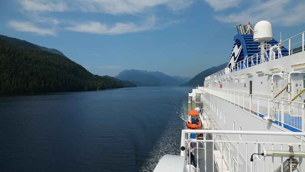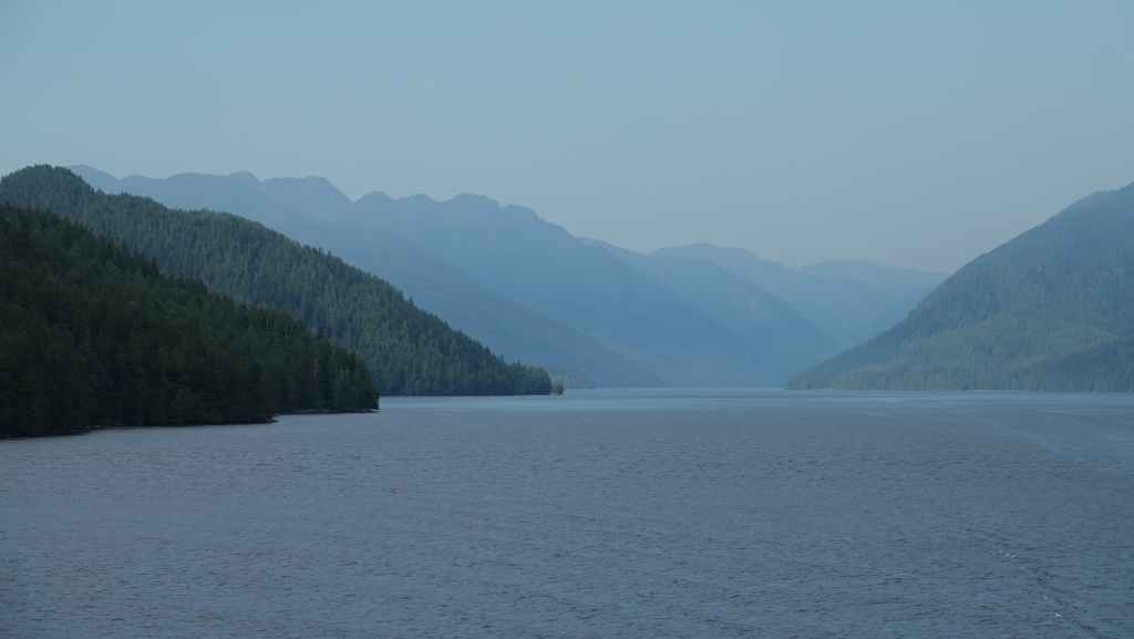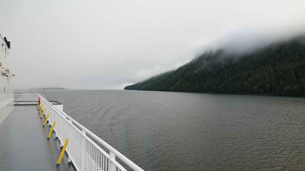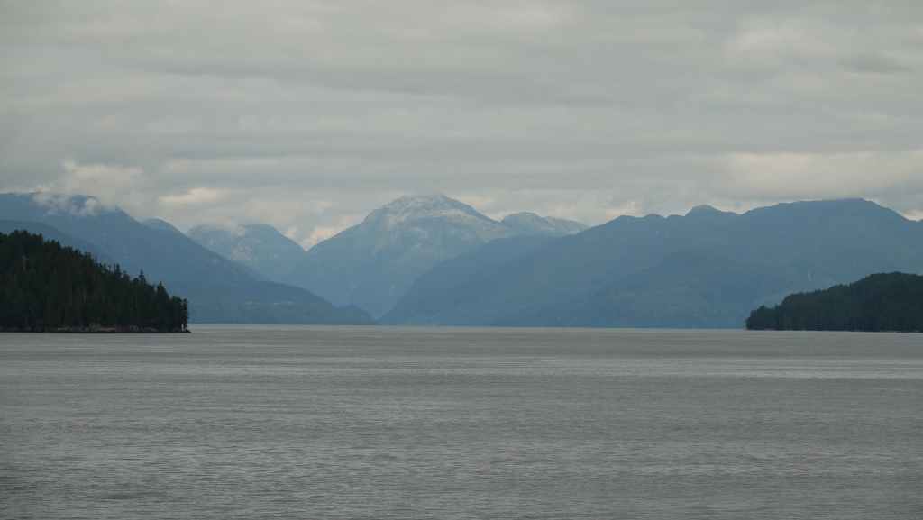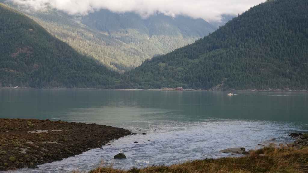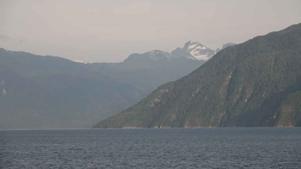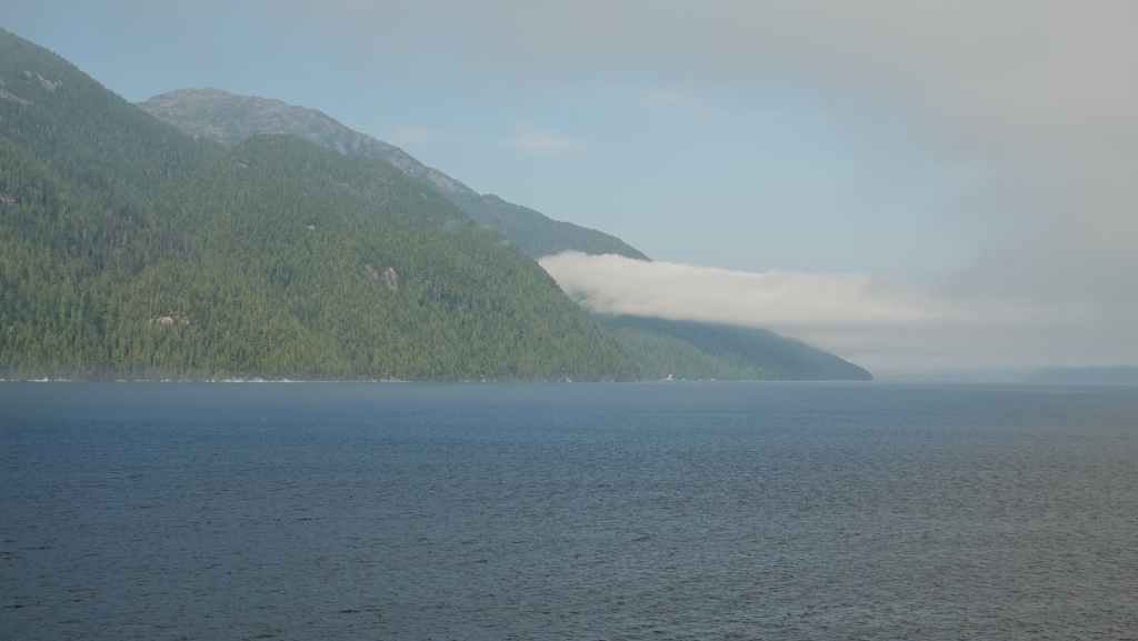 On déjeune sur le parking en attendant le ferry qui arrive à l’heure prévue. On embarque et cette nouvelle traversée nous conduit jusqu’à Bella Coola en 5h10 de navigation. Le ciel gris au début se découvre au fur et à mesure que l’on rejoint le continent…