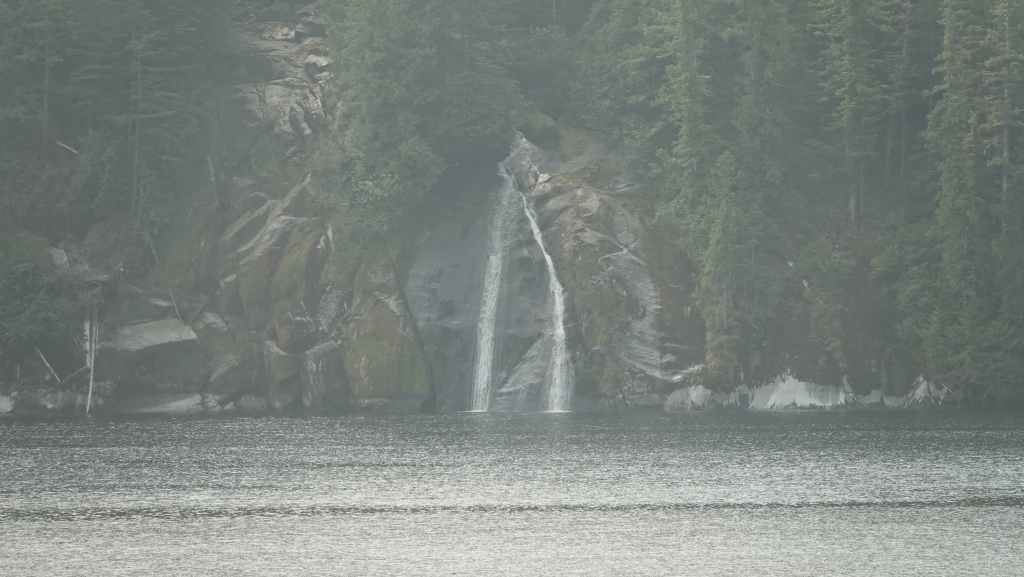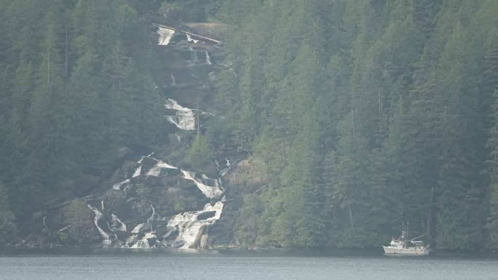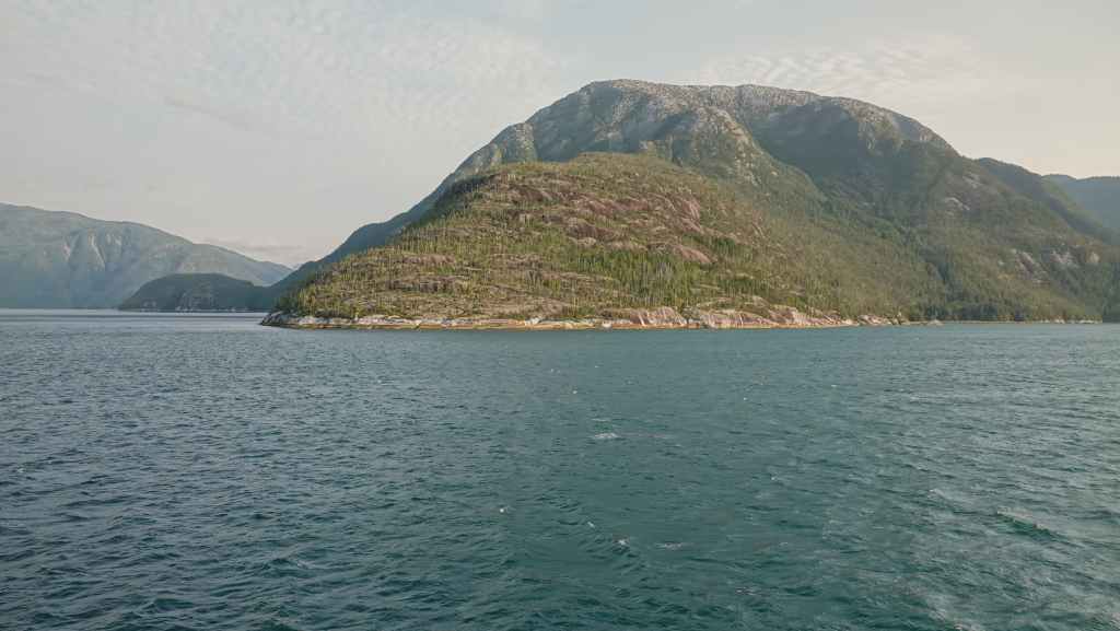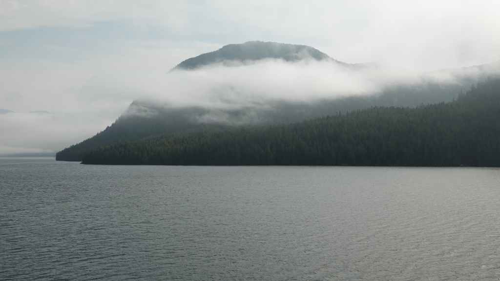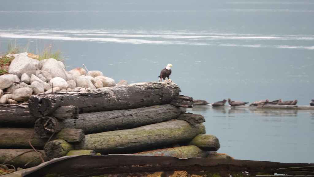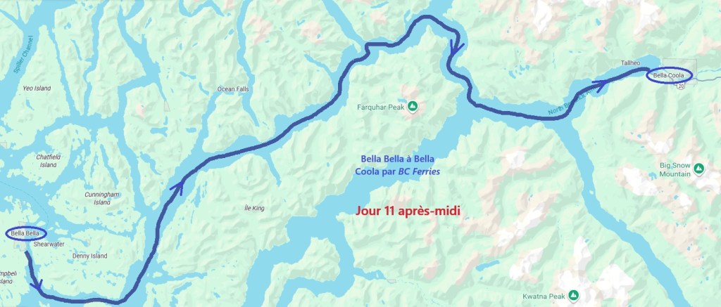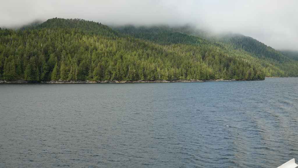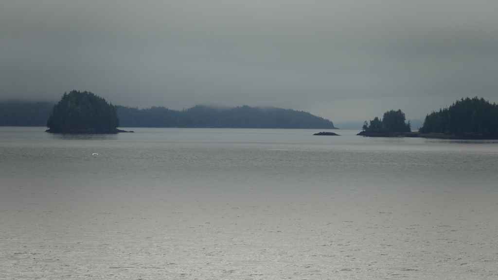On déjeune sur le parking en attendant le ferry qui arrive à l’heure prévue. On embarque et cette nouvelle traversée nous conduit jusqu’à Bella Coola en 5h10 de navigation. Le ciel gris au début se découvre au fur et à mesure que l’on rejoint le continent…