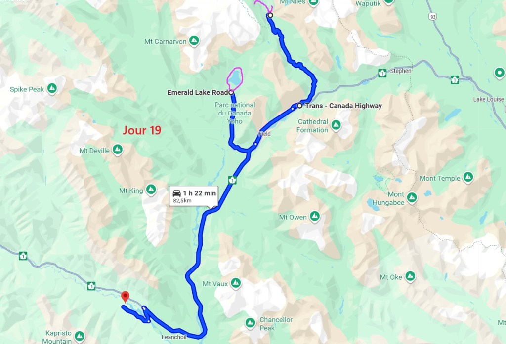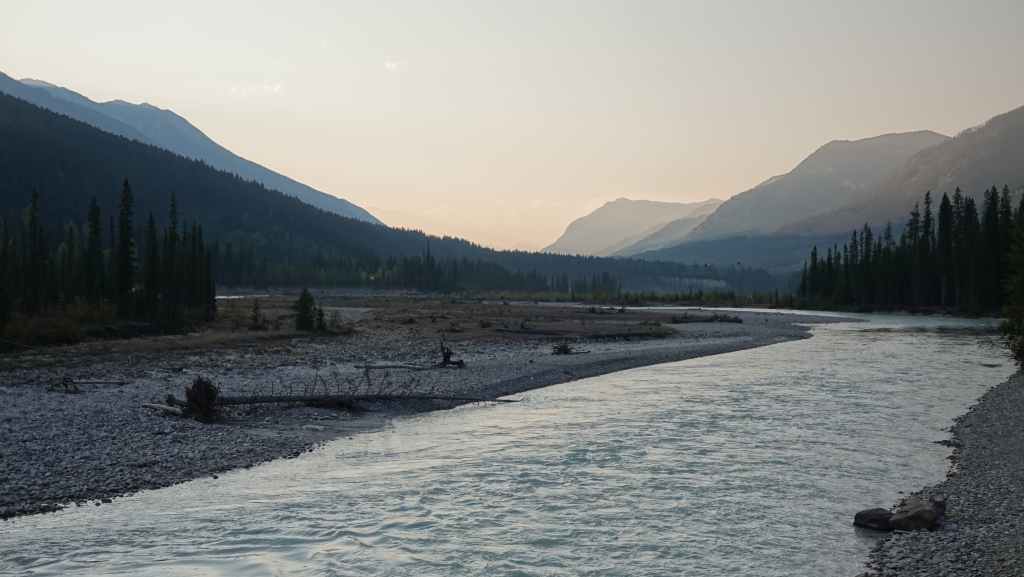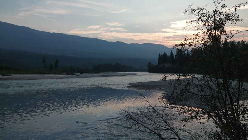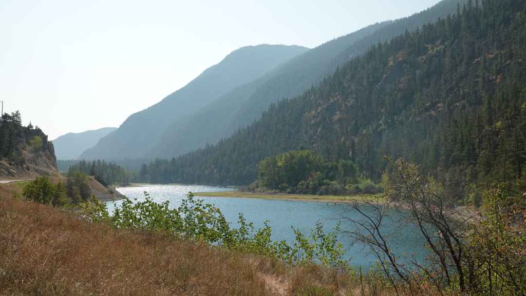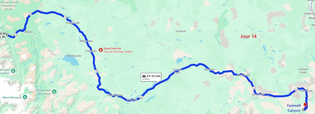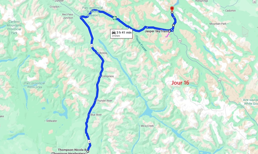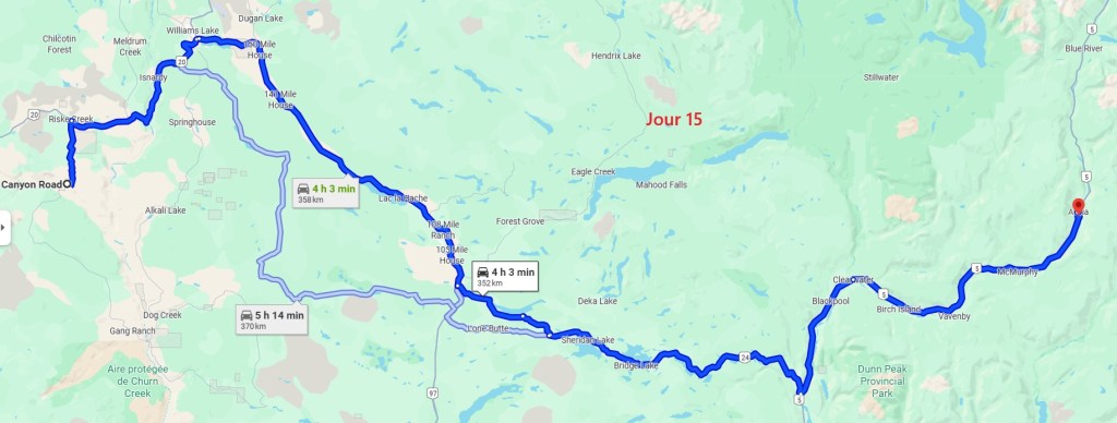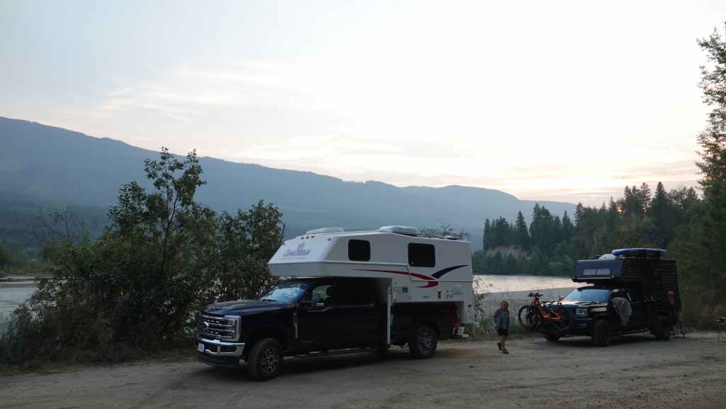 Après cette magnifique balade, on reprend notre truckcamper et la piste d’une vingtaine de kilomètres. On reprend la route 20 pour rejoindre la 97 à Williams Lake et redescendons 100 Miles House. On y fait quelques courses et nos vidanges d’eaux sales. On continue encore un peu vers le sud avant de bifurquer vers l’est par la route 24 jusqu’à Little Fort. Puis nous empruntons la route n°5 en passant par Clearwater. Avec l’appli Ioverlander, on trouve un lieu de bivouac au bord la rivière North Thomson mais aussi pas loin d’une ligne de chemin de fer. Deux VR sont déjà garés ici et on s’incruste entre les deux, dont un couple de québécois. Ca fait plaisir de parler français ! Ils sont partis pour 2 mois et ont traversé tout le Canada jusqu’aux Rocheuses et sont sur le point de faire demi-tour… Nous aurons le « plaisir » d’entendre pour la première fois le vacarme des très longs trains et de leurs klaxons, et ce n’est que le début !