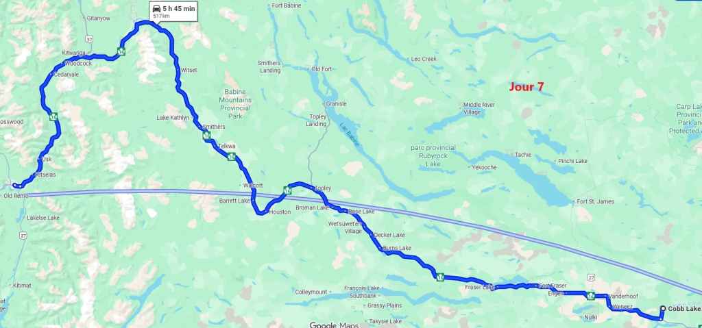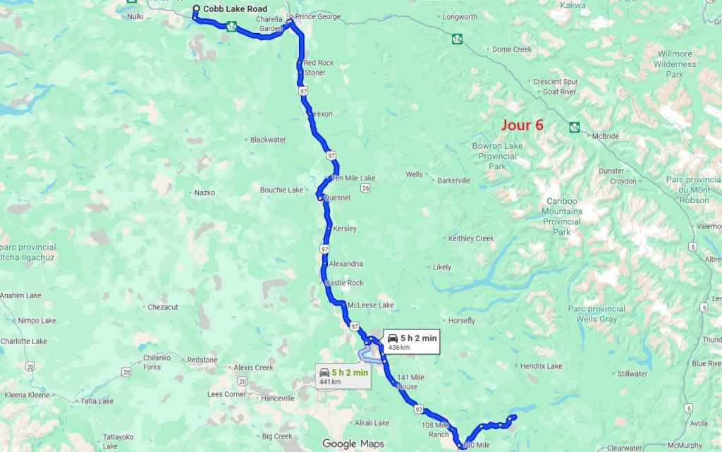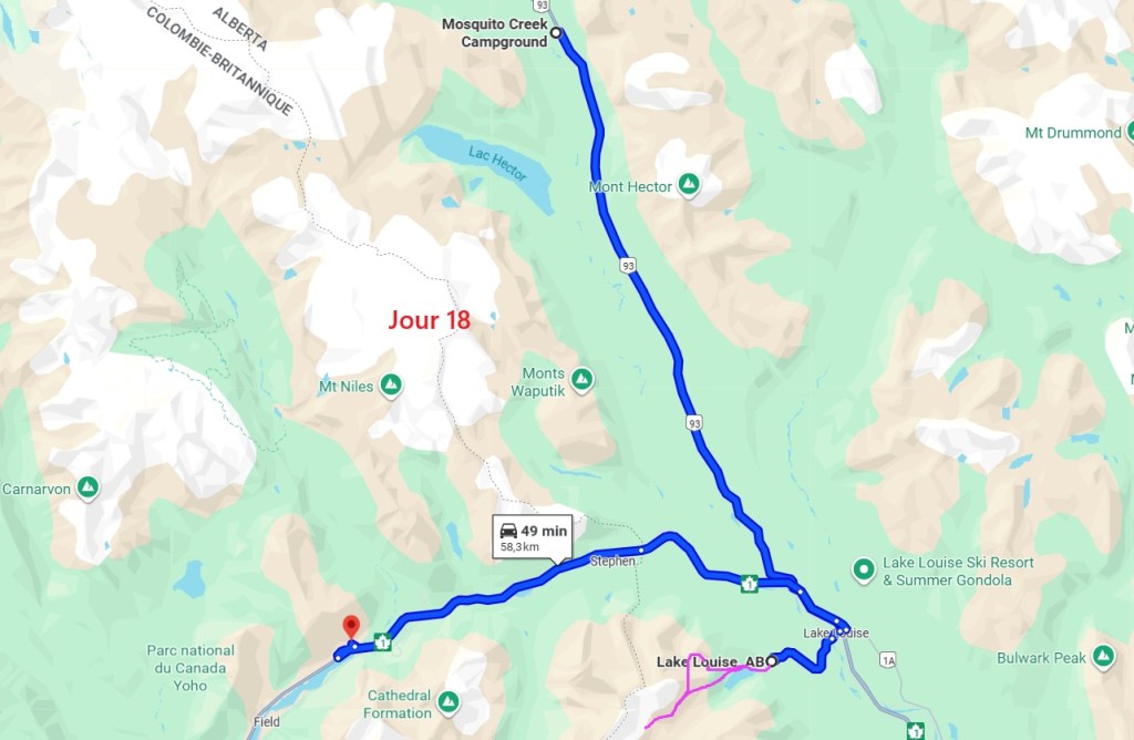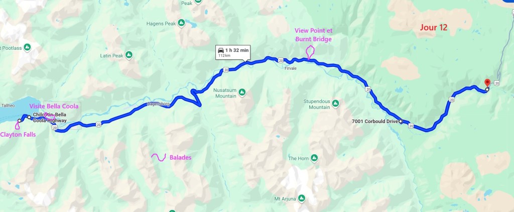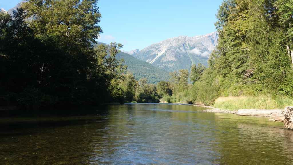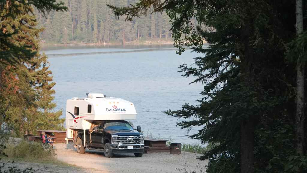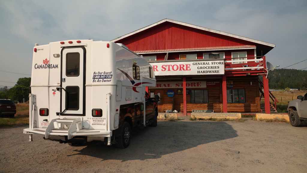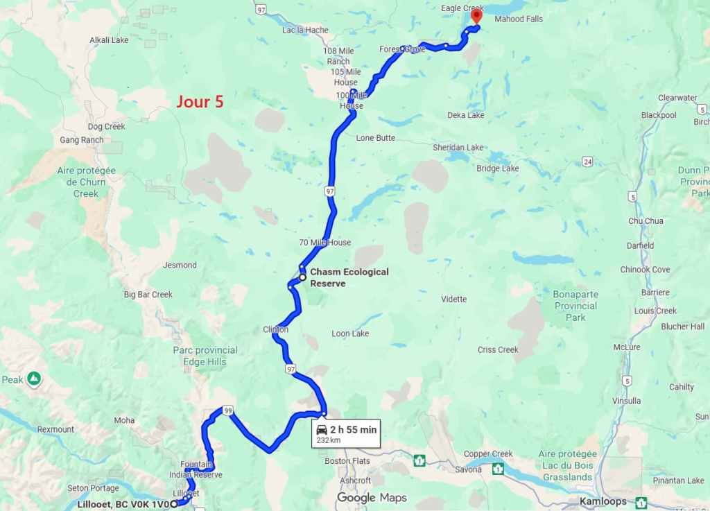 Après cette magnifique balade, on reprend notre truckcamper et la piste d’une vingtaine de kilomètres. On reprend la route 20 pour rejoindre la 97 à Williams Lake et redescendons 100 Miles House. On y fait quelques courses et nos vidanges d’eaux sales. On continue encore un peu vers le sud avant de bifurquer vers l’est par la route 24 jusqu’à Little Fort. Puis nous empruntons la route n°5 en passant par Clearwater. Avec l’appli Ioverlander, on trouve un lieu de bivouac au bord la rivière North Thomson mais aussi pas loin d’une ligne de chemin de fer. Deux VR sont déjà garés ici et on s’incruste entre les deux, dont un couple de québécois. Ca fait plaisir de parler français ! Ils sont partis pour 2 mois et ont traversé tout le Canada jusqu’aux Rocheuses et sont sur le point de faire demi-tour… Nous aurons le « plaisir » d’entendre pour la première fois le vacarme des très longs trains et de leurs klaxons, et ce n’est que le début !
