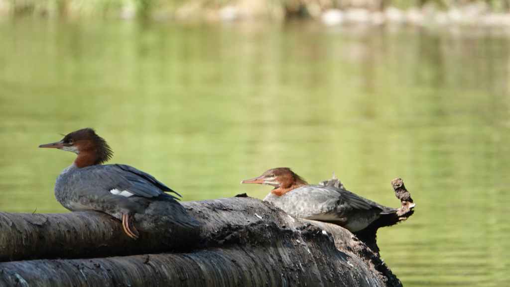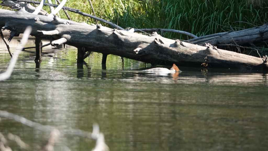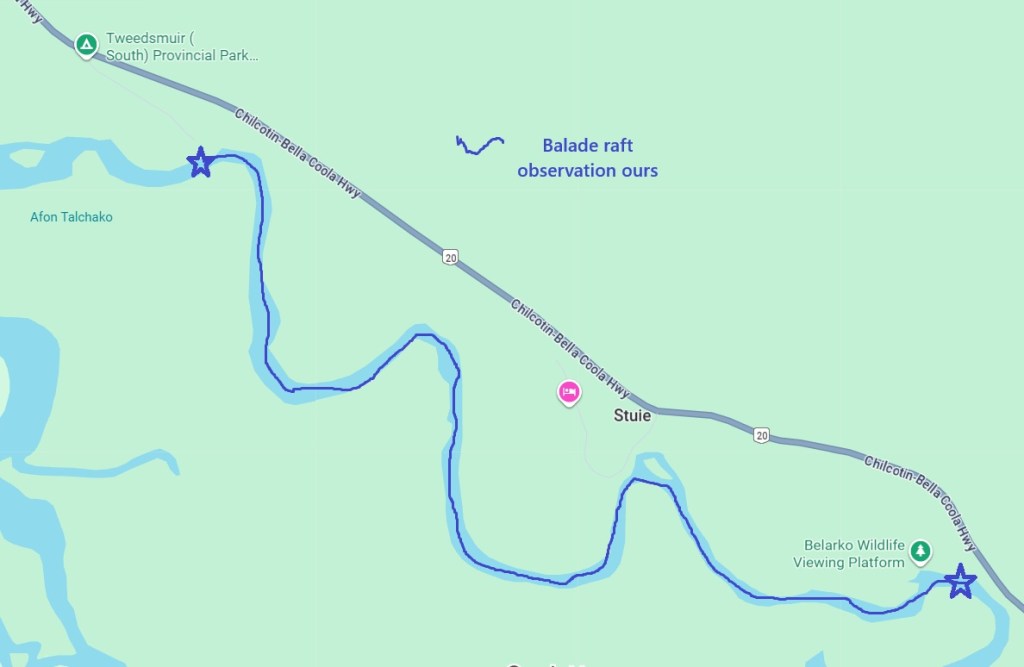 On part directement vers notre lieu de RDV. Nous sommes 4 + le guide. Les autres clients sont des New Yorkais… Un minibus nous emmène près du Belarko Wildlife Viewing Platform (plateforme d’observation) où nous attend notre raft. La météo est excellente et nous voilà partis sur l’Atnarko River… Après quelques minutes, notre guide aperçoit au loin un ours que nous avons bien du mal à repérer, mais lorsque c’est le cas, l’ours (probablement un grizzly) a déjà fuit ! C’est très furtif… et ce sera le seul ours de la descente, ce qui est très frustrant. Mais bon, les ours ne sont pas domestiqués ! De plus, tout au long de la matinée, l’amérlocaine et le guide auront parlé fort, ce qui n’a pas été très agréable ni pour nous, ni pour les potentiels ursidés… Nous aurons quand même vu des empruntes, les œufs oranges de saumon et un couple harles bièvres et leurs têtes rousses.